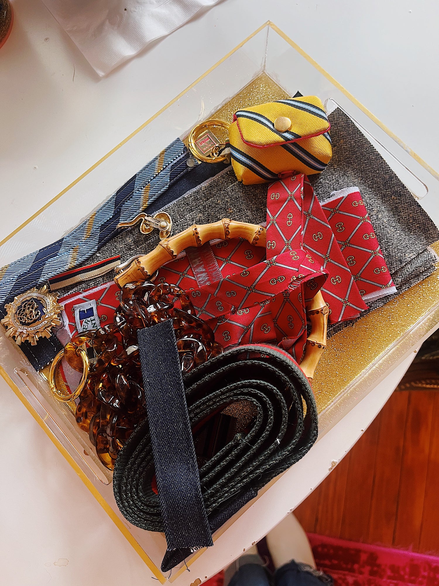 We put all the bits n’ bobs (clasps, rivets, logo tags, runaway thread . . .) in our handy - and super cute - trays all over the studio. There is truly no odd or end that a tray can’t corral, which makes this a super quick and easy way to look a smidge more organized than the smokin’ hot mess you are . . . or at least we are ;)