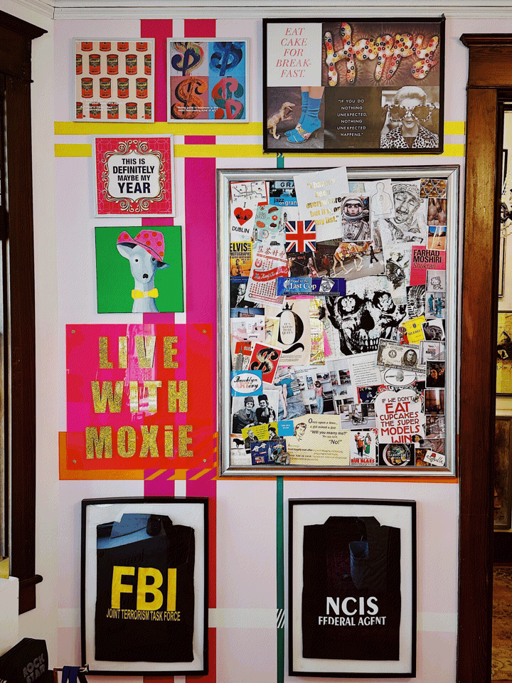 Our walls our covered with art from our favorite wall calendars, pages from coffee table books, old memorabilia, push-pin boards, and DIY pieces - even my raid jackets from my time in law enforcement are framed and hung in our studio, always reminding me of where I've come from and what I've accomplished.