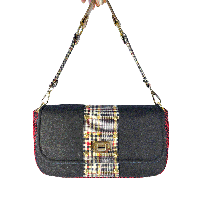 In need of a little spunk, we layered a deep red, fishnet over the entire gusset of the bag, followed by implementing a dapper, plaid print from an upcycled blazer throughout the middle of the purse and strap.