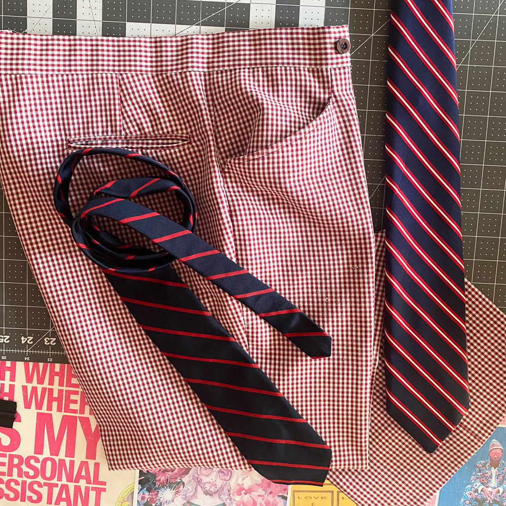 - handcrafted from deconstructed golf pants, necktie, and chain belts