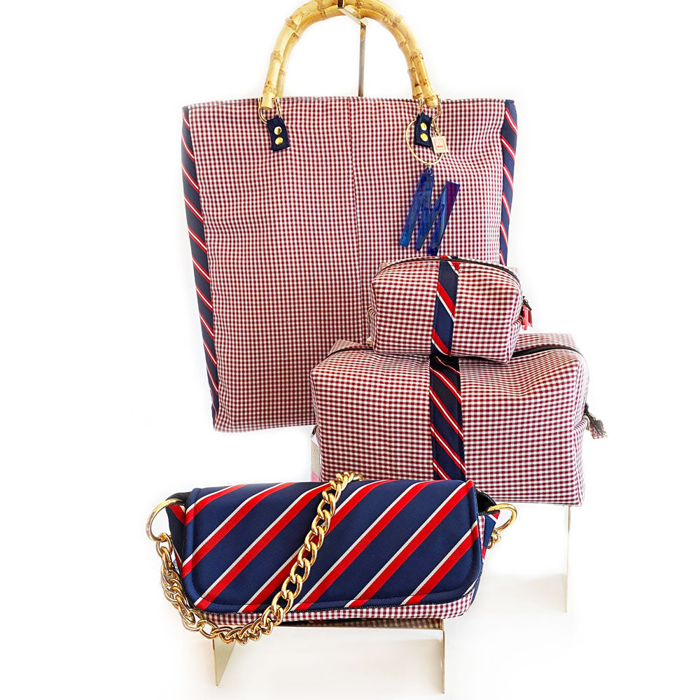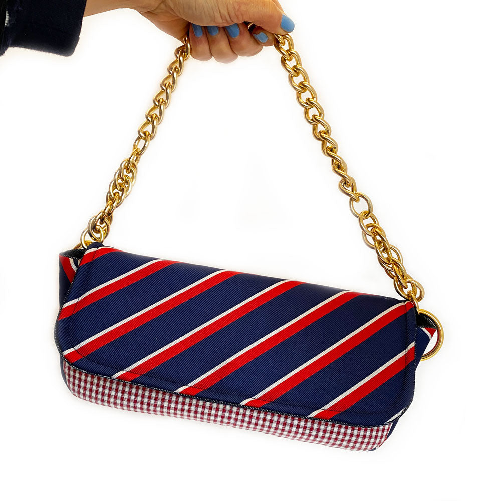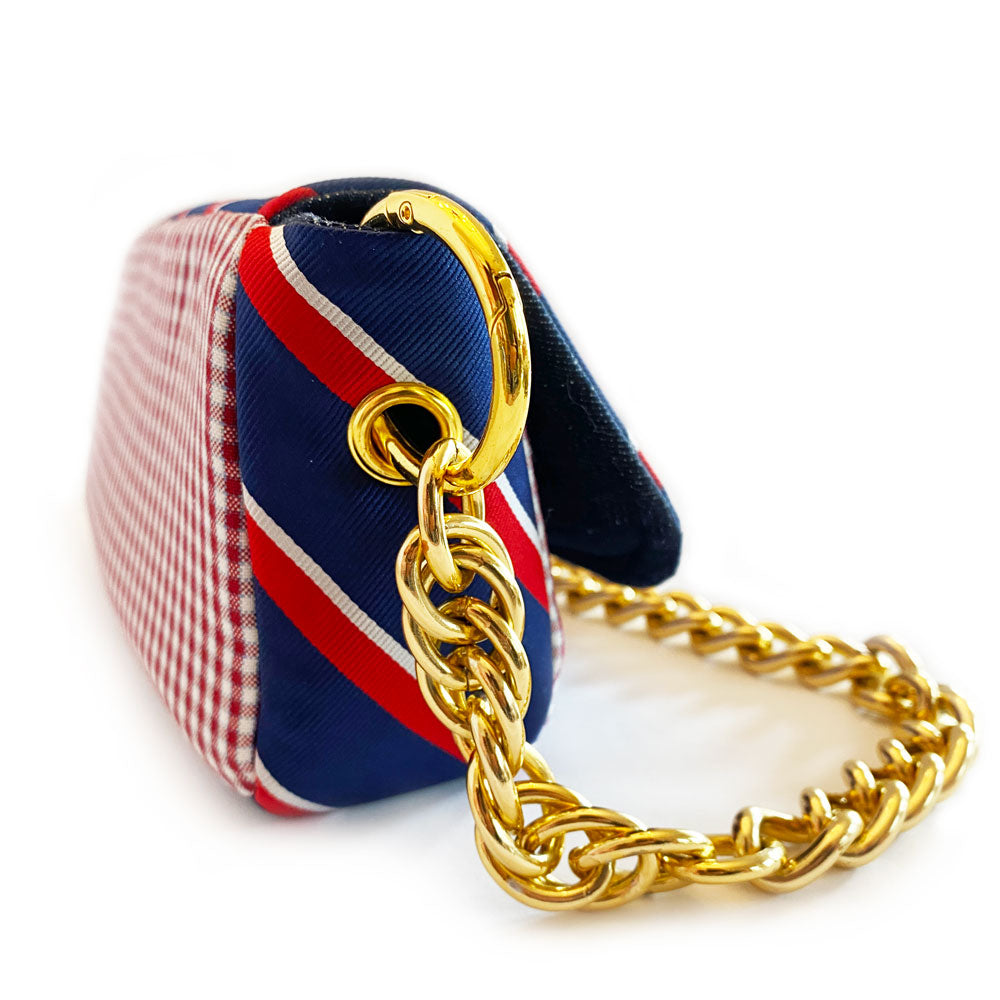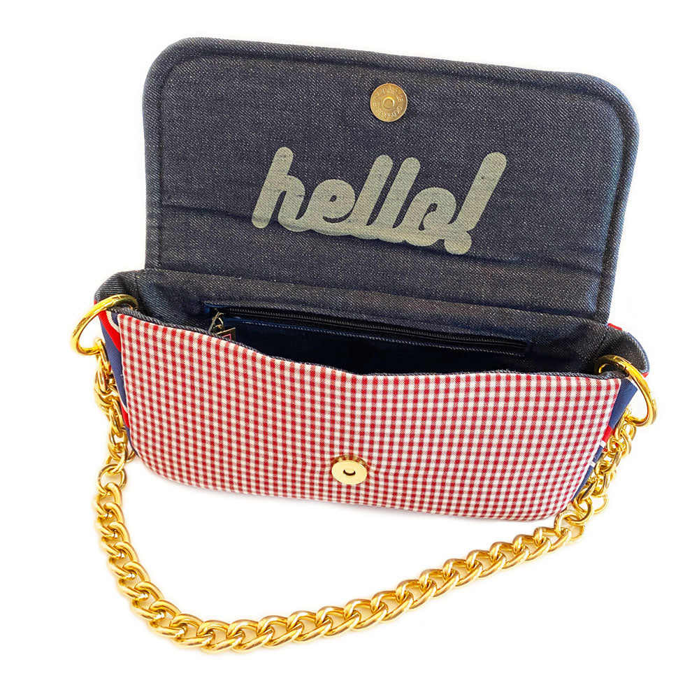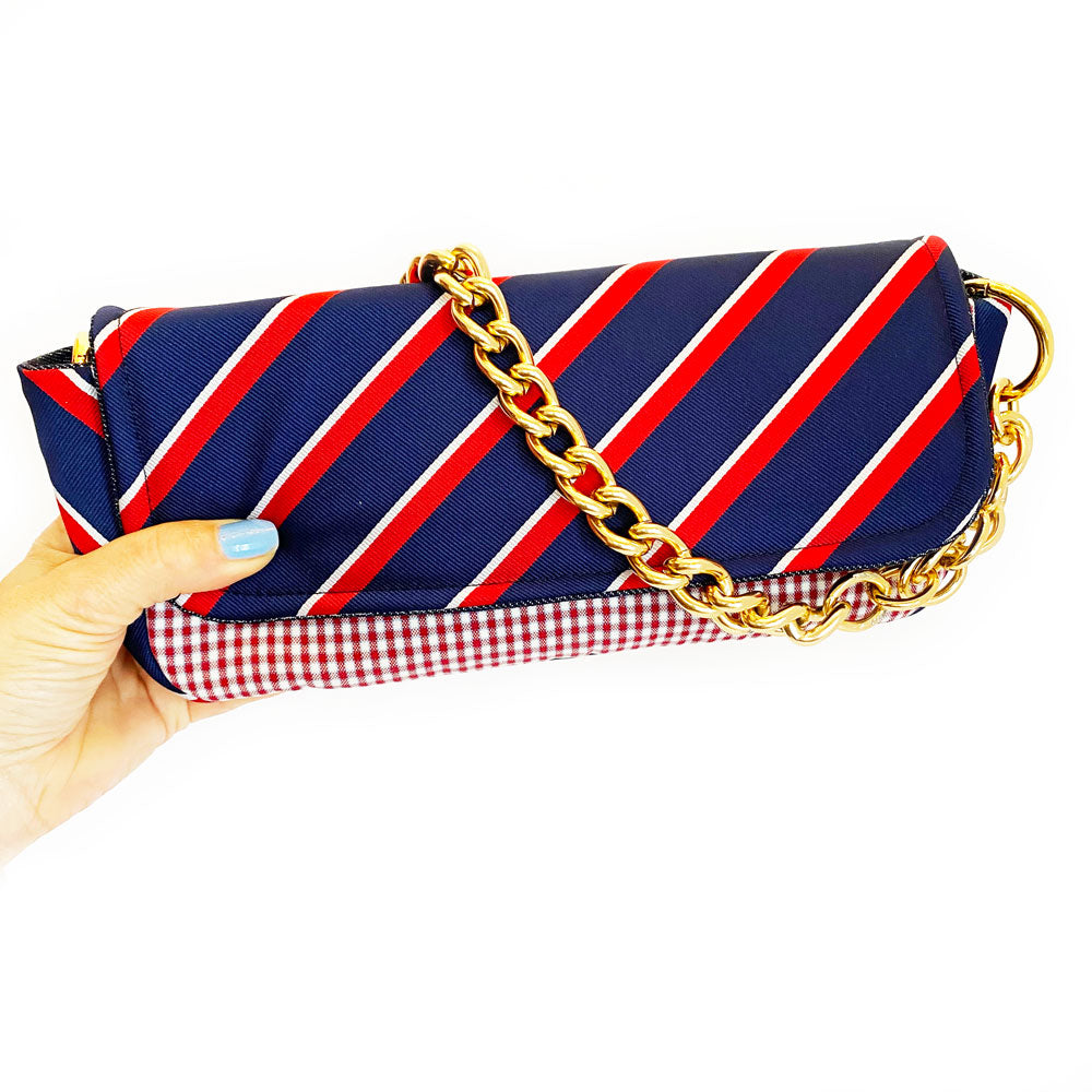 Phone, wallet, keys? Yes, please! Meet your new go-to gal pal, the Abner clutch. The perfect companion for anything from a mid-day coffee run to a night out on the town, Abner keeps all your essentials tucked away in style. Handcrafted from deconstructed golf pants and detailed with an upcycled gold chain belt and necktie, denim-lined (with a secret message) interior, and zip-up pocket, your must-haves won’t want to leave the house in anything else.