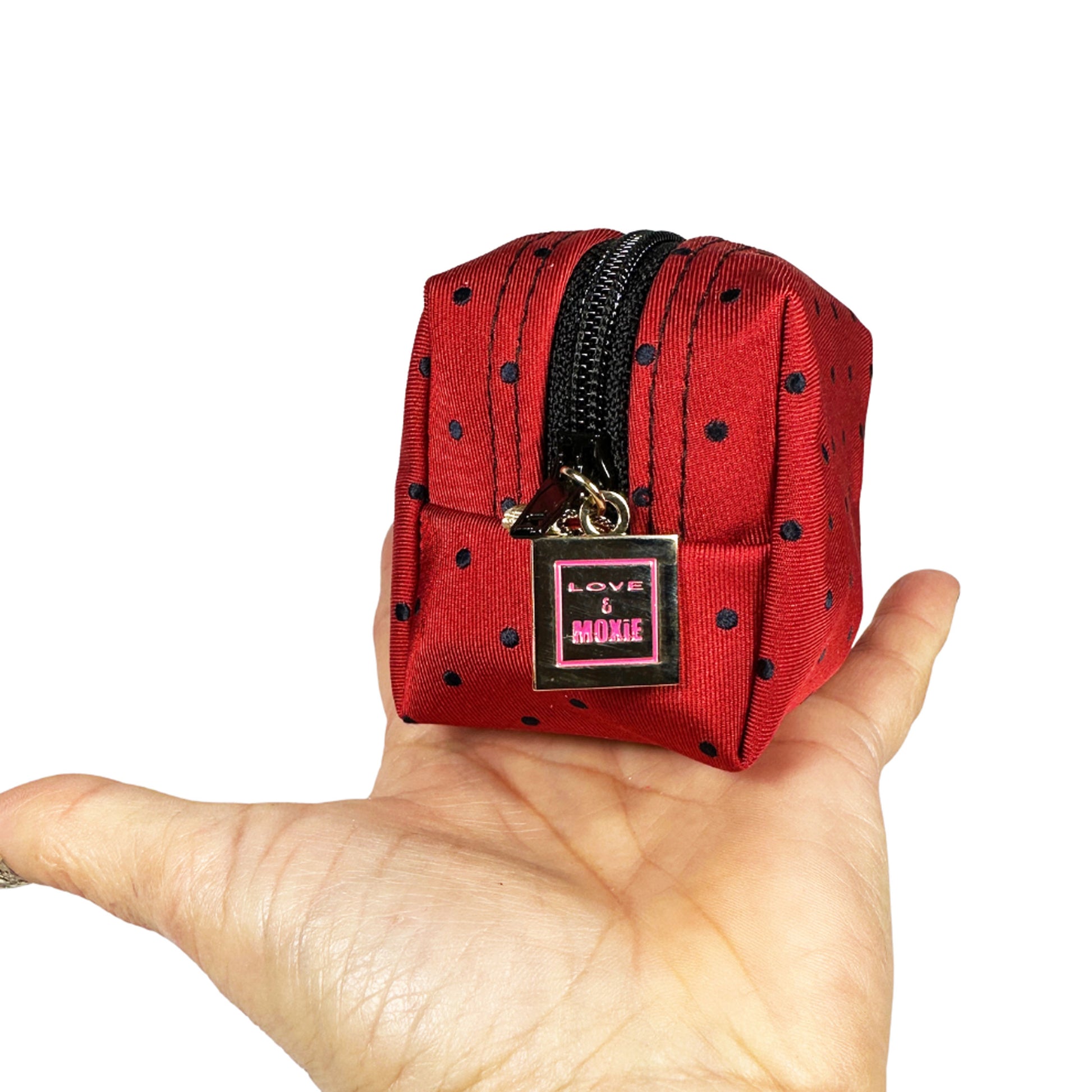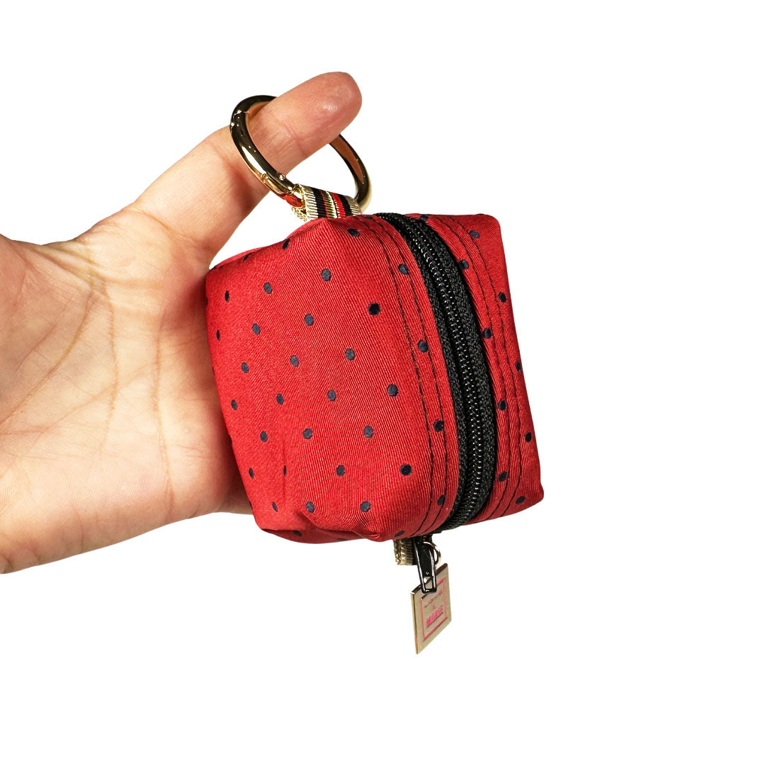 Meet cutie patootie Amanda our mini mini clip on bag that might be small but she's big in style and function. Meticulously handcrafted from a thrifted polka dot necktie and lined with navy wipe-clean waterproof canvas, Amanda is as good looking as she is functional. Her impeccable detailing from her double row top stitching, reinforced seams to her ample gold spring clip will make you scream, "yaaas!". Perfect clipped to your purse or belt loop for easy access to your hand sanitizer, doggie poop bags, contact lens paraphernalia, or anything you need to get your hands on quickly.