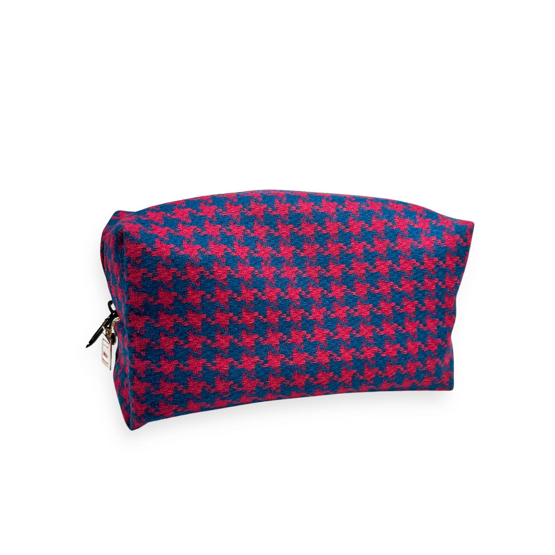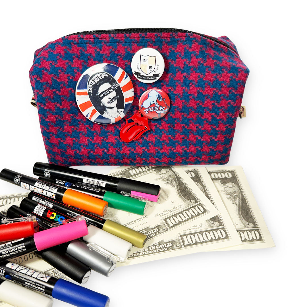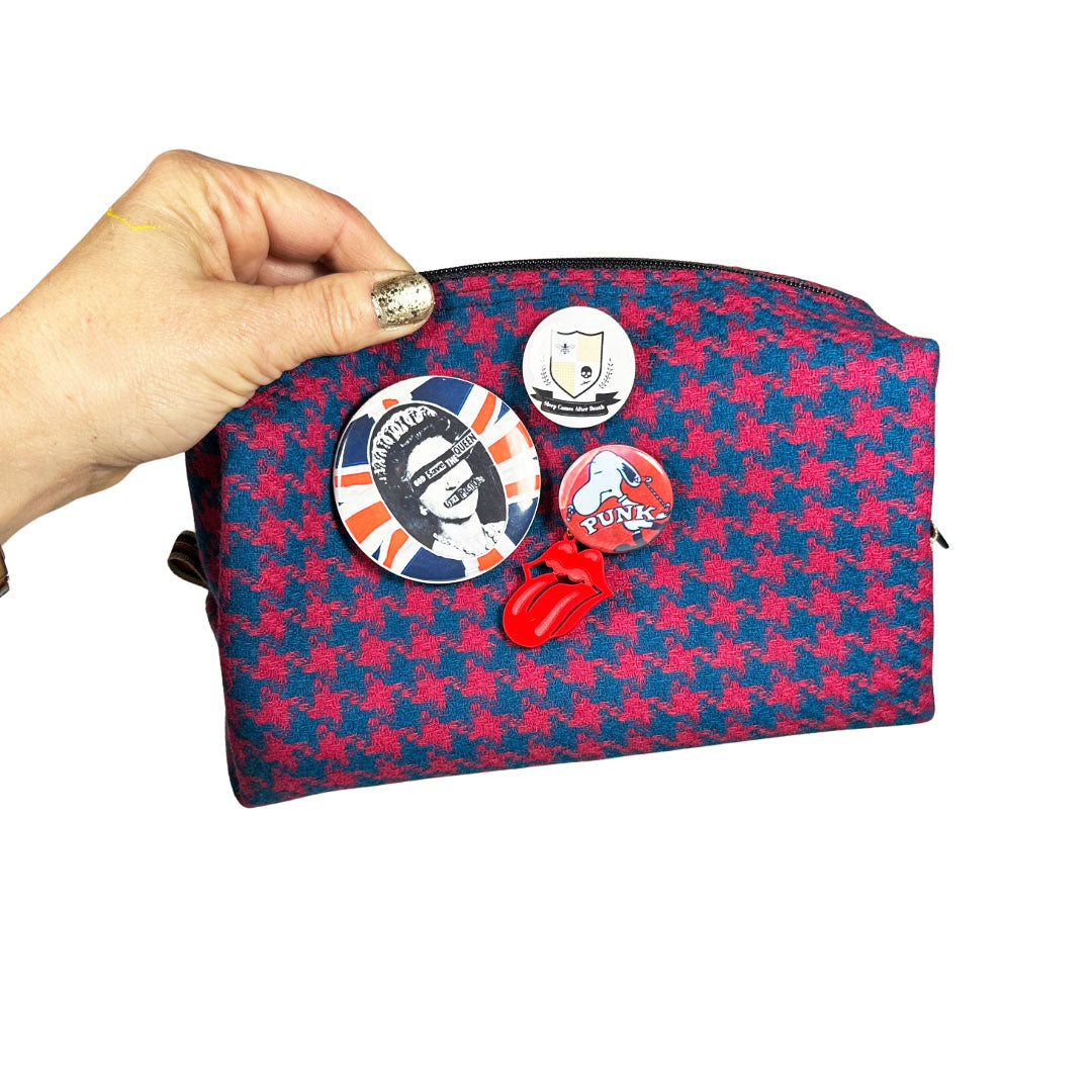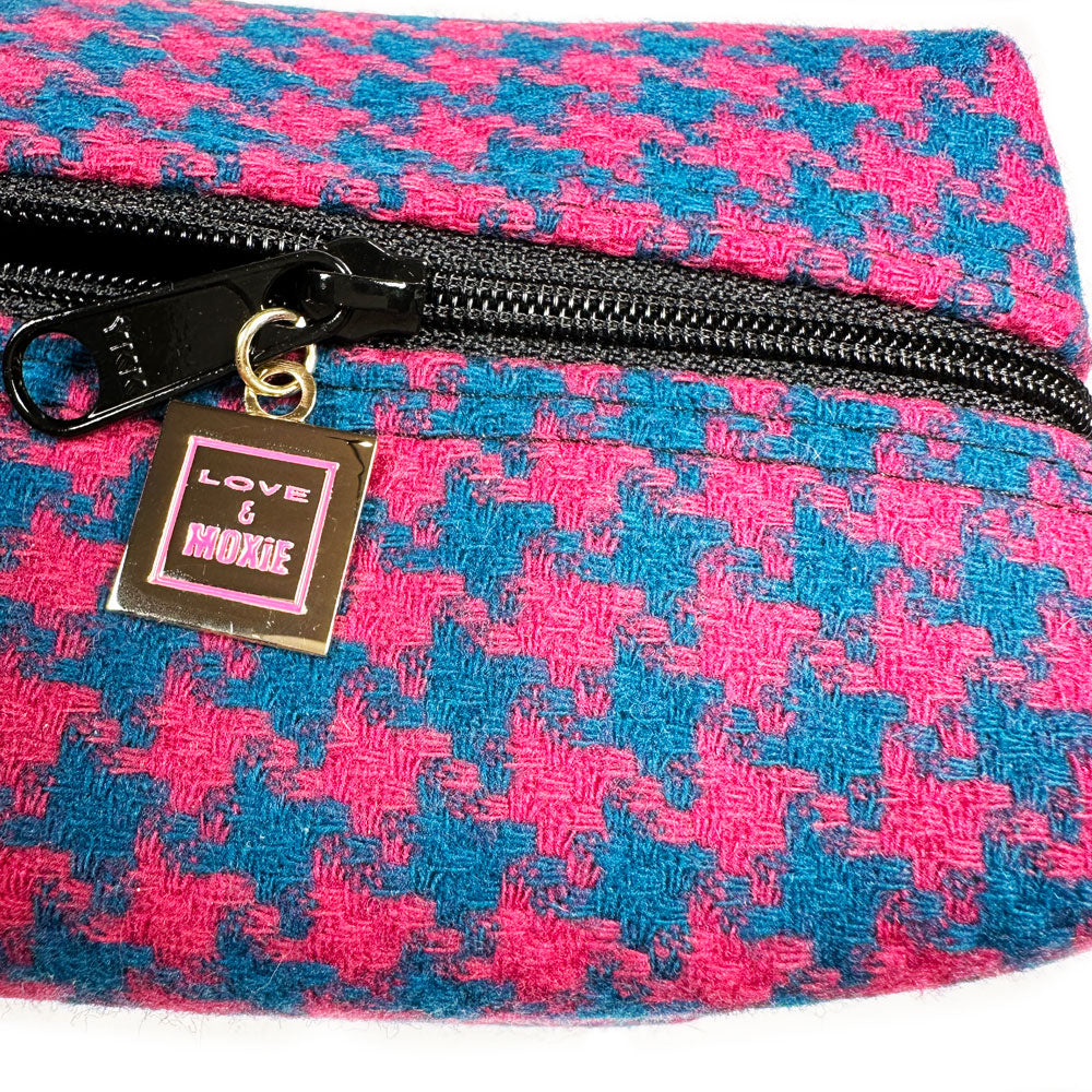 Meet Amy, your snazzy new bestie perfect for corralling all your on-the-go goods. Her fabulously functional size makes her perfect for organizing your tech must-haves, toiletries, make-up, and more. In oh-so typical LOVE & MOXiE fashion, she is made from 100% upcycled materials, an 80's vibe wool houndstooth skirt. Even better, Amy is lined with a wipe-clean, waterproof canvas, which means no more trips on the hot mess express or grimy bottoms when your blush pops open or your contact solution takes a spill.