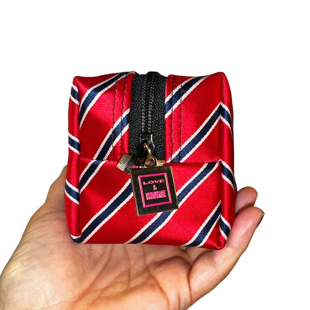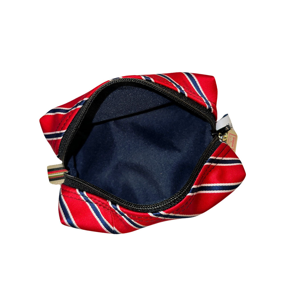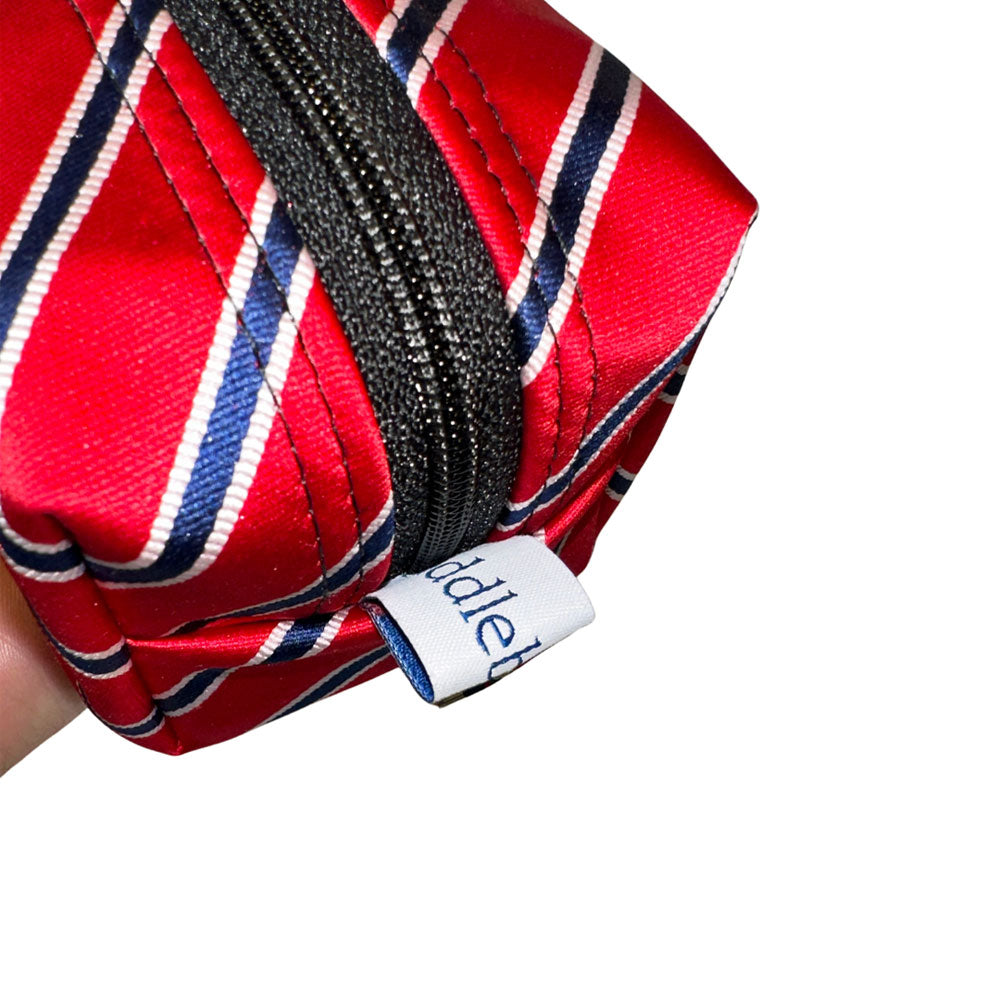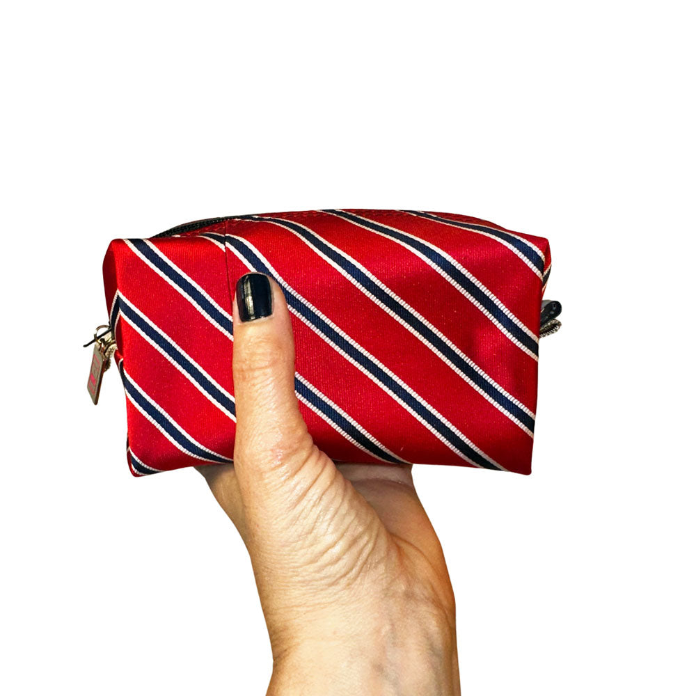 Don't let Ashley’s small size fool you, there's no denying she's boasting both style and function. She's handcrafted from a stylin’ red, white and blue striped upcycled tie (including her original label) not to mention her wipe-clean waterproof canvas lining, yay, no more grimy bag bottoms.