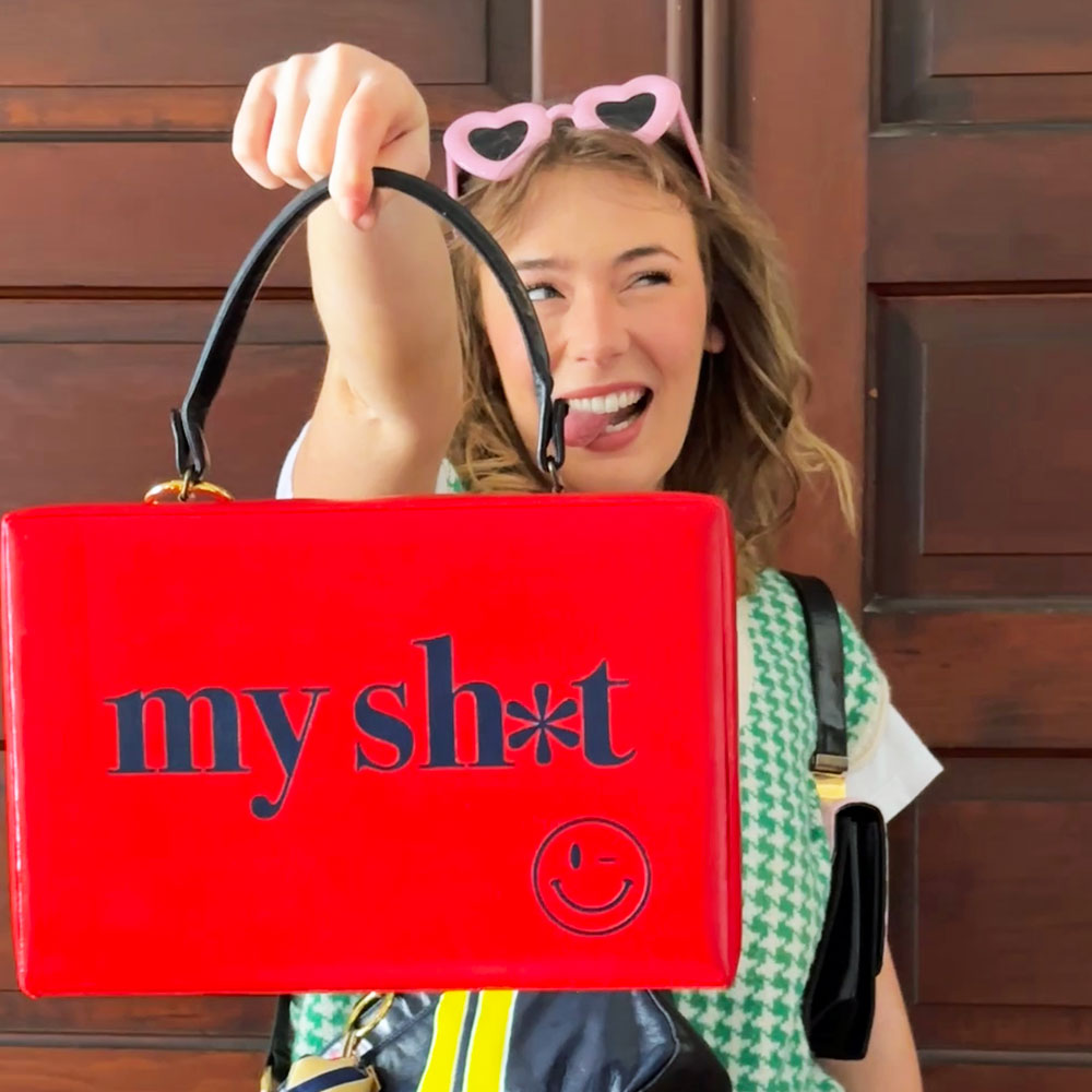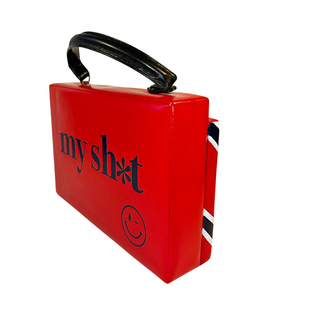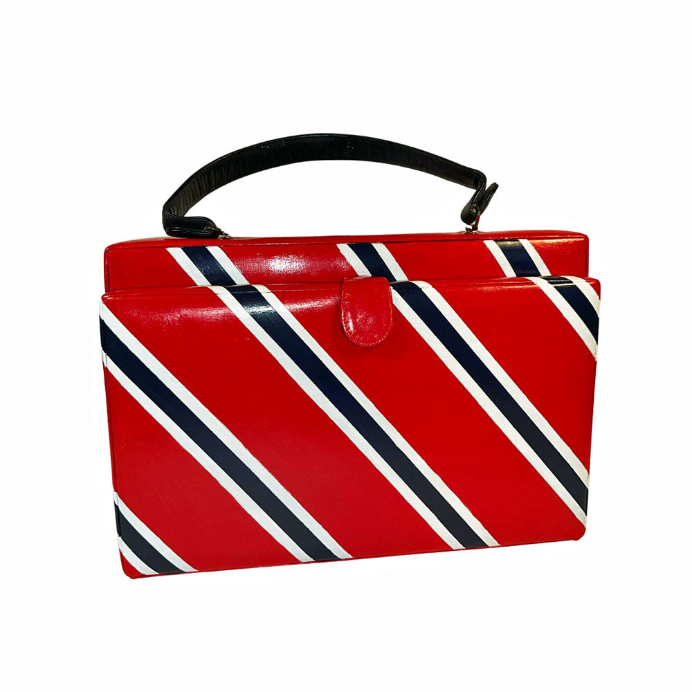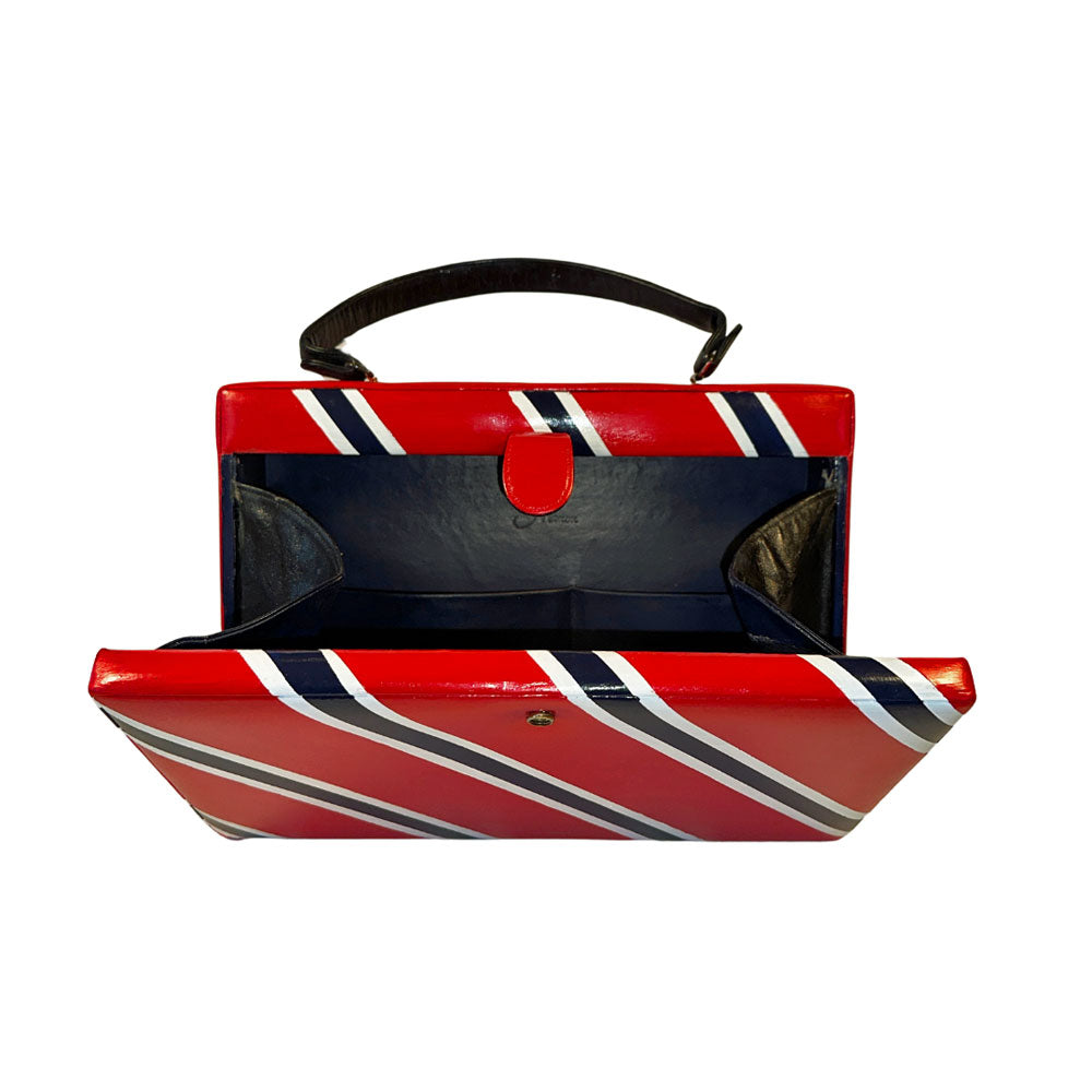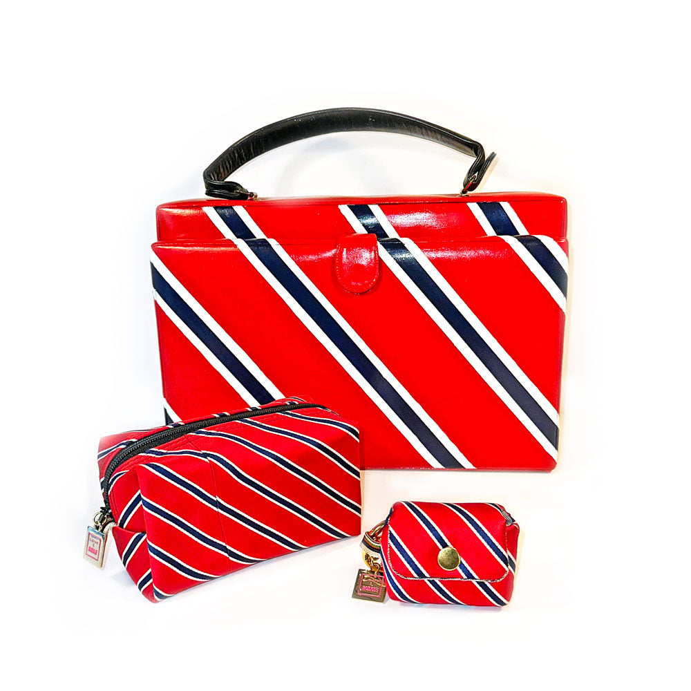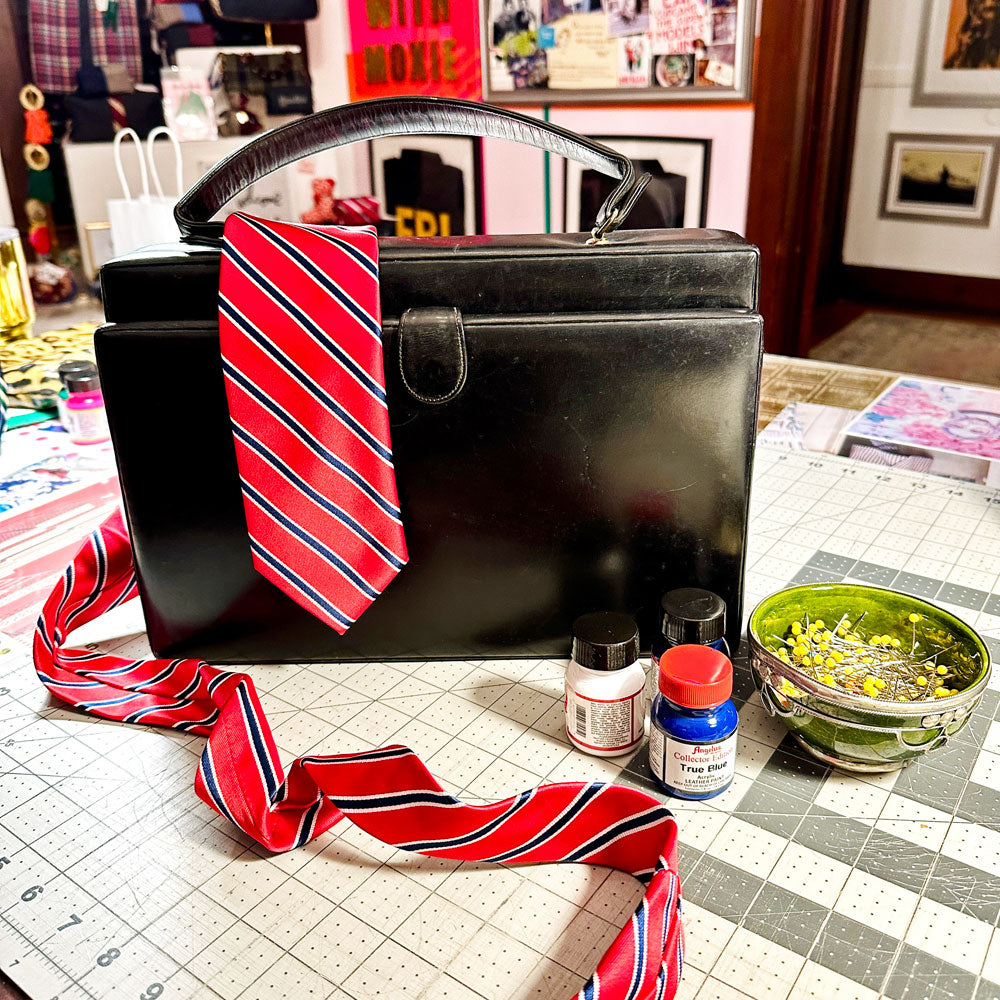 Ashley's been moxie-fied with tediously hand-painted spunky graphics and stripes (along with her navy interior), inspired by the color way and pattern of an upcycled tie. As a part of our Painted Ladies Collection, she's got none other than a mighty mini bag & AirPod case to match!