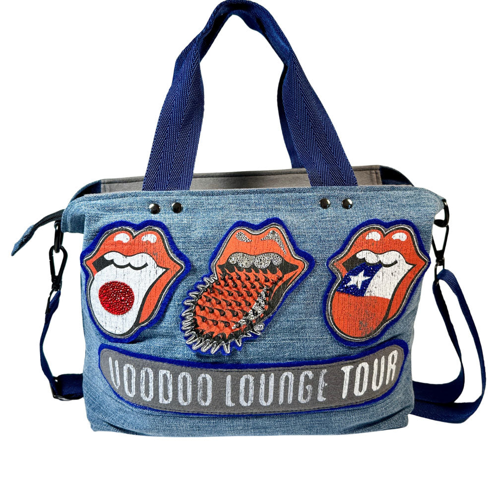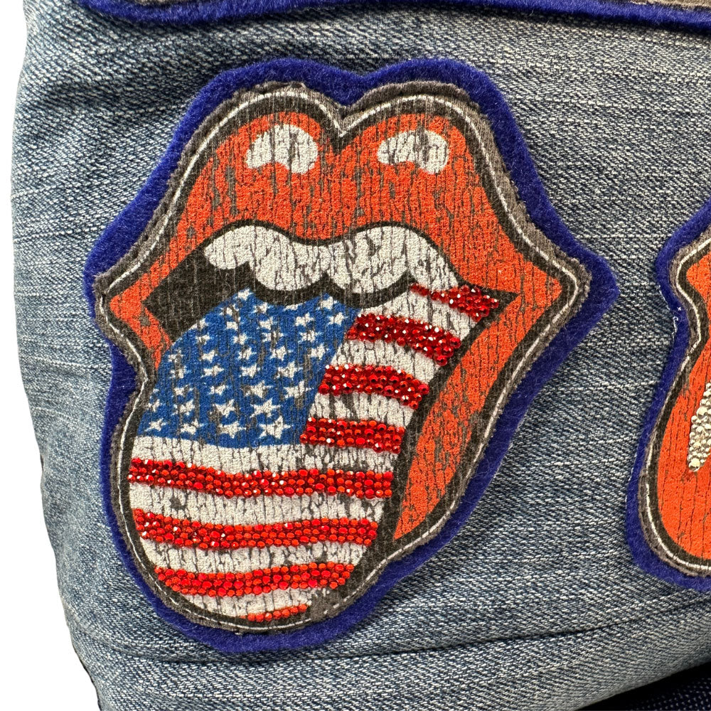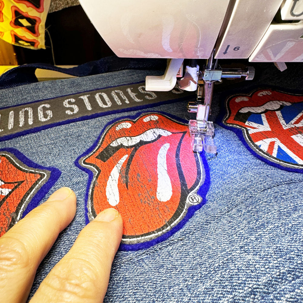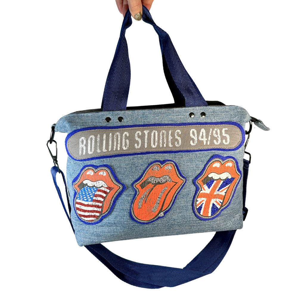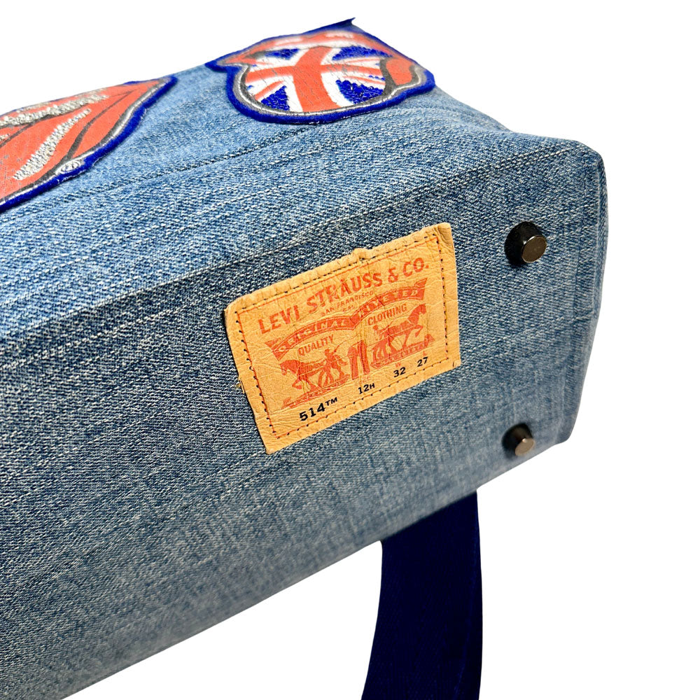 - handcrafted from a thrifted Rolling Stones tee and a pair of Levi’s (the original label is on the bottom of the bag) - truly one of a kind