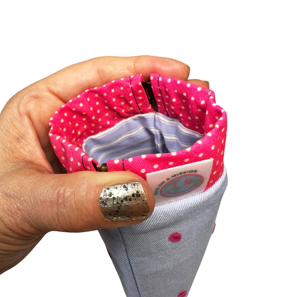 Say hello to our Barbie coin purse, your go-to-gal for corralling all your cards, bills, loose change, and anything in between. Barbie's flex-clip snap-and-go opening is easy-peasy - dare we say, lemon-squeezy - keeping all your must-haves available at your side in a pinch. She's handmade from an upcycled button-down shirt, making her sustainably sassy in all the right ways.