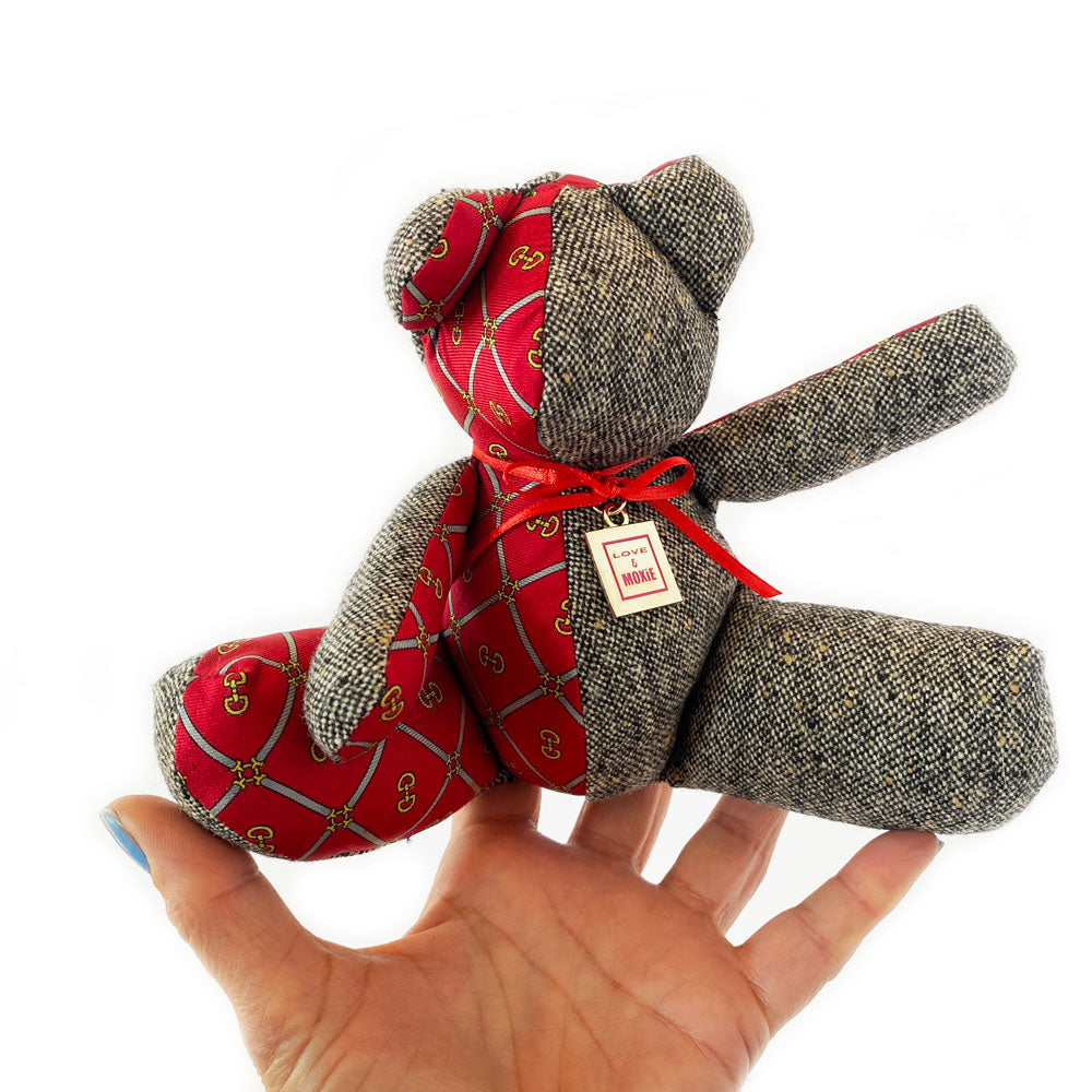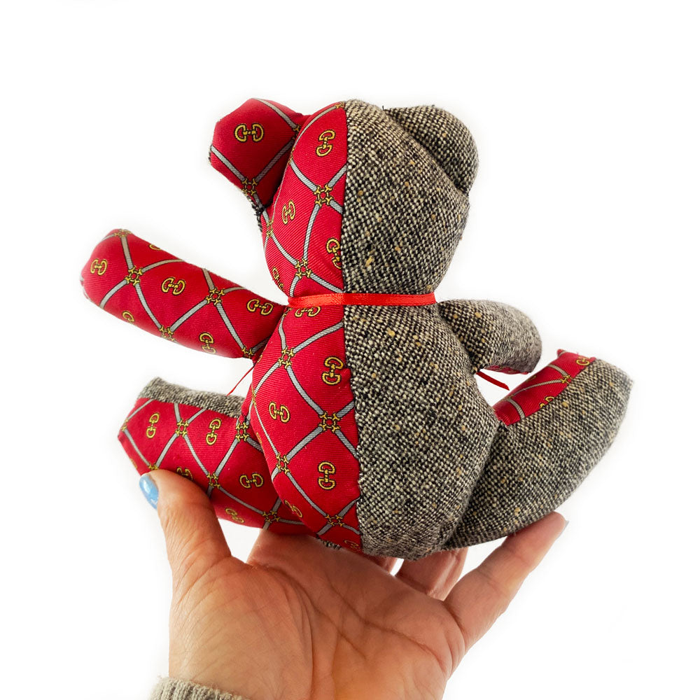 - handcrafted from upcycled fabric from various collections, each bear is 100% one-of-a-kind!