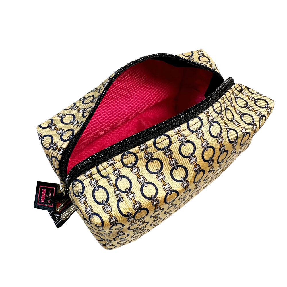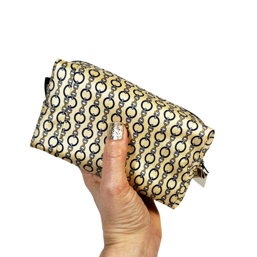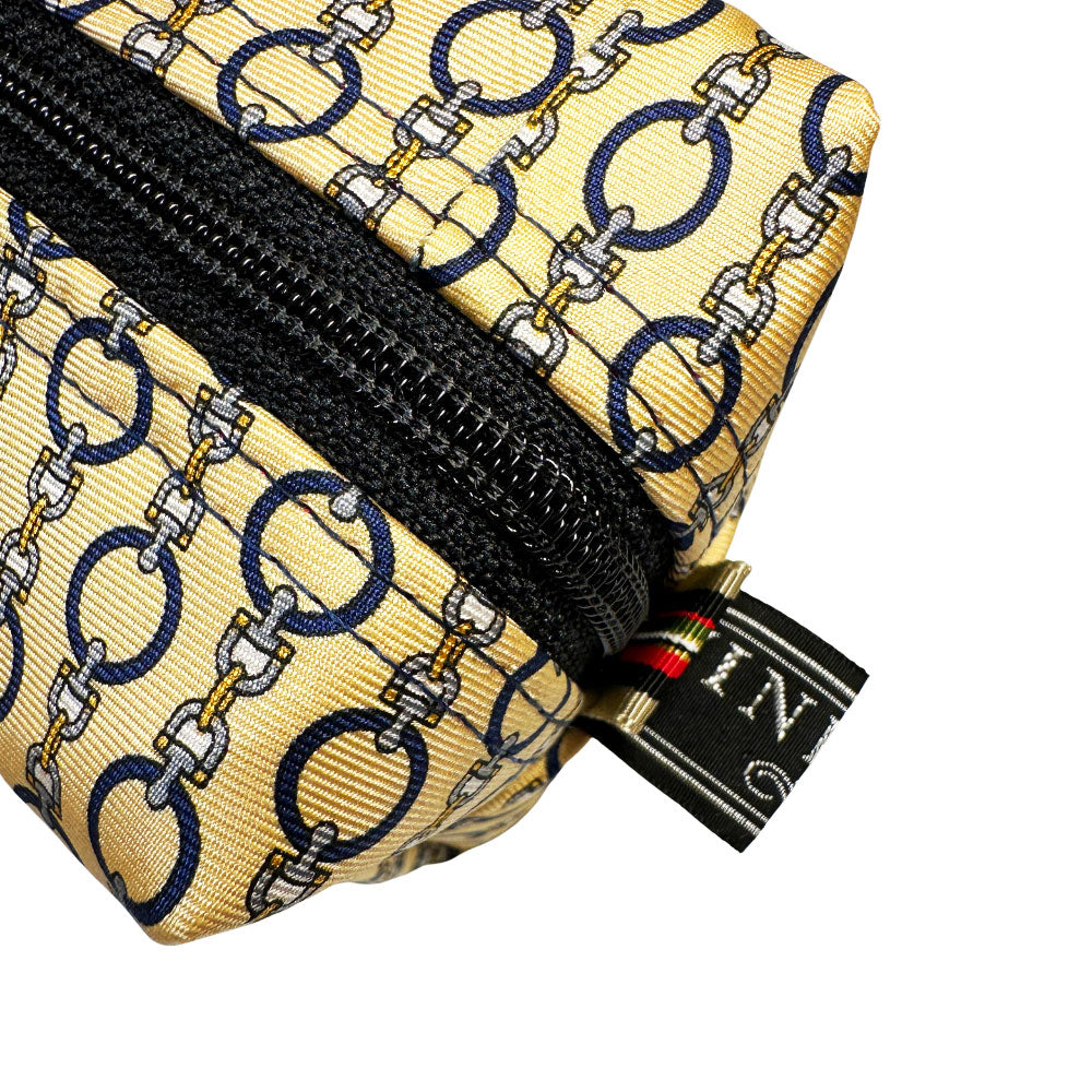 Meet Bonney your new BFF, she's a cutie that packs a punch in both style and function. Meticulously handcrafted from a deconstructed vintaget necktie she's truly one-of-a-kind. Don't let her mini size fool you, she's big on details from her wipe-clean pink waterproof canvas lining, original tie label, double row top stitching to her reinforced covered seams. She's super useful too - her boxy shape accommodates a variety of items from pens & pencils, hair accessories, cosmetics to tech gear & more. Plus she's the perfect size for corralling those small items that get lost at the bottom of your purse, we're talking about you, lip balm!