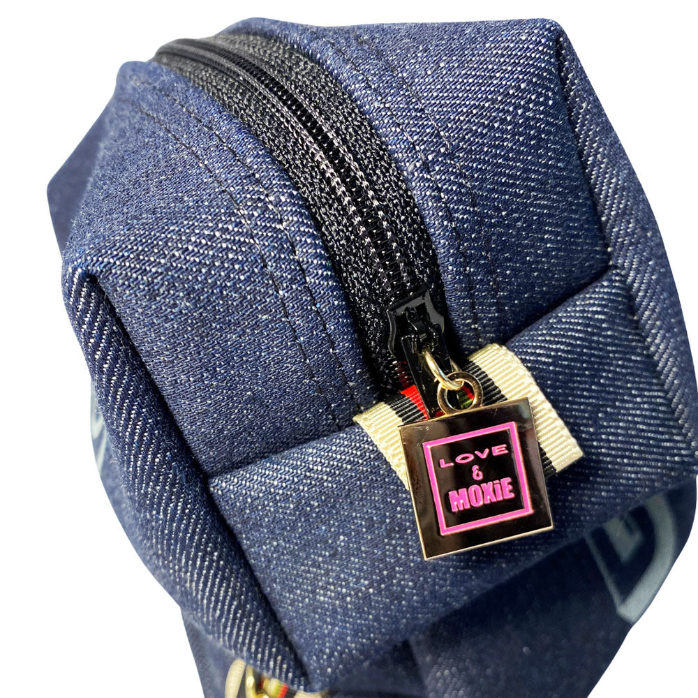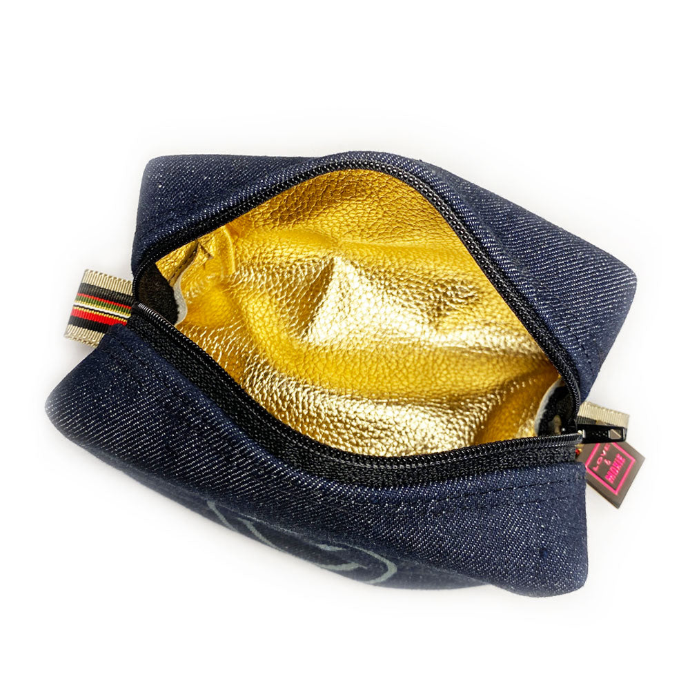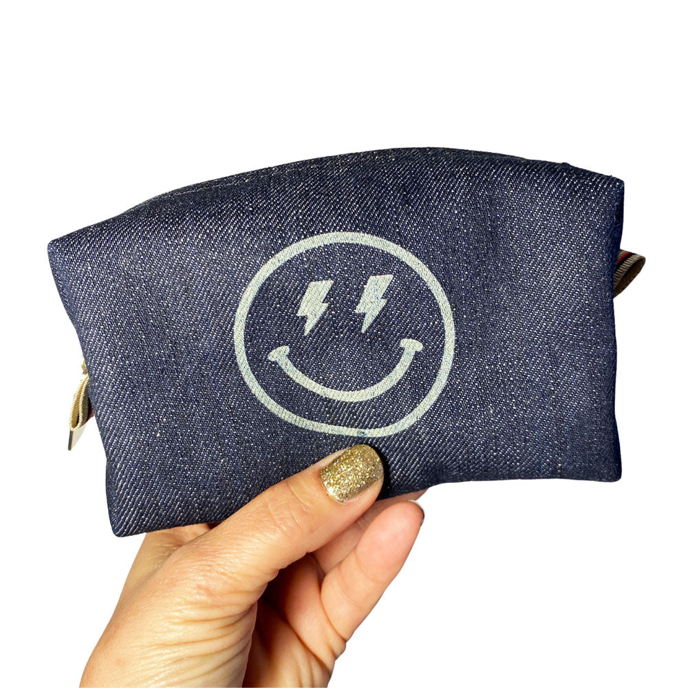 With its lightning bolt eyes and infectious smile, the Bowie will make you want to put on your red shoes and dance the blues away...or at least smile while corralling your stuff! The Bowie is meticulously handcrafted of 100% USA cotton denim and the cute smiley is laser engraved in-house right on the denim. Impeccably detailed from double row top stitching, sporty grosgrain ribbon side tabs, wipe-clean bright gold (cuz you're fancy) vegan leather lining to re-enforced covered seams she exudes style and quality. Plus her boxy shape and supple fabric make her super functional, accommodating a myriad of items and she can easily fit in a larger bag to corral those small items that get lost at the bottom! Once you get a hold of one of these mighty minis you'll want another...and another.