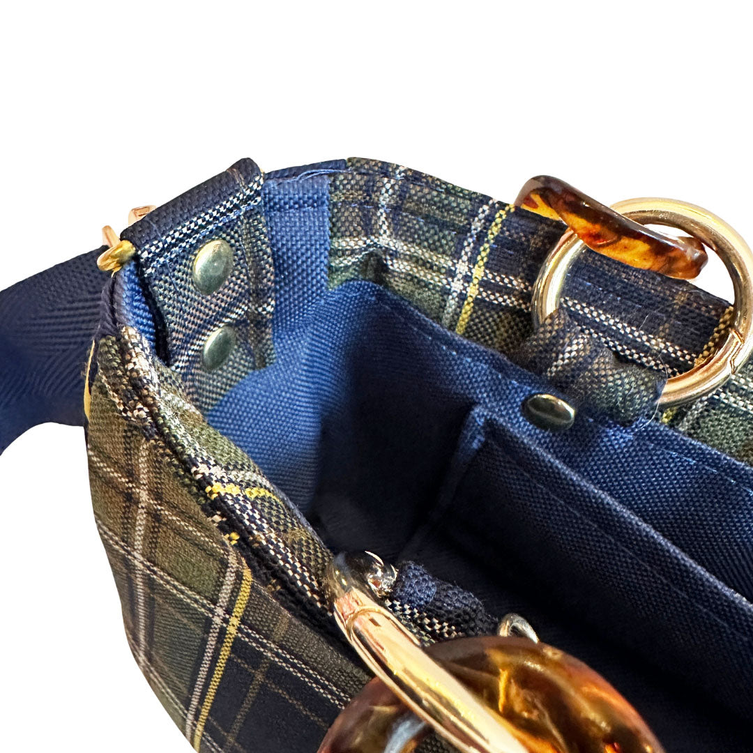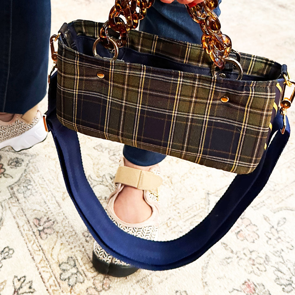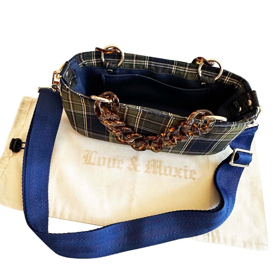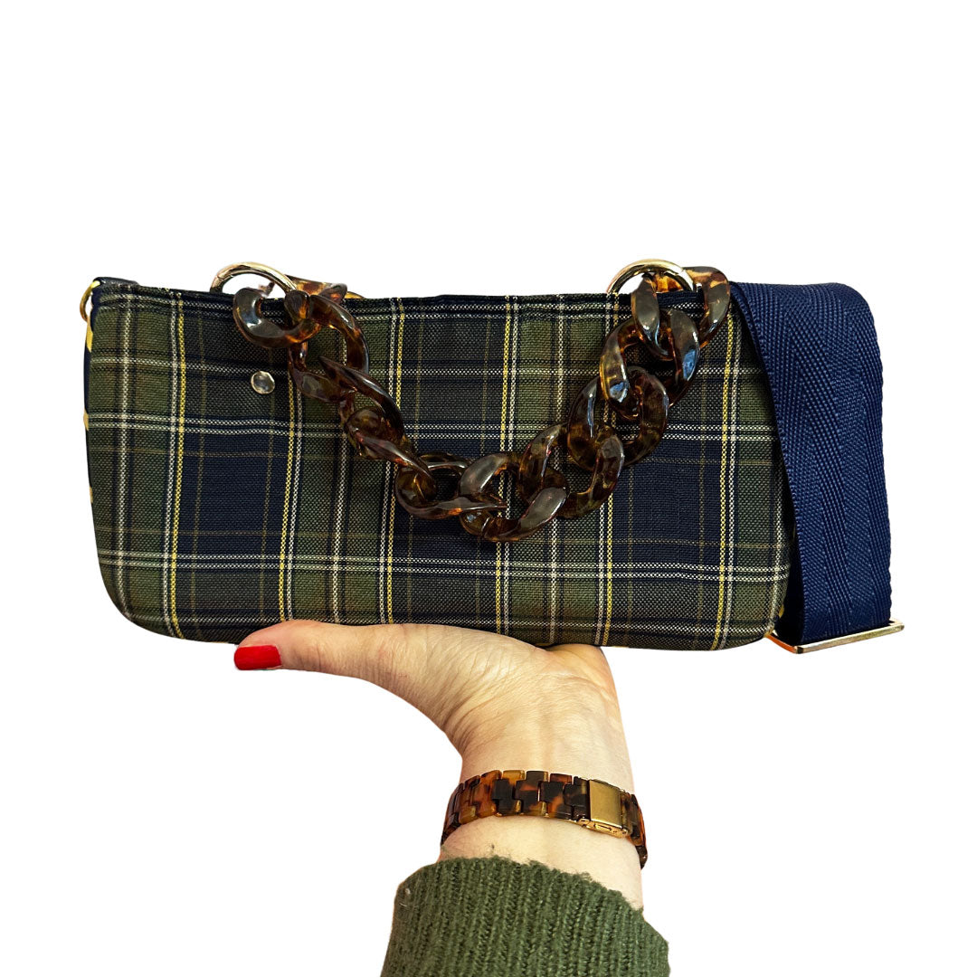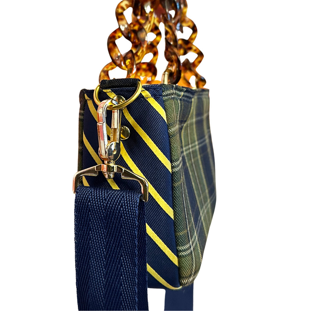 Little but lavish, Brooks keeps your phone, wallet and keys corralled in style. Handcrafted from upcycled plaid golf pants and a classic striped tie, there's no denying she's the perfect spunky sidekick. With her fab tortoise acrylic chain handles or adjustable (and removable!) crossbody strap, she's game for errands, an espresso [martini ;)], or anything in between. Plus, she's lined with a wipe-clean, waterproof canvas making spills and grime a problem of the past. Come on, what's not to love?!