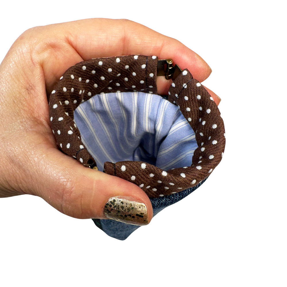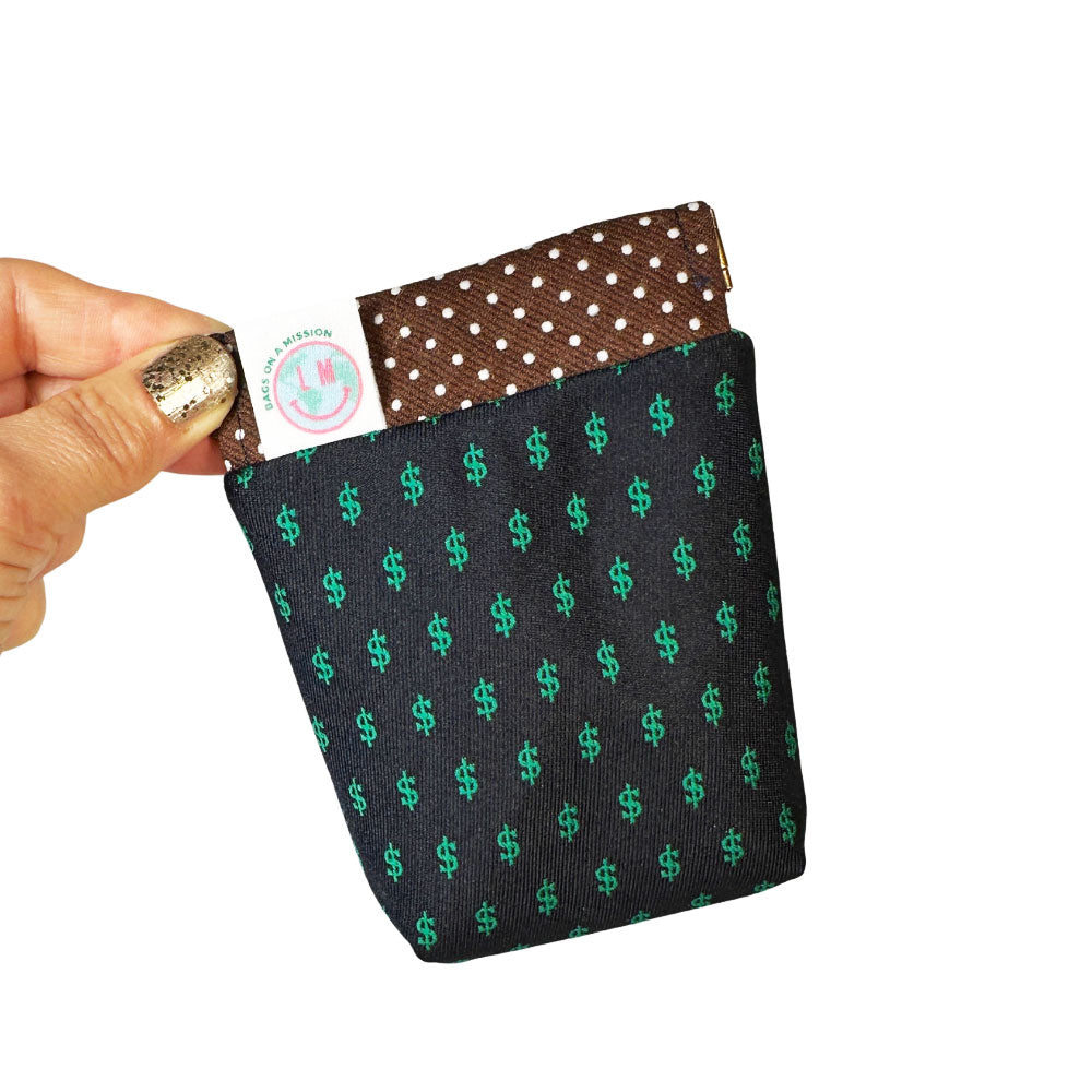 Say hello to our money for thrifting Bennie coin purse, your go-to-gal for corralling all your cards, bills, loose change, and anything in between. Bennie's flex-clip snap-and-go opening is easy-peasy - dare we say, lemon-squeezy - keeping all your must-haves available at your side in a pinch. She's handmade from an upcycled tie and laser-engraved denim, making her sustainably sassy in all the right ways.