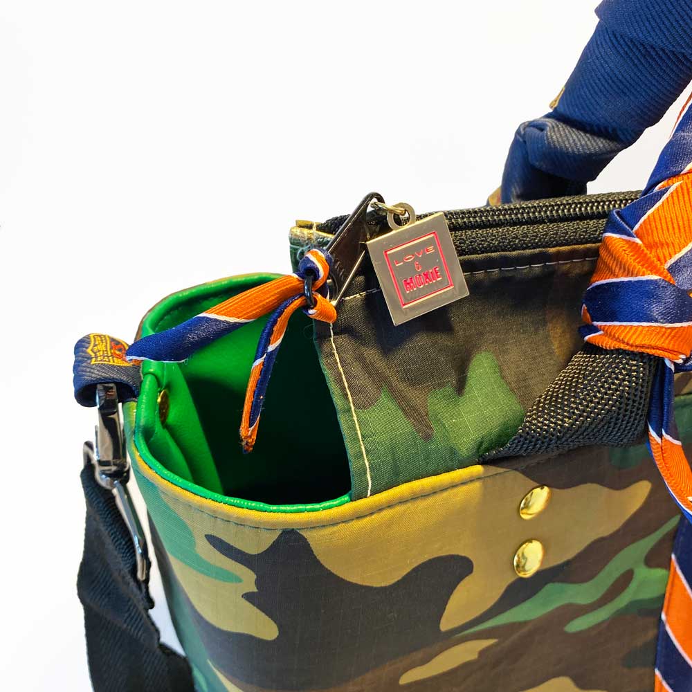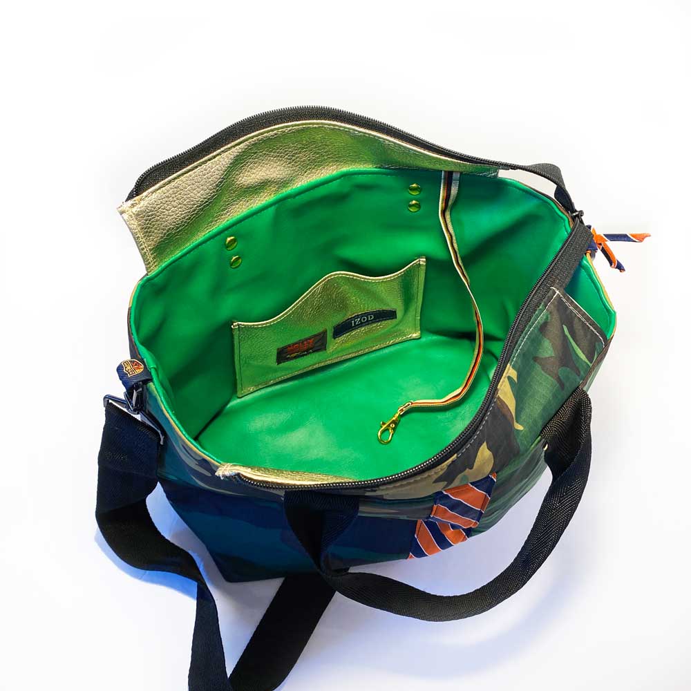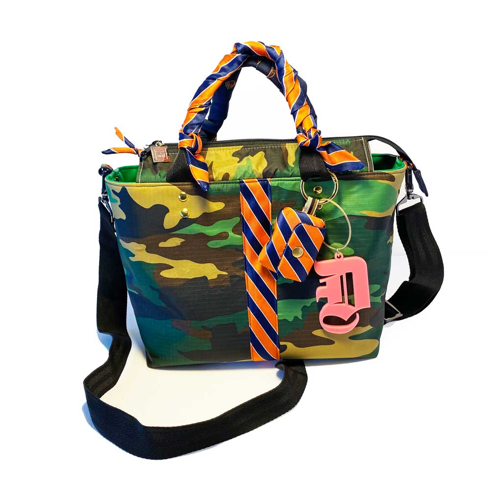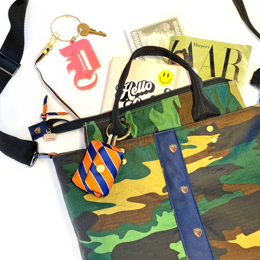 Say hello to Washington, your new BFF, she'll hold all your stuff in style and won't ever complain about it. She's a little two-faced, but that's why you love her. A hybrid upcycled bag, she's meticulously handcrafted from rip-stop nylon and two deconstructed upcycled neckties which make up her sporty detailing, different on each side, and interchangeable handle covers so you can change her up with your mood. Washington isn't just a pretty face, she's thoughtful too. She'll make your leaks and spills disappear with her wipe-clean vegan leather lining, have your keys at the ready with her integrated key fob, corral your phone inside her slit pocket, and be hands free with her adjustable crossbody strap. Come on, admit it, you know you wanna be friends ;)