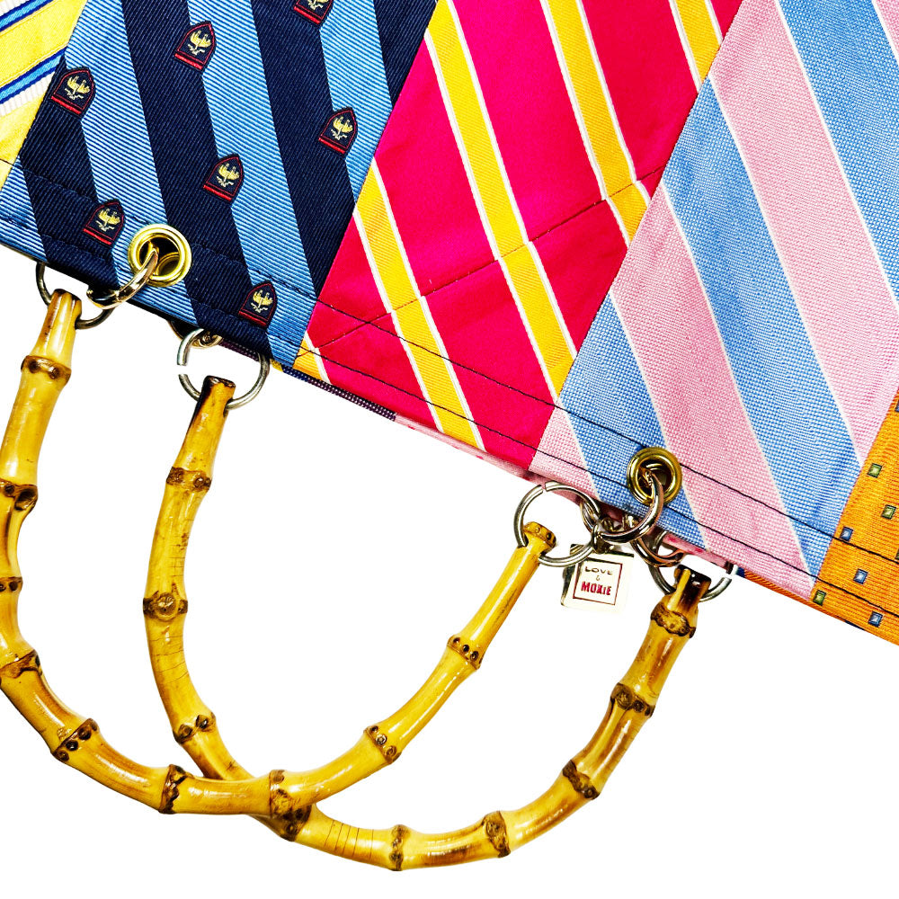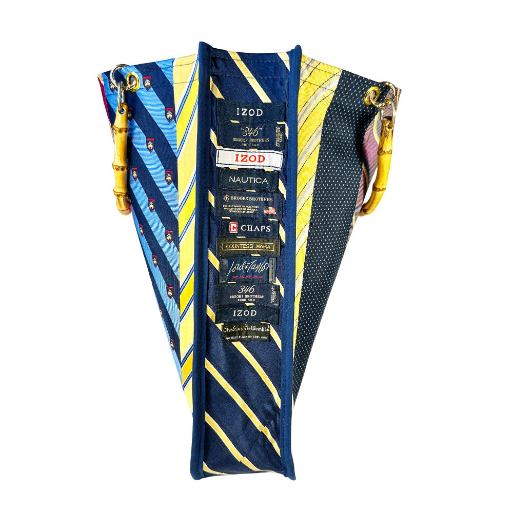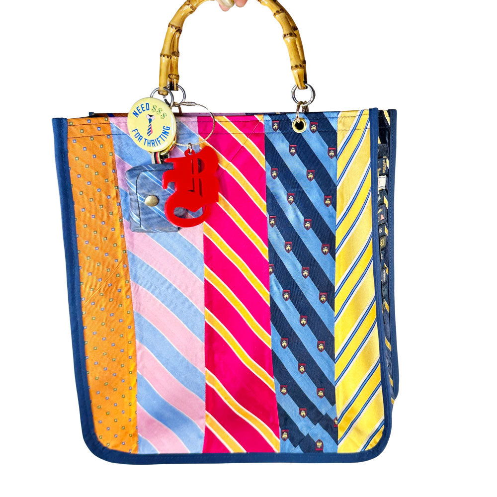 Say hello to Charlotte, your new dapper BFF, she'll hold all your stuff while making you look like a posh British Vogue editor. Charlotte was previously 11 fab neckties snatched up at estate sales and second hand vendors before she was carefully deconstructed and married with vintage bamboo handles and navy blue edging, transforming into her current state complete with her original tie labels. Charlotte isn't just a pretty face, she's super helpful too; she'll make your leaks and spills disappear with her wipe-clean waterproof canvas lining, have your keys at the ready with her integrated key fob, and corral your phone inside her large pocket from a pair of Wangler jeans. Come on, admit it, you wanna be friends ;)