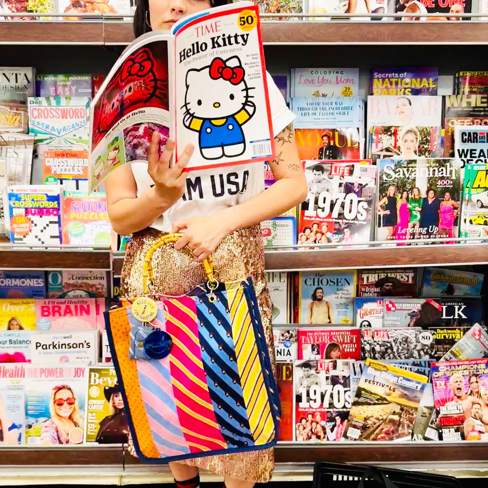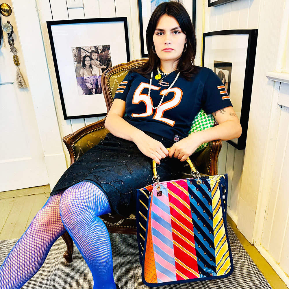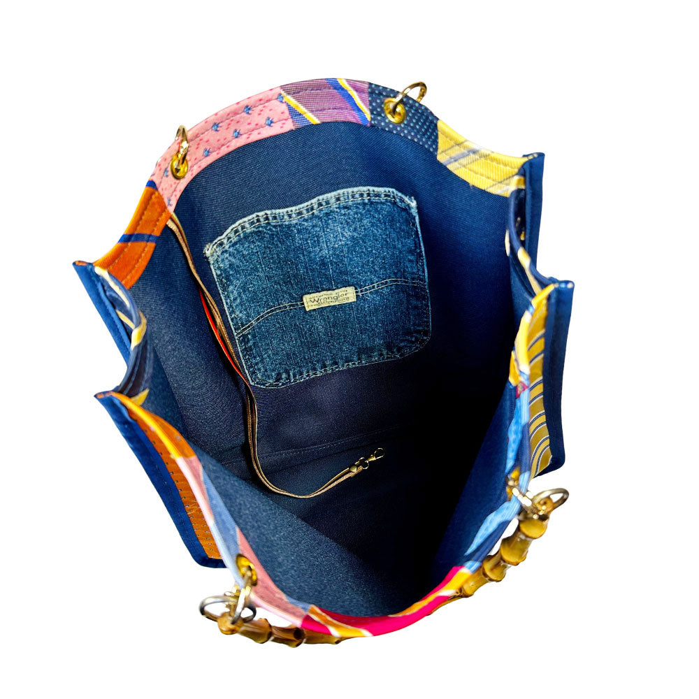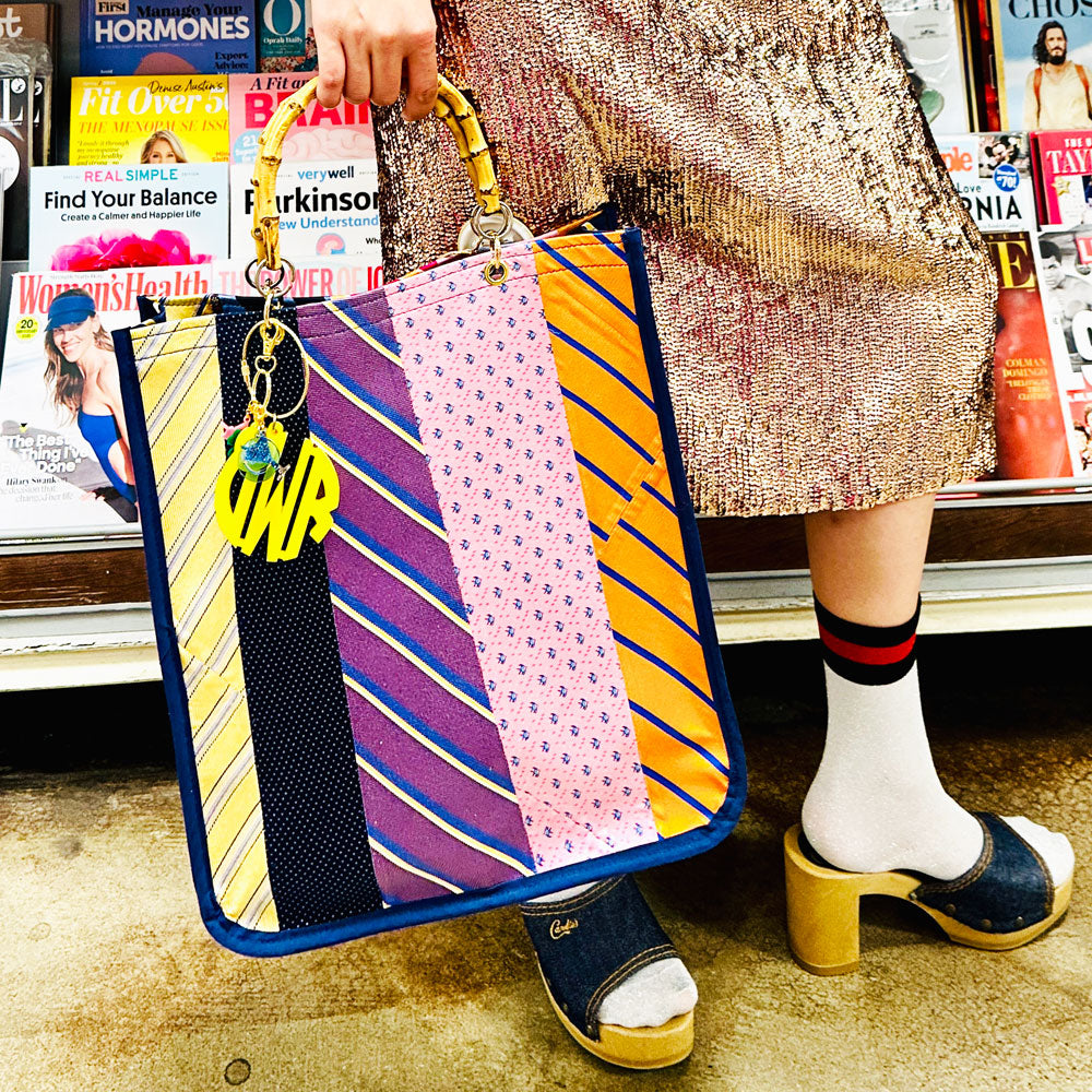 Say hello to Charlotte, your new dapper BFF, she'll hold all your stuff while making you look like a posh British Vogue editor. Charlotte was previously 11 fab neckties snatched up at estate sales and second hand vendors before she was carefully deconstructed and married with vintage bamboo handles and navy blue edging, transforming into her current state complete with her original tie labels. Charlotte isn't just a pretty face, she's super helpful too; she'll make your leaks and spills disappear with her wipe-clean waterproof canvas lining, have your keys at the ready with her integrated key fob, and corral your phone inside her large pocket from a pair of Wangler jeans. Come on, admit it, you wanna be friends ;)