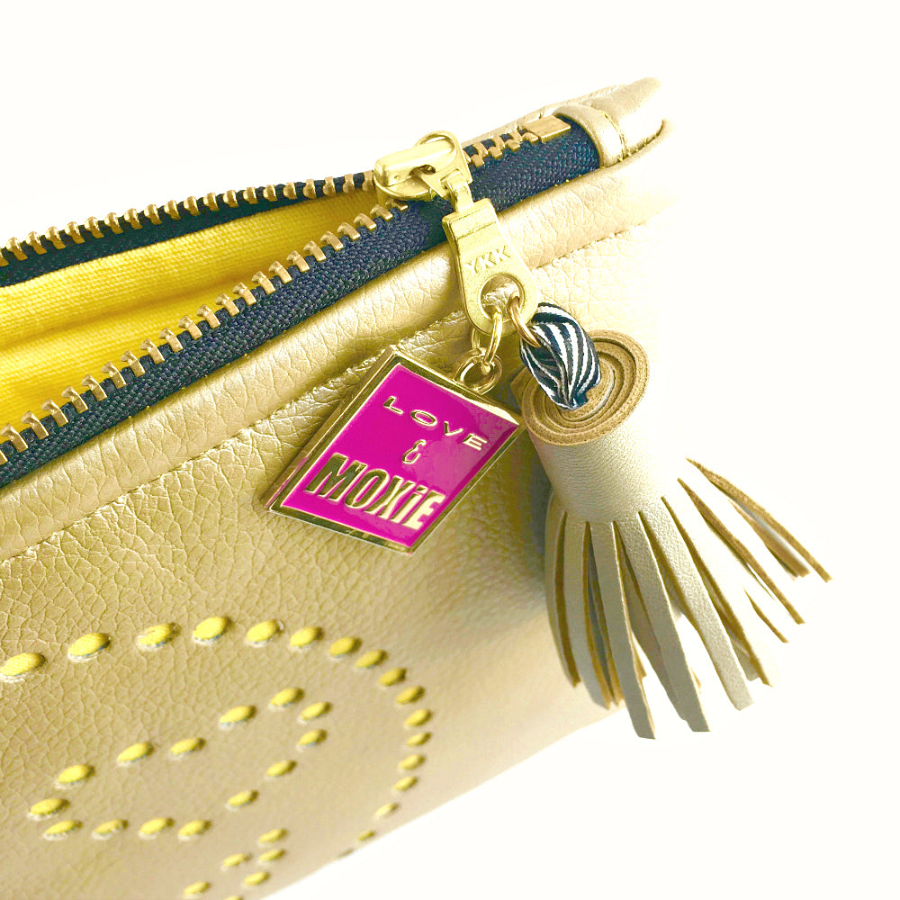 Be on trend AND protect your tablet with our emoji gold zipper pouch! It's the details that make this clutch a stand out from its hand punched emoji detailing revealing its bright yellow cotton twill lining, gold vegan leather, and metallic gold top stitching, to its handcrafted tassel zipper pull. But wait, this clutch isn't just gorg, its hard working too with its double stitched seams, boxed bottom, and foam padding that will protect your tablet or other essentials from bumps and scrapes. Now that's fab & functional!
