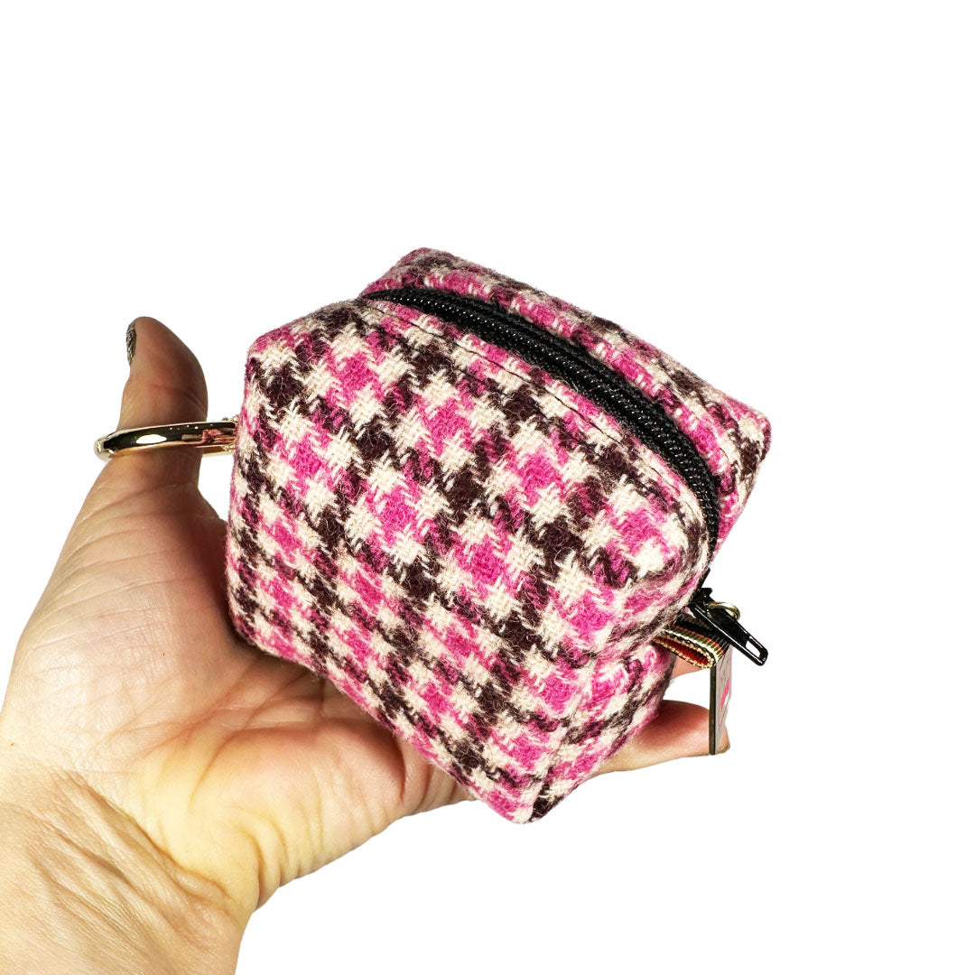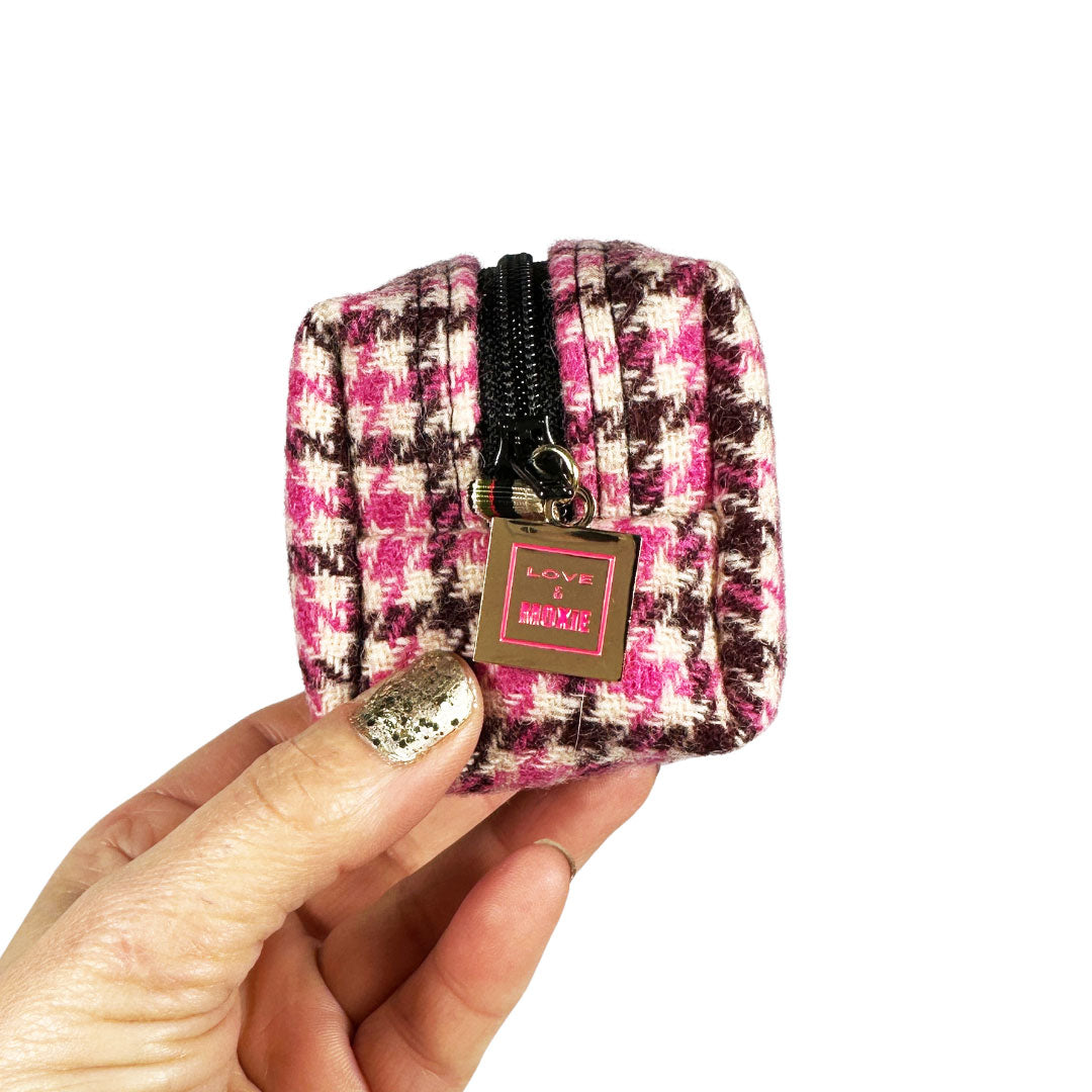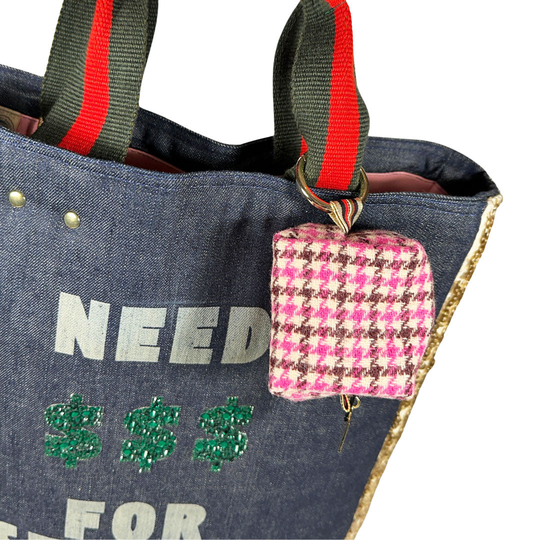 Super cute and very practical, Cordelia, our mini mini clip-on bag, will steal your heart! Handcrafted from an upcycled wool skirt outside and navy blue waterproof canvas on the inside, Cordelia is as good looking as she is functional. Her impeccable detailing from her double row top stitching to her gold hardware will make you scream, "yaaas!". Perfect clipped to your purse or belt loop for easy access to your hand sanitizer, lip balm, change, contact lenses, earbuds, or anything you need to get your hands on quickly.