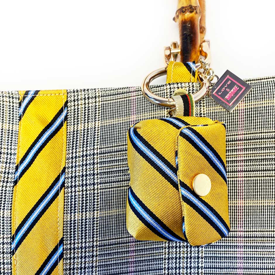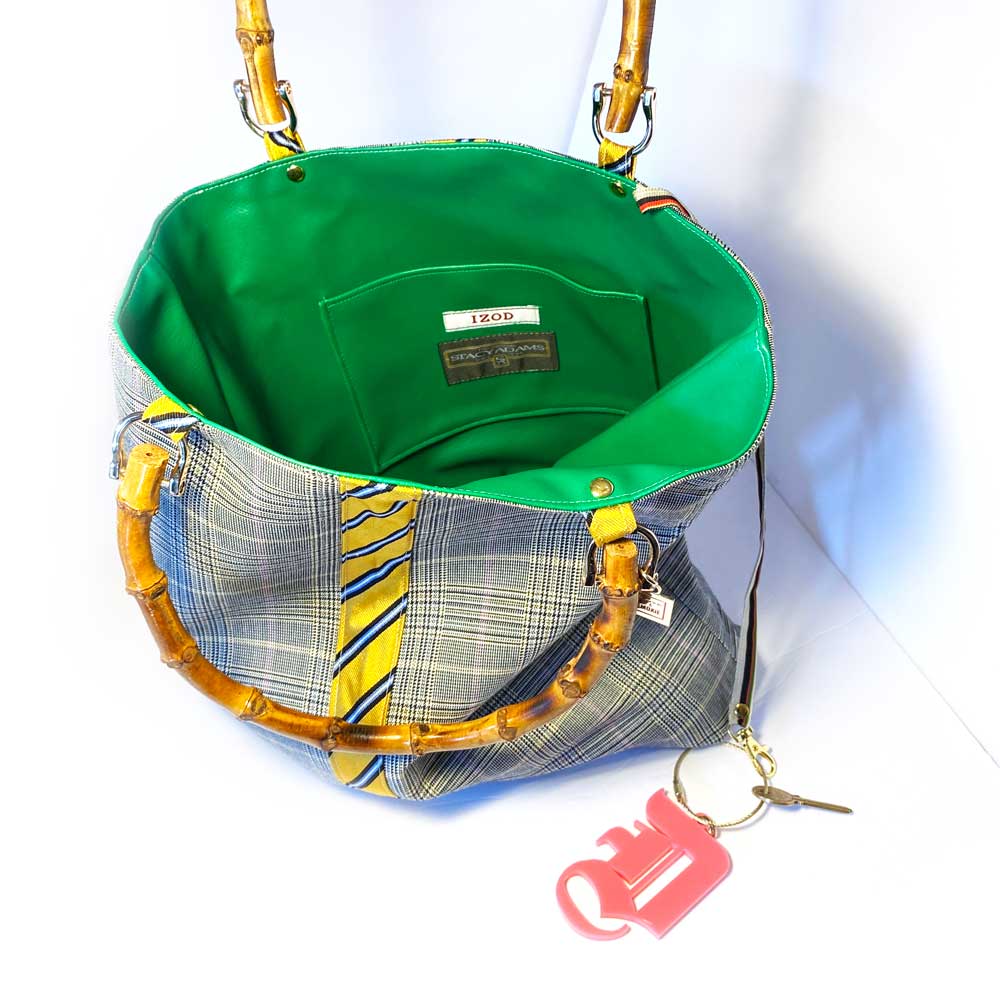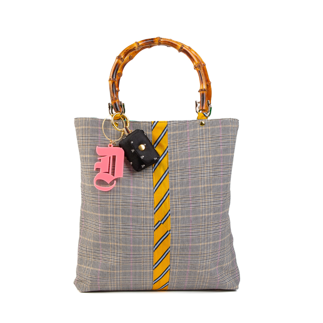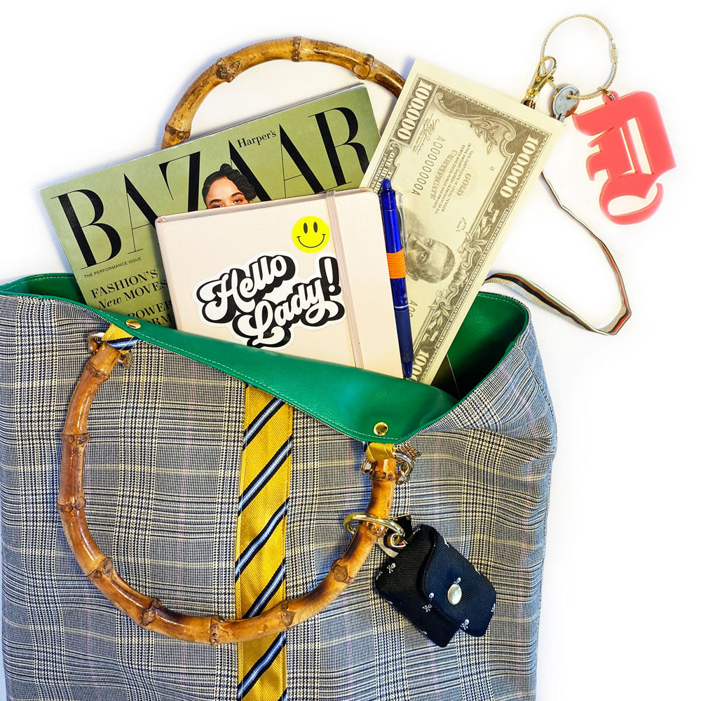 Say hello to Hermione, your new dapper BFF, she'll hold all your stuff while making you look like a posh British Vogue editor. Previously a suit, she was snatched up at an estate sale for her beautiful Italian glen plaid fabric with subtle pink and yellow stripes, absolutely divine! She was then carefully deconstructed and married with bamboo handles and a classic striped tie for her preppy detailing, before transforming into her current state complete with lux brass feet and gold equestrian feel hardware. Hermione isn't just a pretty face, she's super helpful too. She'll make your leaks and spills disappear with her wipe-clean vegan leather lining, have your keys at the ready with her integrated key fob, and corral your phone inside her slit pocket. Come on, admit it, you wanna be friends ;)
