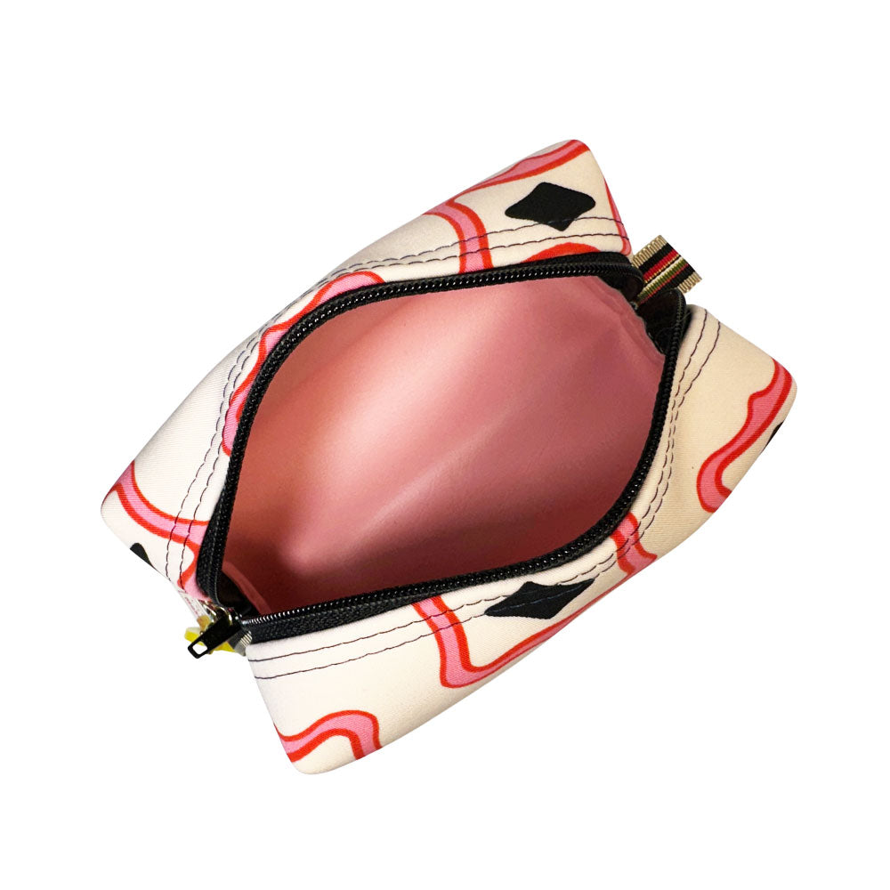 Meet Florence your new BFF, she's a cutie that packs a punch in both style and function. Meticulously handcrafted from a deconstructed graphic dress she's truly one-of-a-kind. Don't let her mini size fool you, she's big on details from her wipe-clean pink vegan leather lining, double row top stitching to her reinforced covered seams. She's super useful too - her boxy shape accommodates a variety of items from pens & pencils, hair accessories, cosmetics to tech gear & more. Plus she's the perfect size for corralling those small items that get lost at the bottom of your purse, we're talking about you, lip balm!