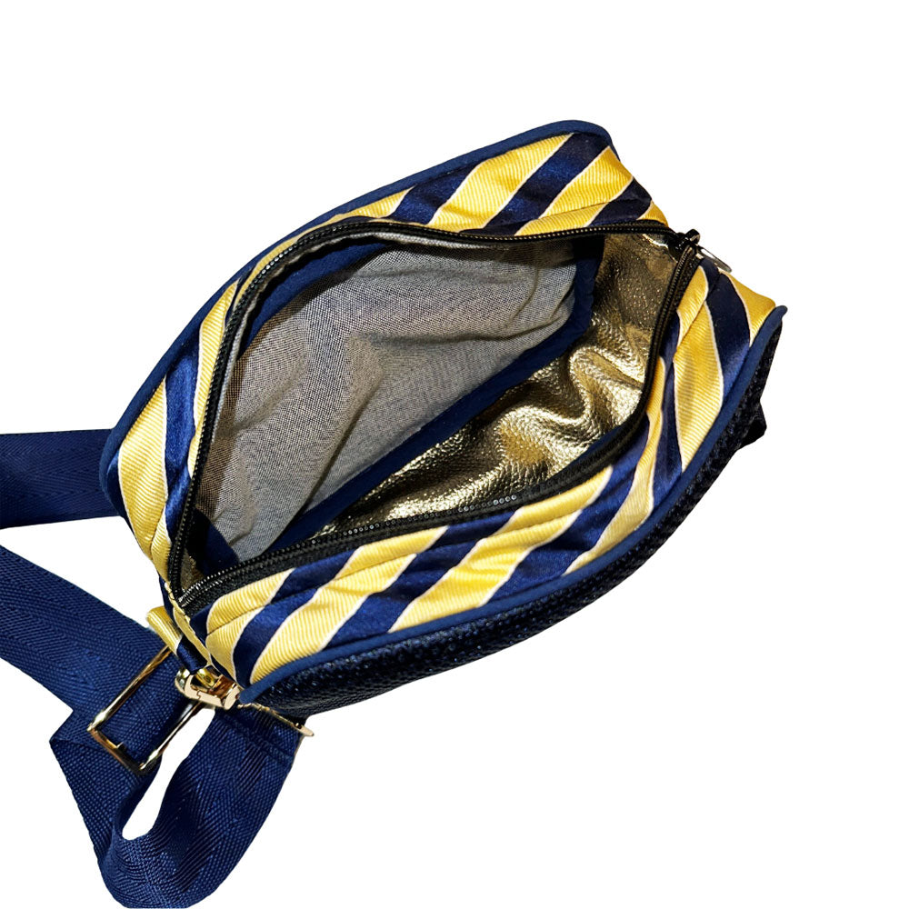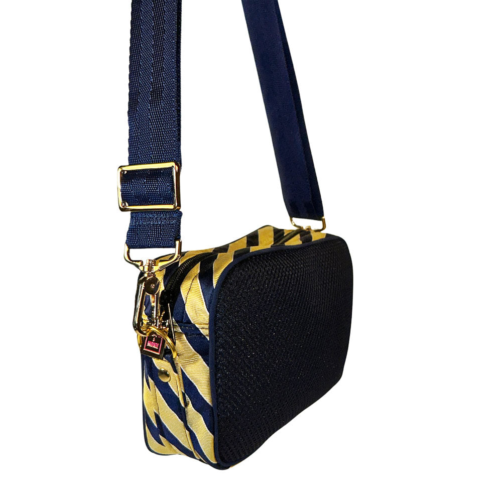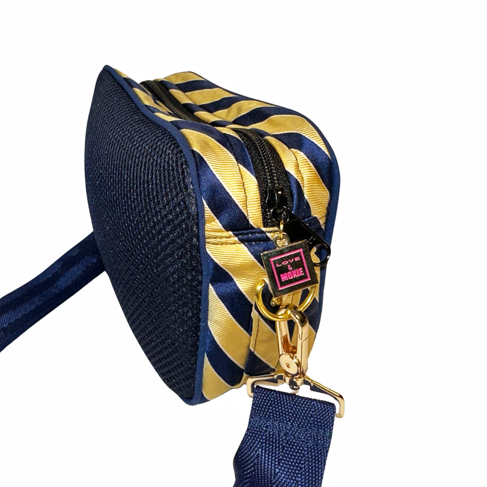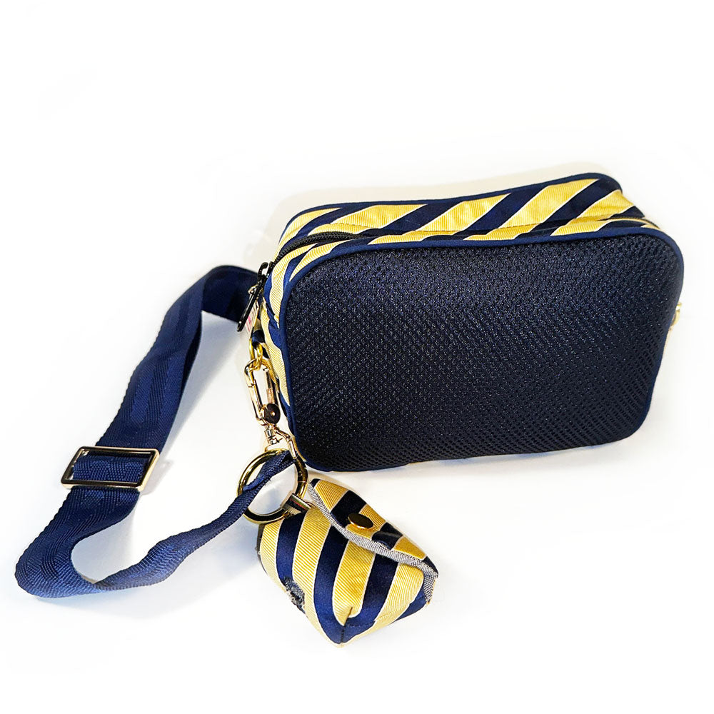 Frida is your unmatched companion for your busiest of days. There’s no denying she's the perfect size for concerts or game day, but is equally as fab to tote around with her adjustable crossbody strap she'll have you hands-free while you check off each box (okay. . . most boxes) on your to-do list. She's one-of-a-kind, handcrafted from sporty thick navy mesh and a thrifted blue & yellow necktie (including her original Izod label sewn on her bottom), with blue piping detailing to boot. The Frida part of our Painted Ladies Collection - her spunky stripes have also inspired one of our unique, hand-painted thrifted leather bags. Psst. . . . there's a AirPod case too ;)