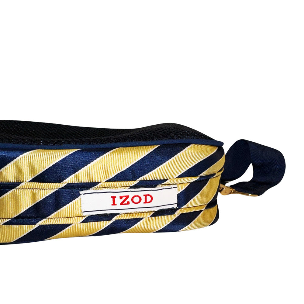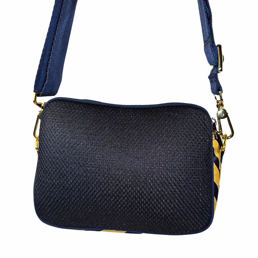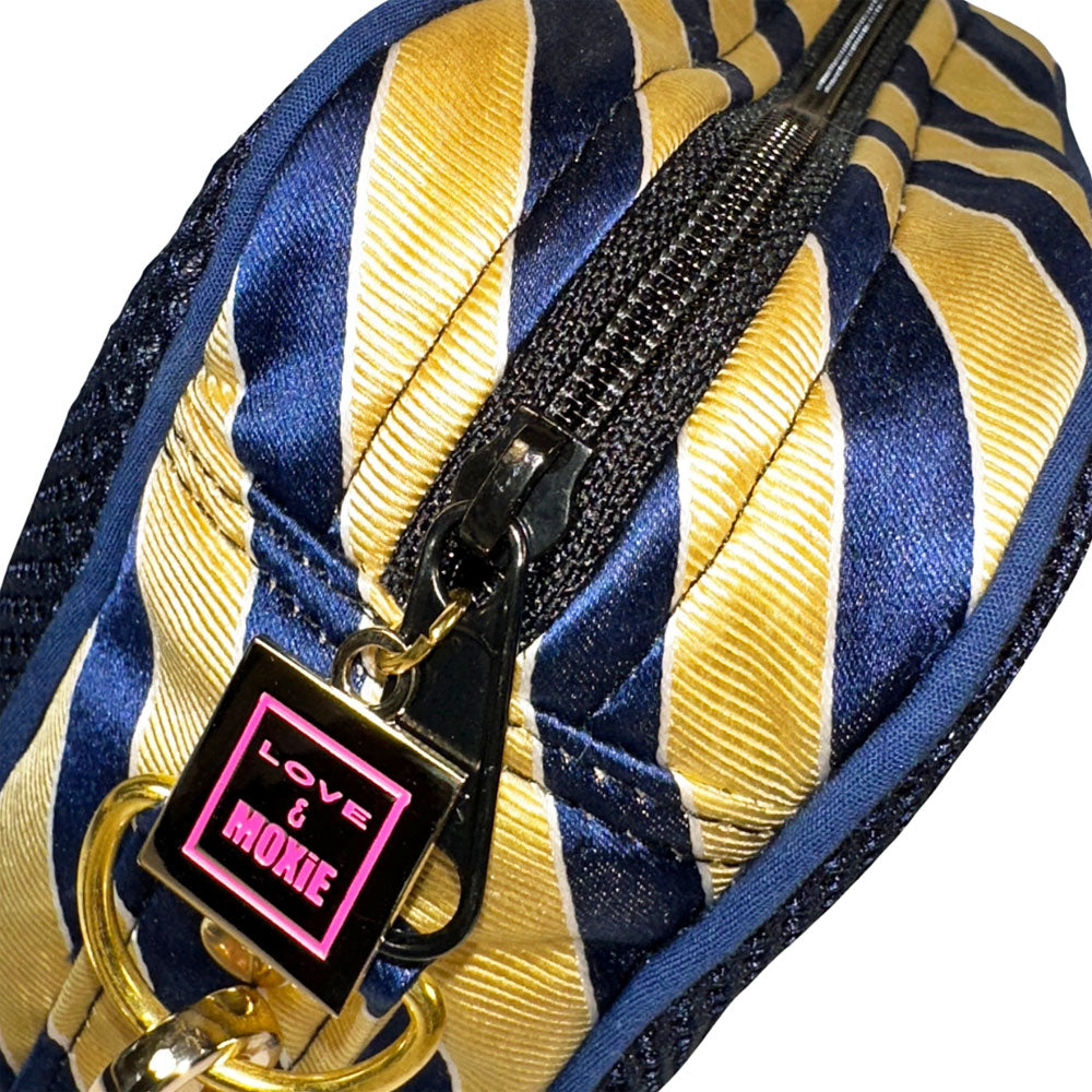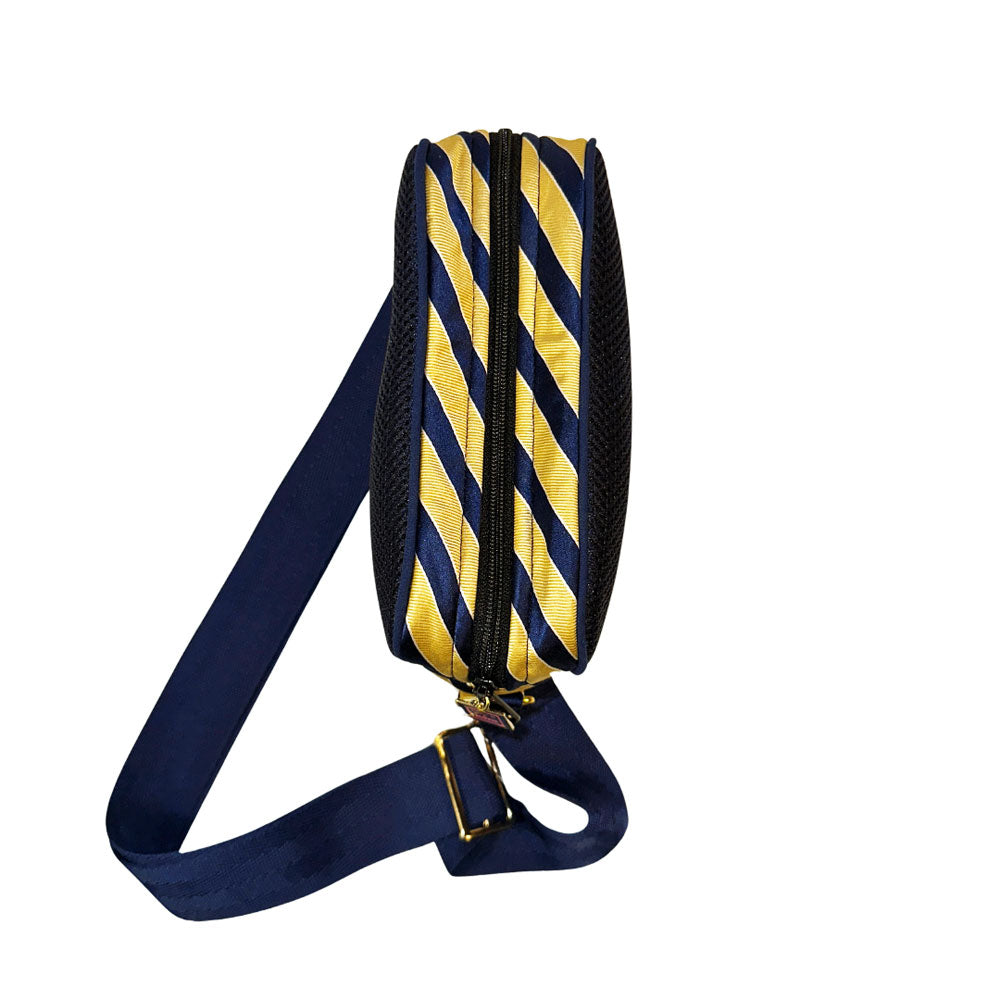 Frida is your unmatched companion for your busiest of days. There’s no denying she's the perfect size for concerts or game day, but is equally as fab to tote around with her adjustable crossbody strap she'll have you hands-free while you check off each box (okay. . . most boxes) on your to-do list. She's one-of-a-kind, handcrafted from sporty thick navy mesh and a thrifted blue & yellow necktie (including her original Izod label sewn on her bottom), with blue piping detailing to boot. The Frida part of our Painted Ladies Collection - her spunky stripes have also inspired one of our unique, hand-painted thrifted leather bags. Psst. . . . there's a AirPod case too ;)