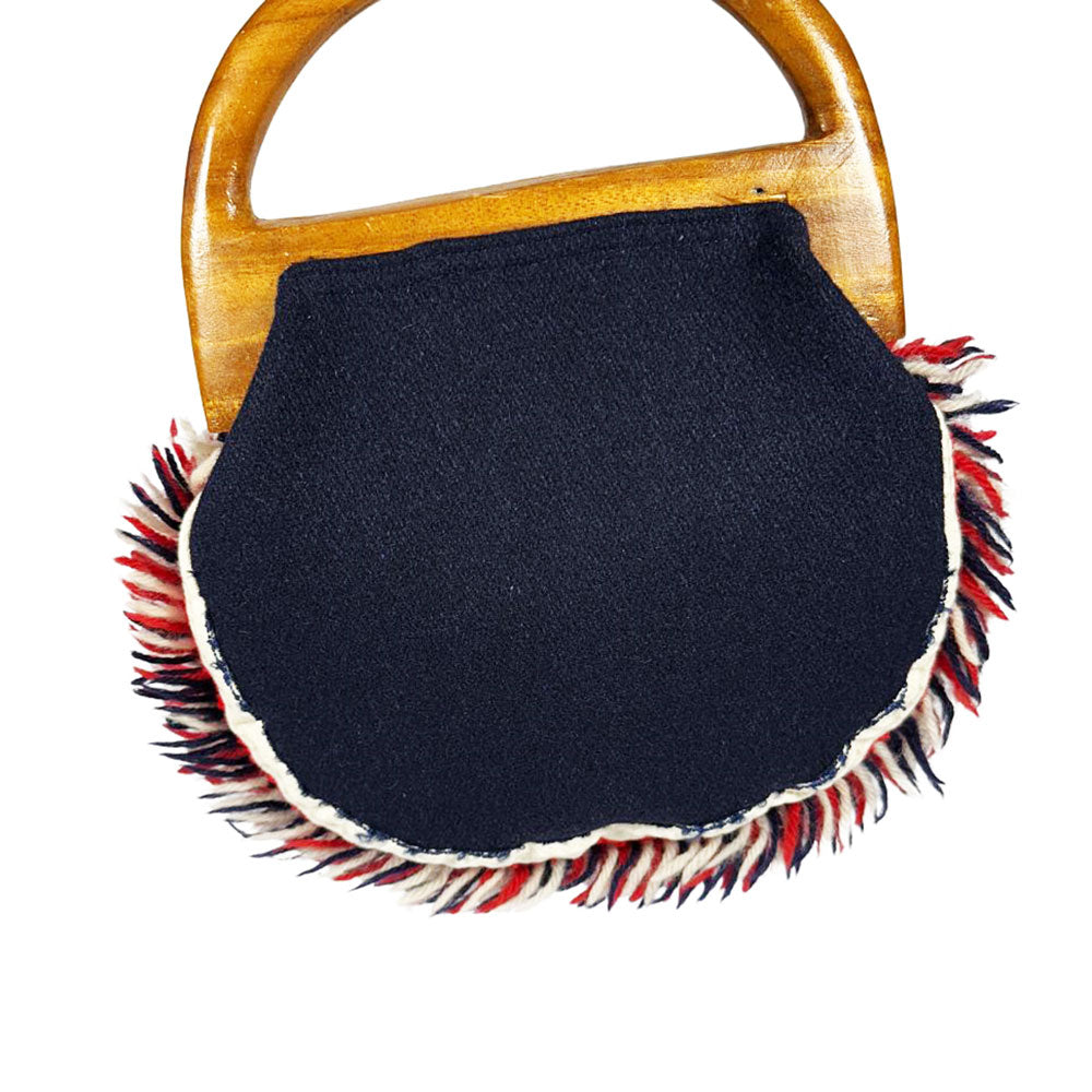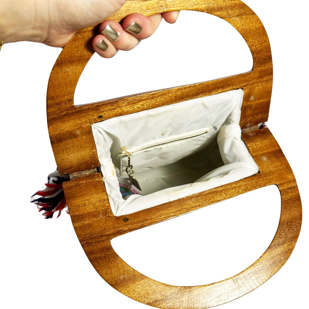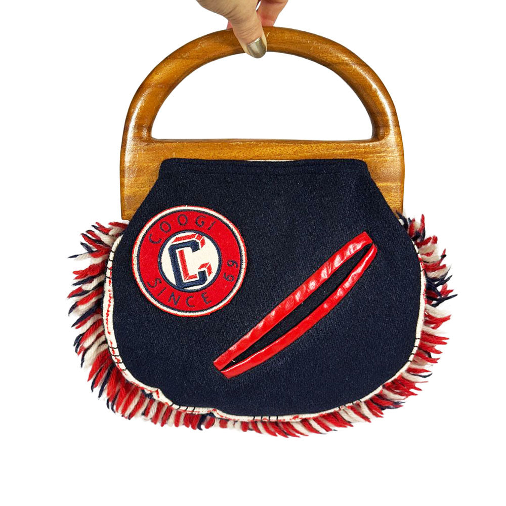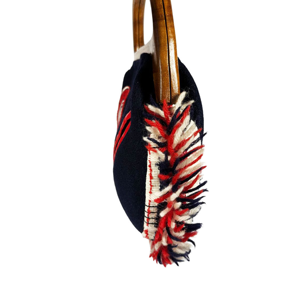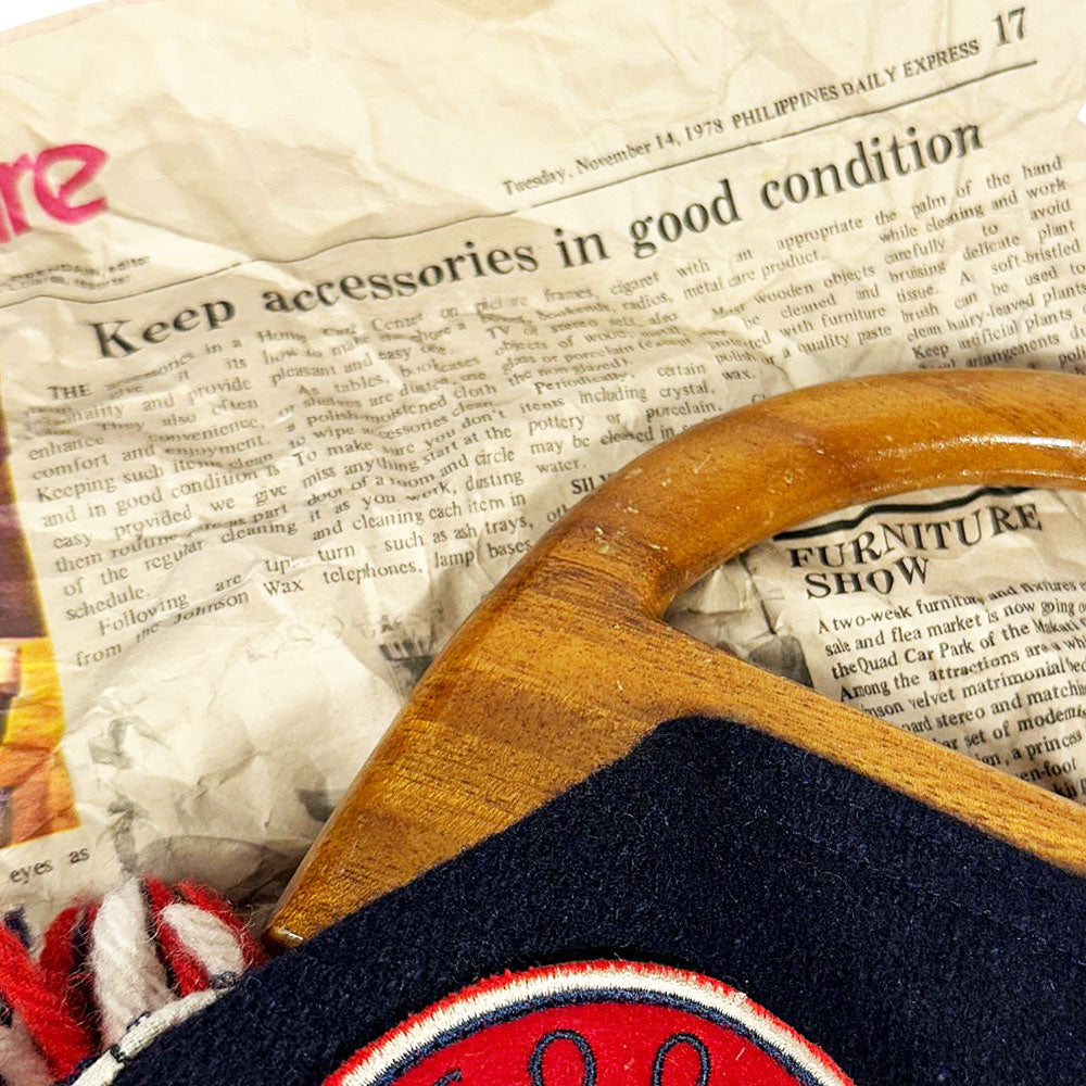 Old meets new in this fab and truly unique bag. Gia, a vintage Bermuda bag, was rescued from an estate sale. We took her home and handcrafted a new exterior for her from a varsity jacket (we kept the original pocket) and a fab fringed skirt. We kept the original bag lining and the newspaper stuffed in it from the Philippines dated 1978 (now that's vintage)! This fearless creation is truly one-of-a-kind from the shape and her wooden frame/handles to her new upcycled snap in exterior!