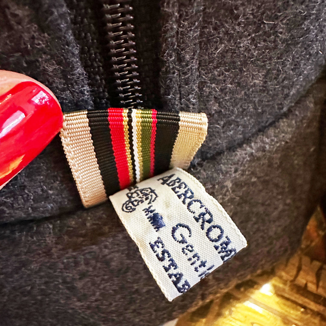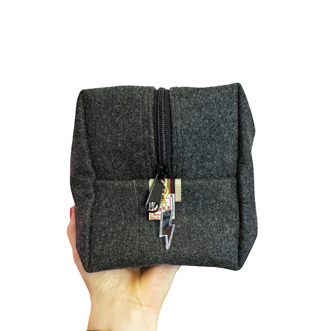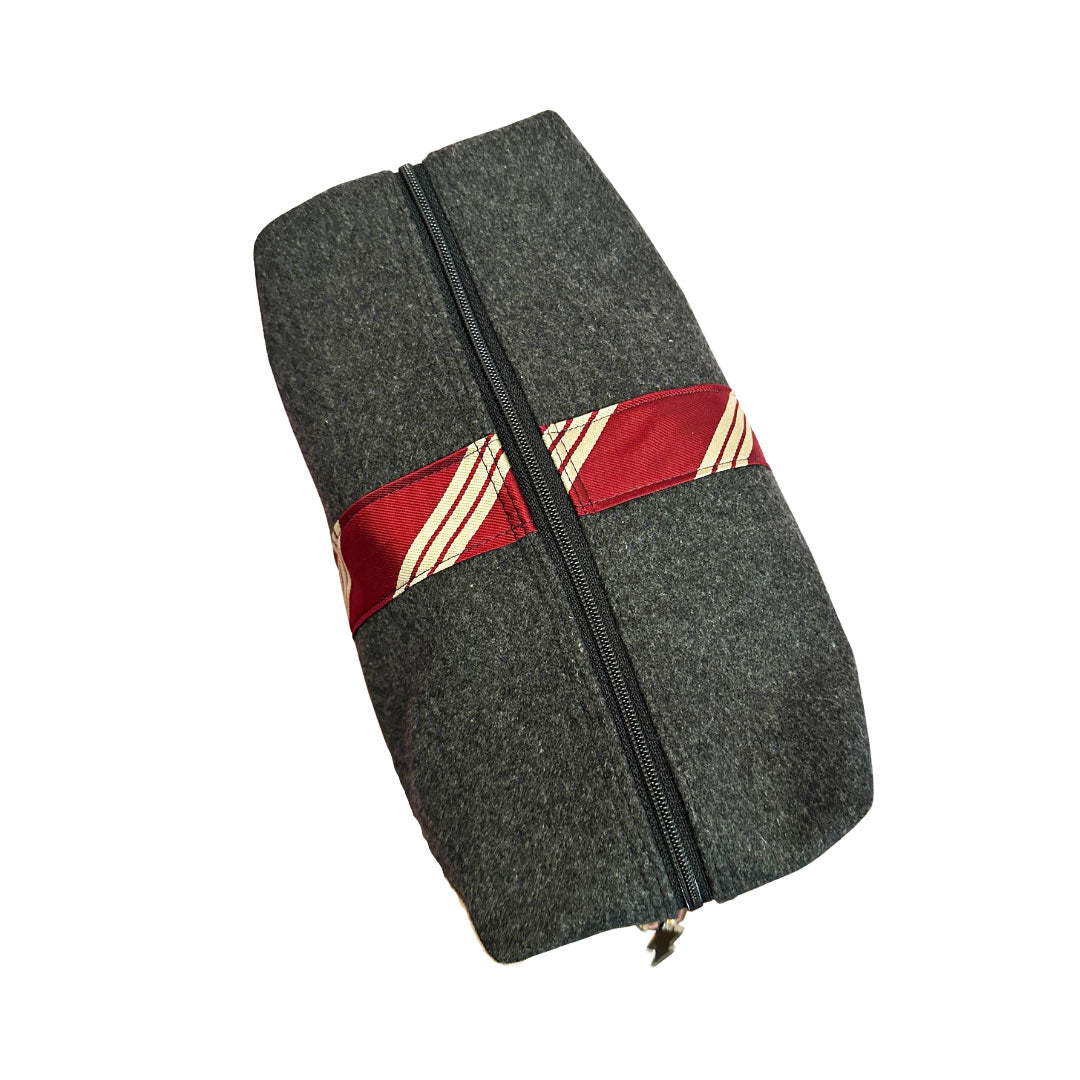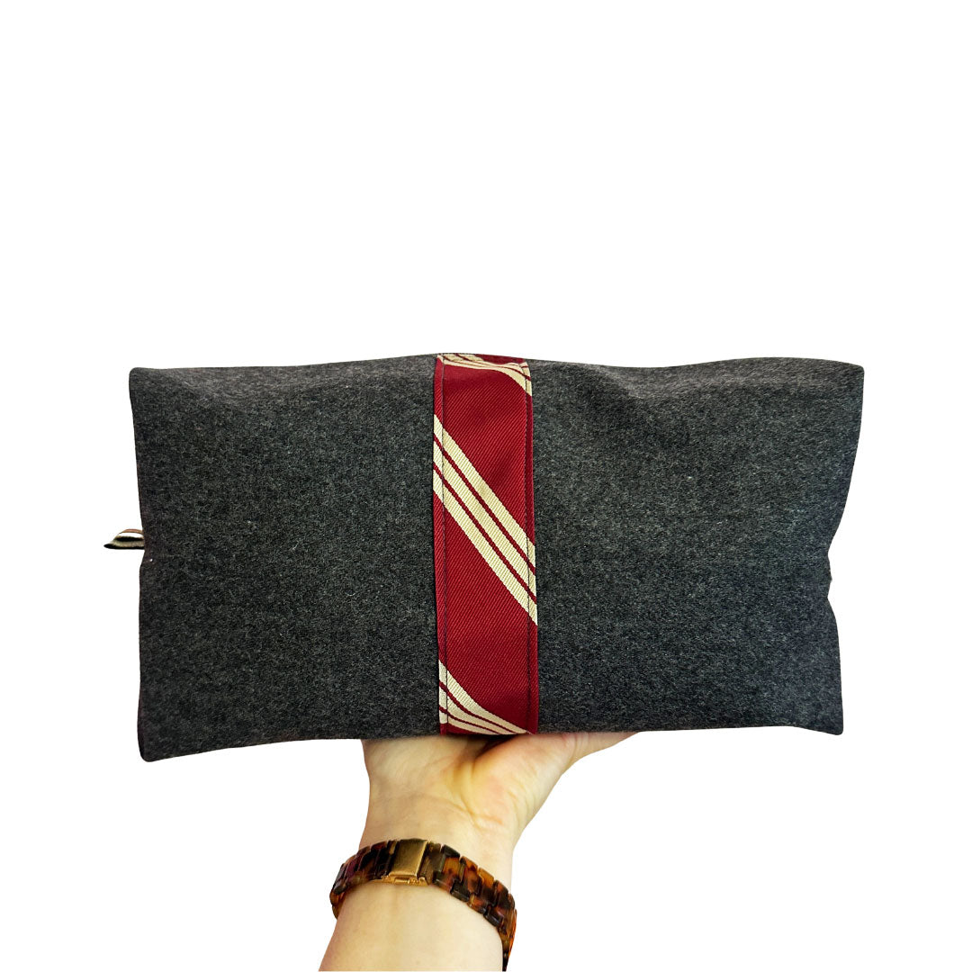 Meet the Harry biggi bag, your magical new bestie, happy to hold all your stuff while bringing a smile to your face. Meticulously handcrafted from a deconstructed pair of wool gray suit pants and a striped Abercrombie & Fitch necktie for a little extra detail (reduce, reuse, recycle- yes please!), she's truly unique like you. From her wipe-clean navy blue water proof canvas lining for those inevitable product leaks and re-enforced seams so she'll retain her good looks, she's packed with thoughtful details. She's perfect for keeping you organized on the go from travel necessities, first aide kits, tech accessories, & more.