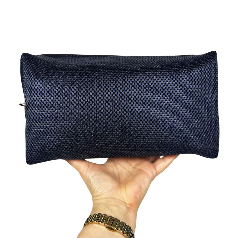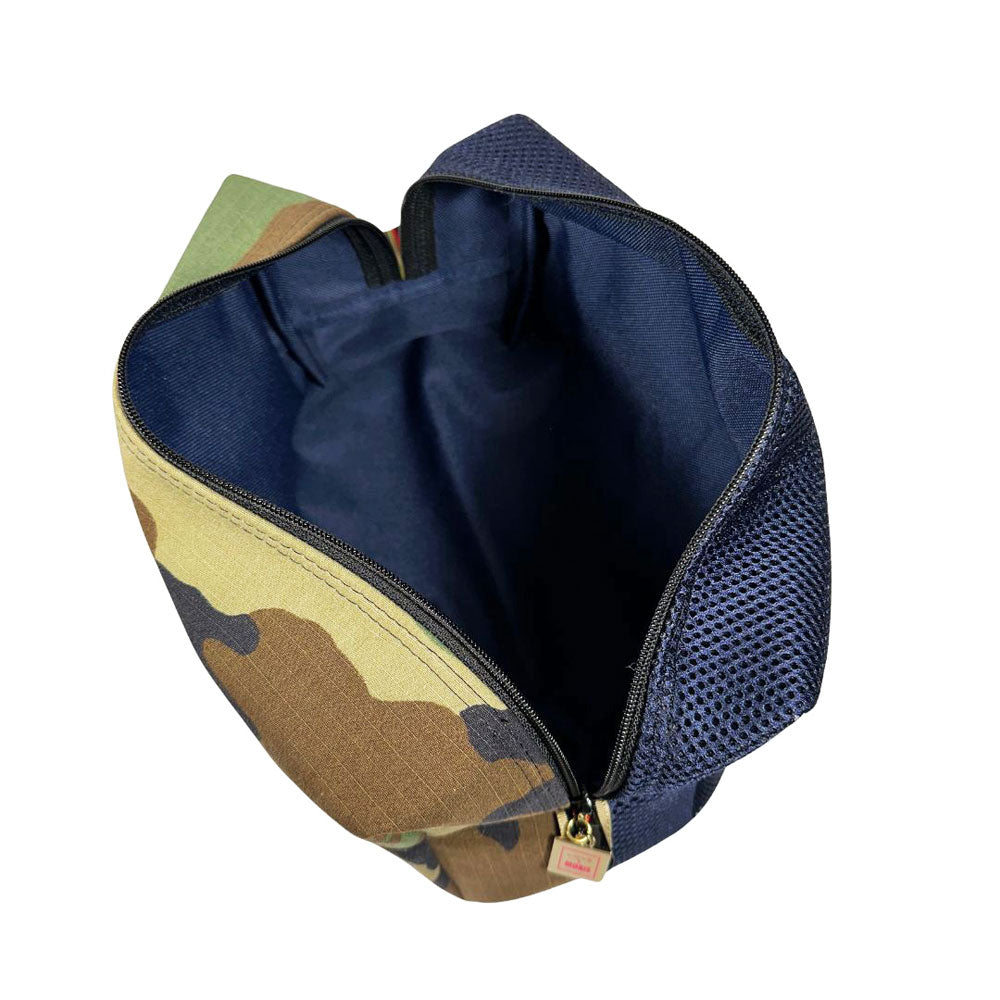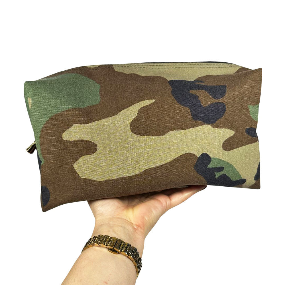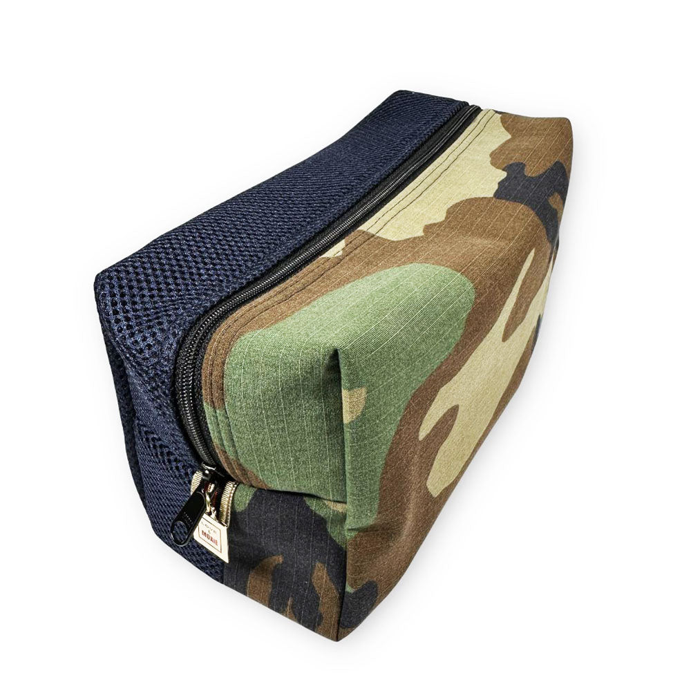Meet the two-sided Washington biggi bag, your stylish new bestie, happy to hold all your stuff while bringing a smile to your face. Meticulously handcrafted from a upcycled military jacket (reduce, reuse, recycle- yes please!) and mesh neoprene fabric, she's truly unique like you. From her wipe-clean navy blue waterproof canvas lining for those inevitable product leaks to her re-enforced seams so she'll retain her good looks, she's packed with thoughtful details. She's perfect for keeping you organized on the go from travel necessities, first aide kits, tech accessories, & more.