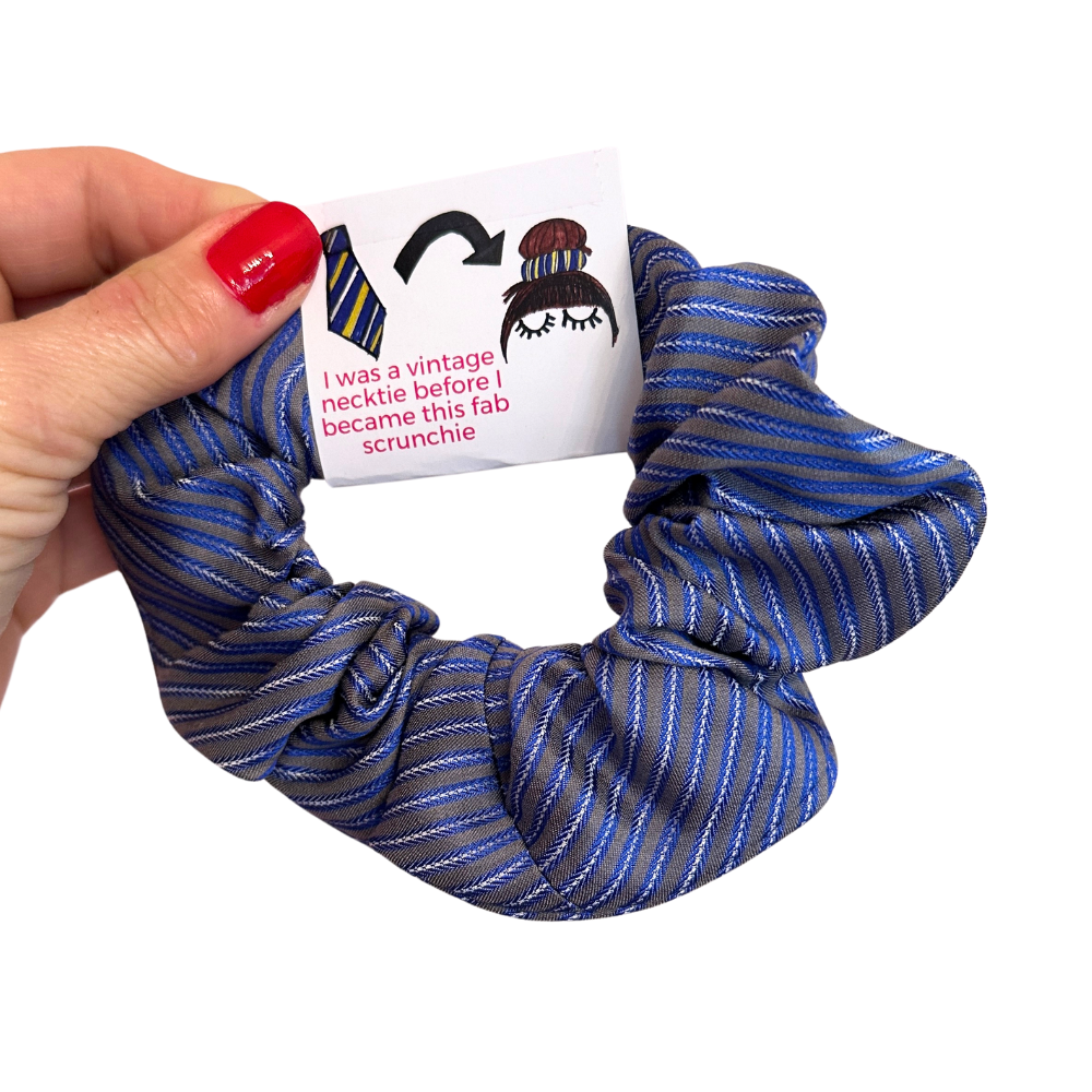Looking to tame your flyaways in style? Look no further, our one-of-a-kind scrunchie has you covered. Handcrafted from a fab vintage necktie and durable thick elastic (so it will stay in place), it'll make a statement holding up your hair or on your wrist. Best part, it's silk so it'll easily come out without snagging your hair.