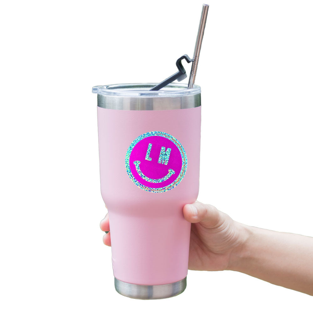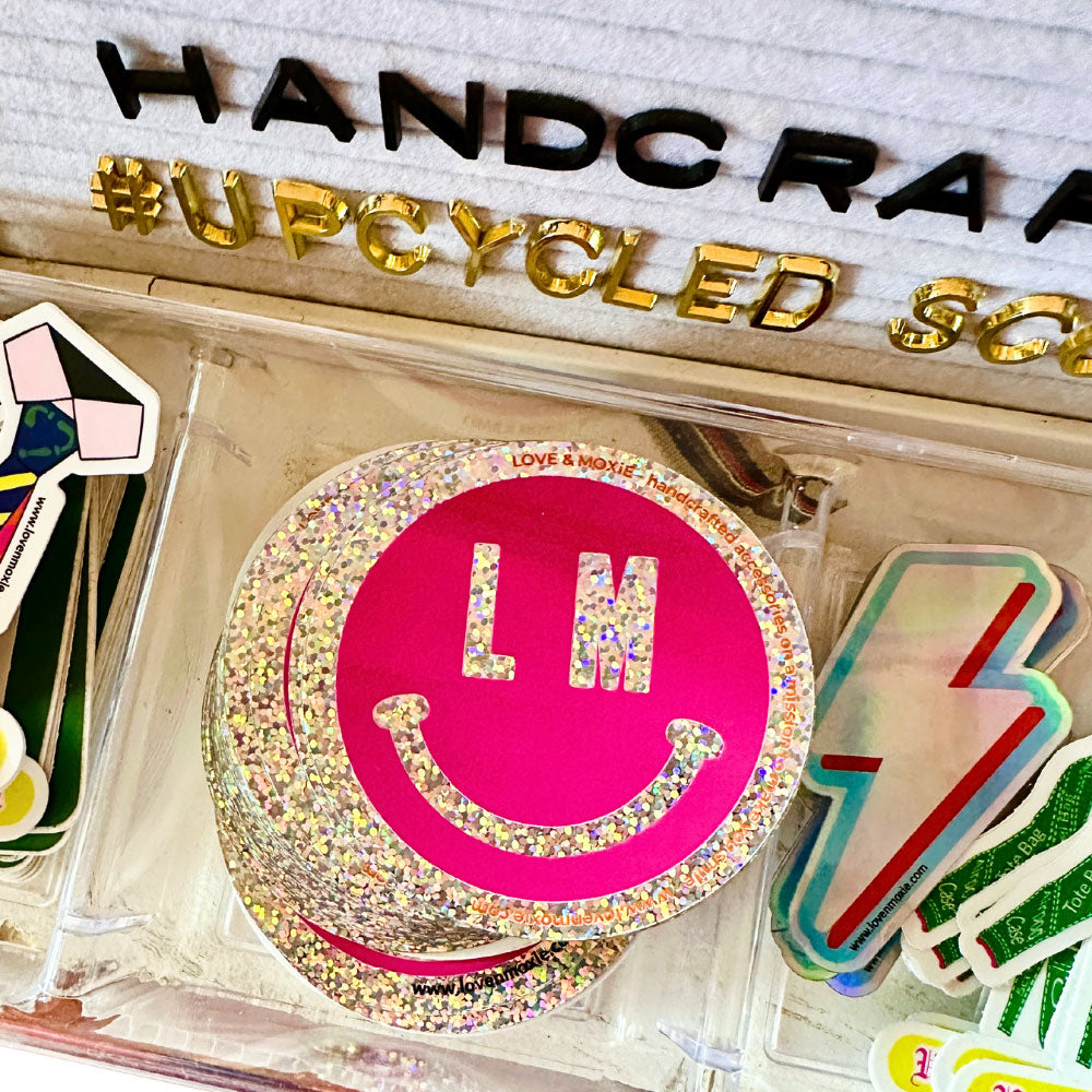 Add some flare to your favorite tumbler, notebook, laptop, or any flat surface that needs a little extra sparkle or pizzazz with our L&M smiley glitter sticker . . . all while showing some love to your favorite small biz! Come on, add a sticker (or 5) to that cart— you know you want to!