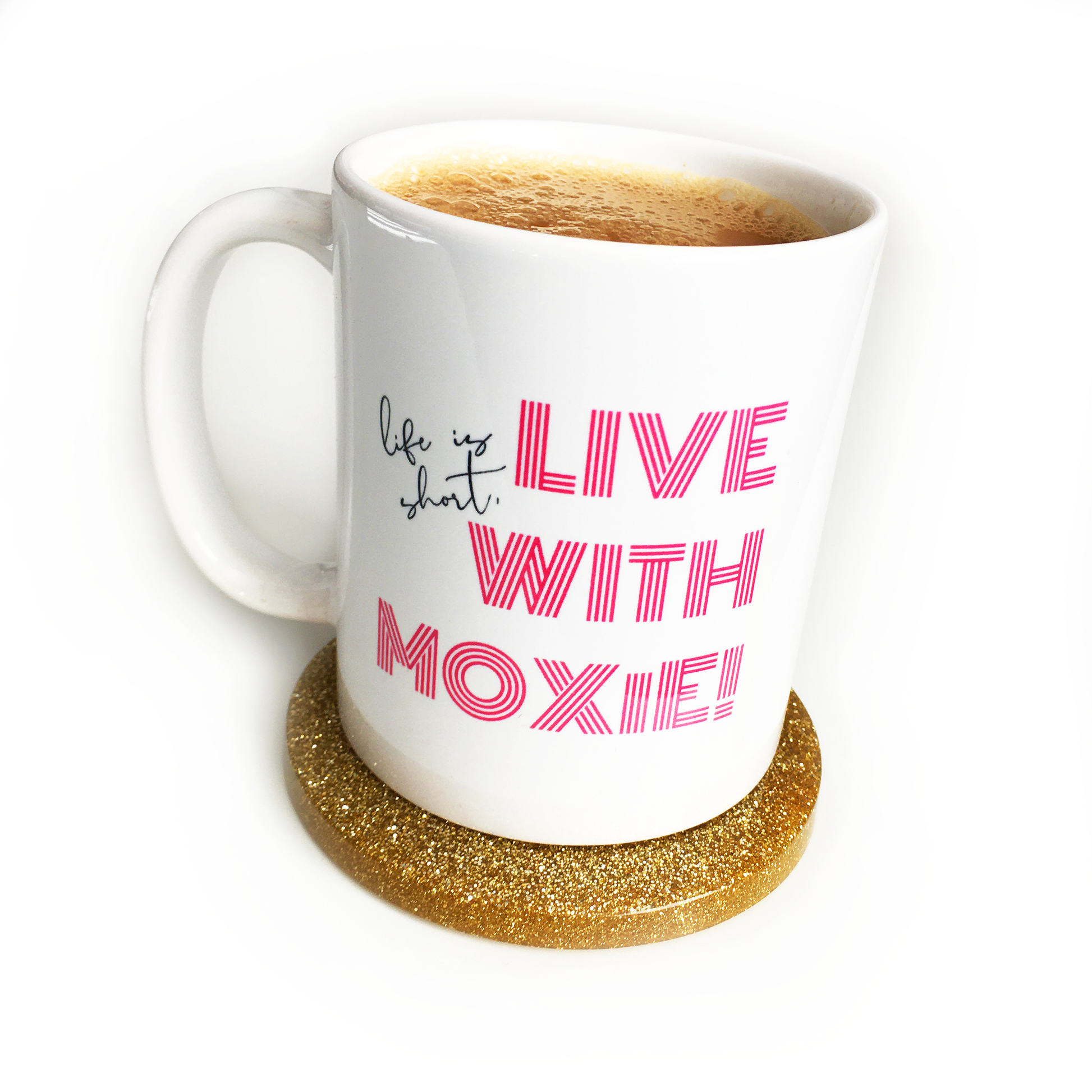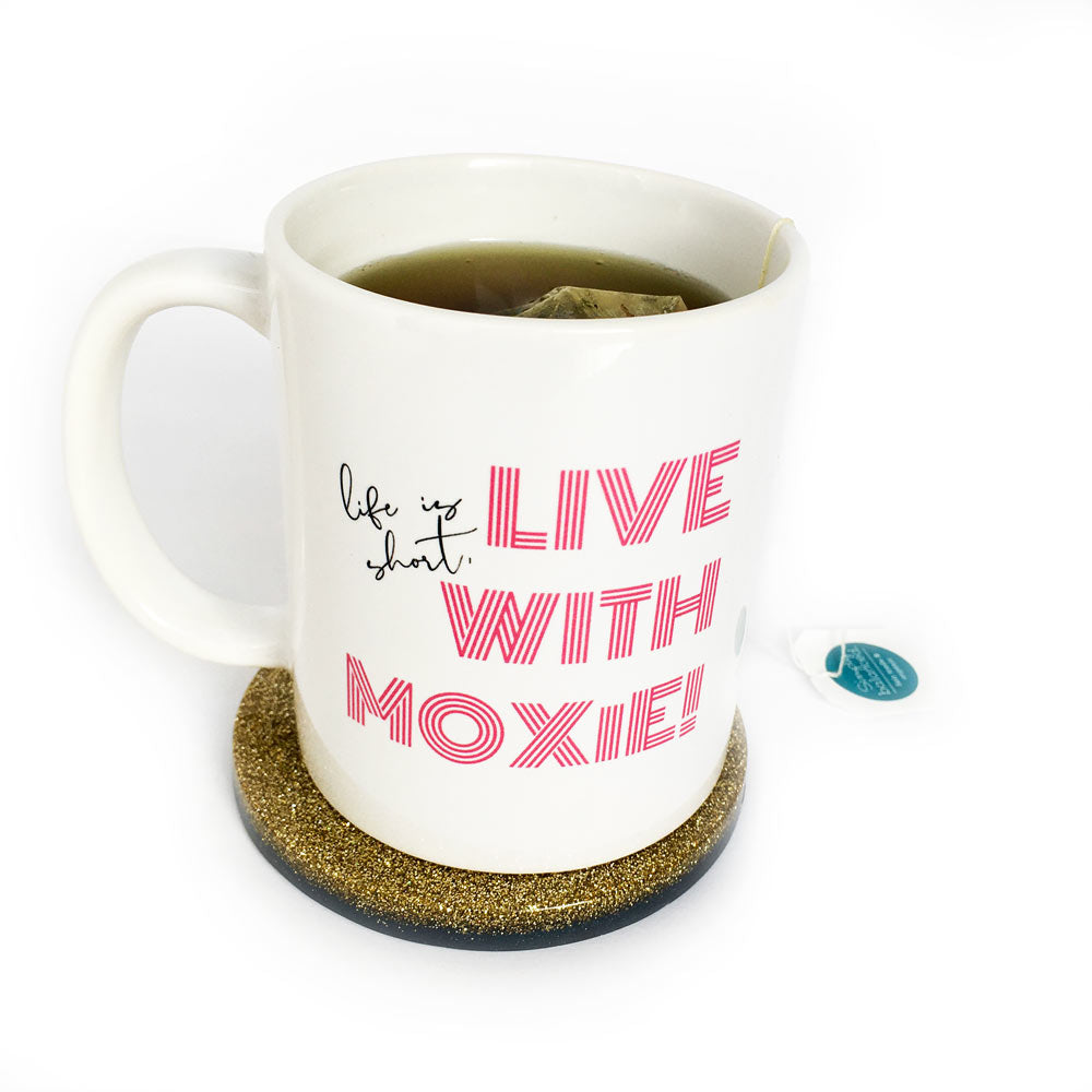 Start mornings off on the right note with this spunky mug. Need daily inspiration? Fill it with pens and pencils and place on your desk. This high-quality mug features the graphic "life is short, live with moxie!" in black and pink on the front and the LOVE & MOXiE logo on the back.