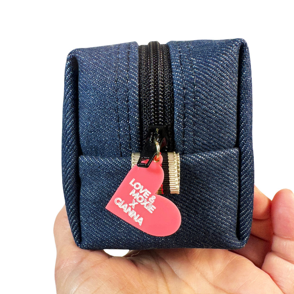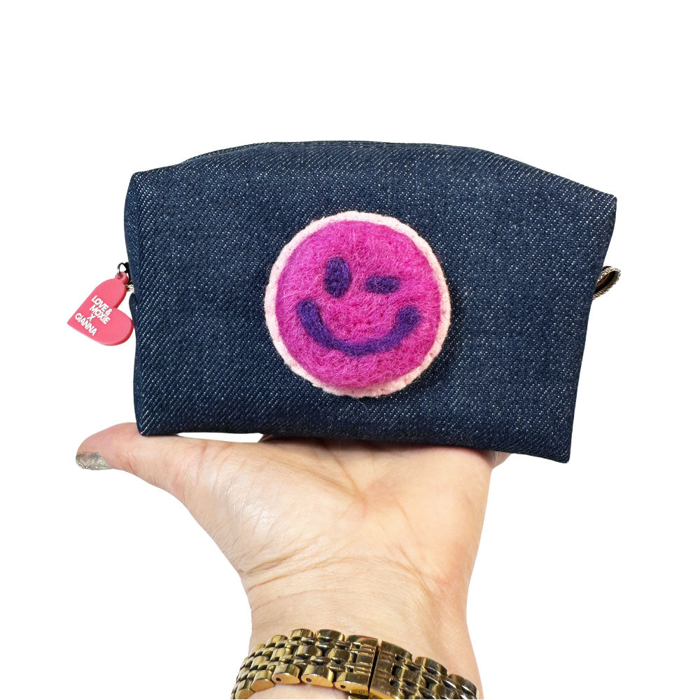 Don't let smiley Miley's small size fool you, she might be mini but she’s mighty in both style and function. She's handcrafted from upcycled denim and embellished with a ah-dorably felted smiley, handcrafted by local artist and student Gianna Smith. . . Not to mention her fabulous wipe-clean waterproof canvas lining (yay, no more grimy bag bottom). She’s great for travel, tech accessories, jewelry, or medications. Use her as a small clutch or toss her in your current purse to corral those items that always get lost at the bottom. . . yes, we're talking about you - eye drops and lip balm!