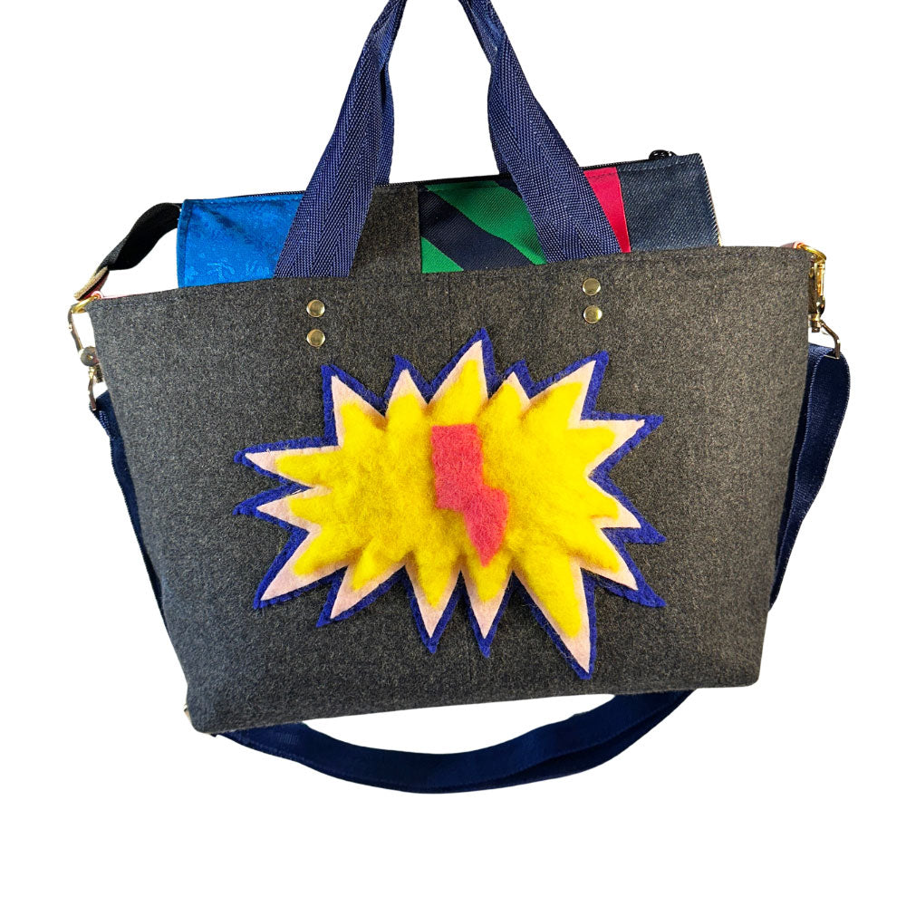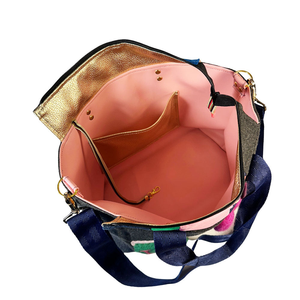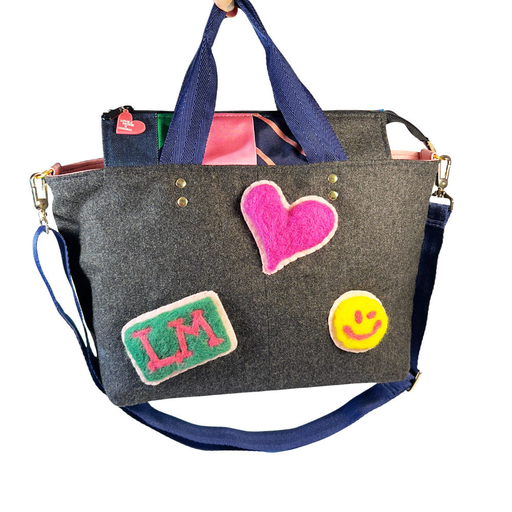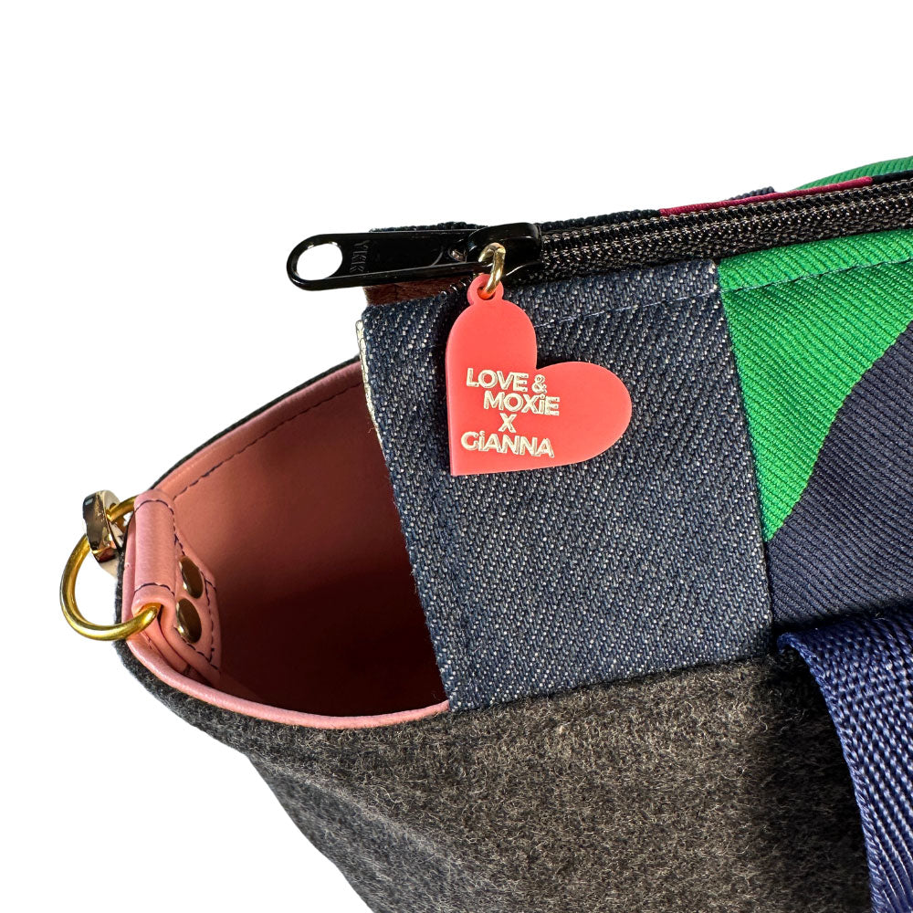 Say hello to Beverly your new bestie ready to take on a weekend getaway, commute to work, and everything in between. As always, she’s 100% handmade from upcycled wool trousers and neckties. Even better, she's decked out with ah-dorable embellishments hand-felted by local artist and student Gianna Smith. With an adjustable crossbody strap, wipe-clean vegan leather lining, integrated key leash, and brass purse feet there's no doubt she'll be corralling all your must-haves in style.