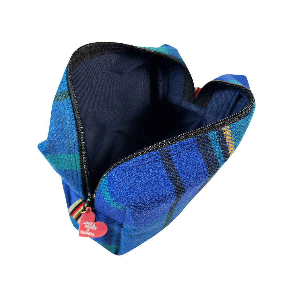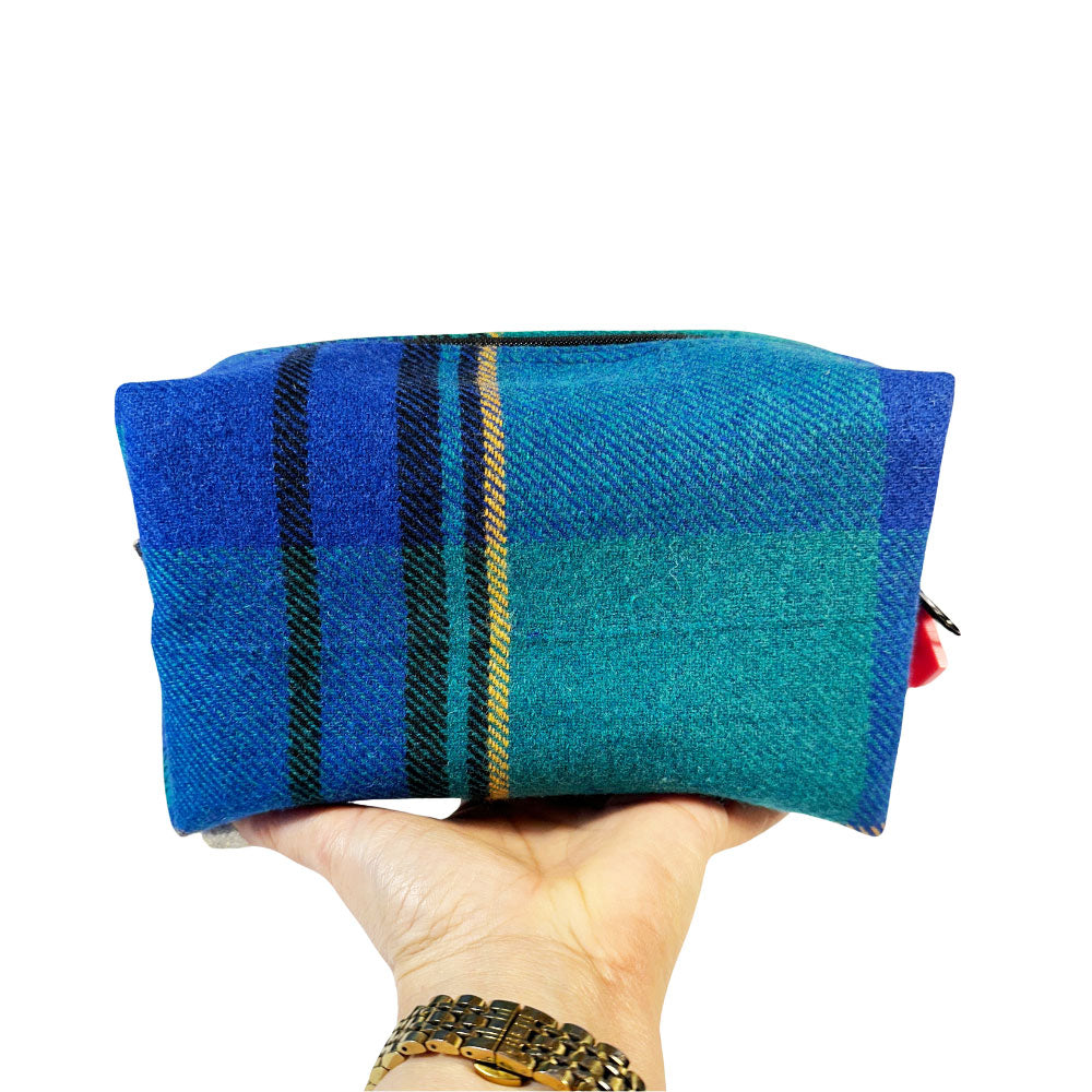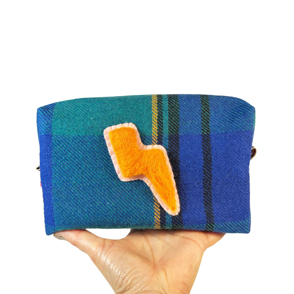 Meet Mindi, your snazzy new bestie perfect for corralling all your on-the-go goods. Her fabulously functional size makes her perfect for organizing your tech must-haves, toiletries, make-up, and more. In oh-so typical LOVE & MOXiE fashion, she is made from an upcycled wool skirt and embellished with the cutest lil lightning bolt, hand-felted by local artist and student Gianna Smith. Mindi is lined with a wipe-clean, waterproof canvas, which means no more trips on the hot mess express or grimy bottoms when your blush pops open or your contact solution takes a spill.