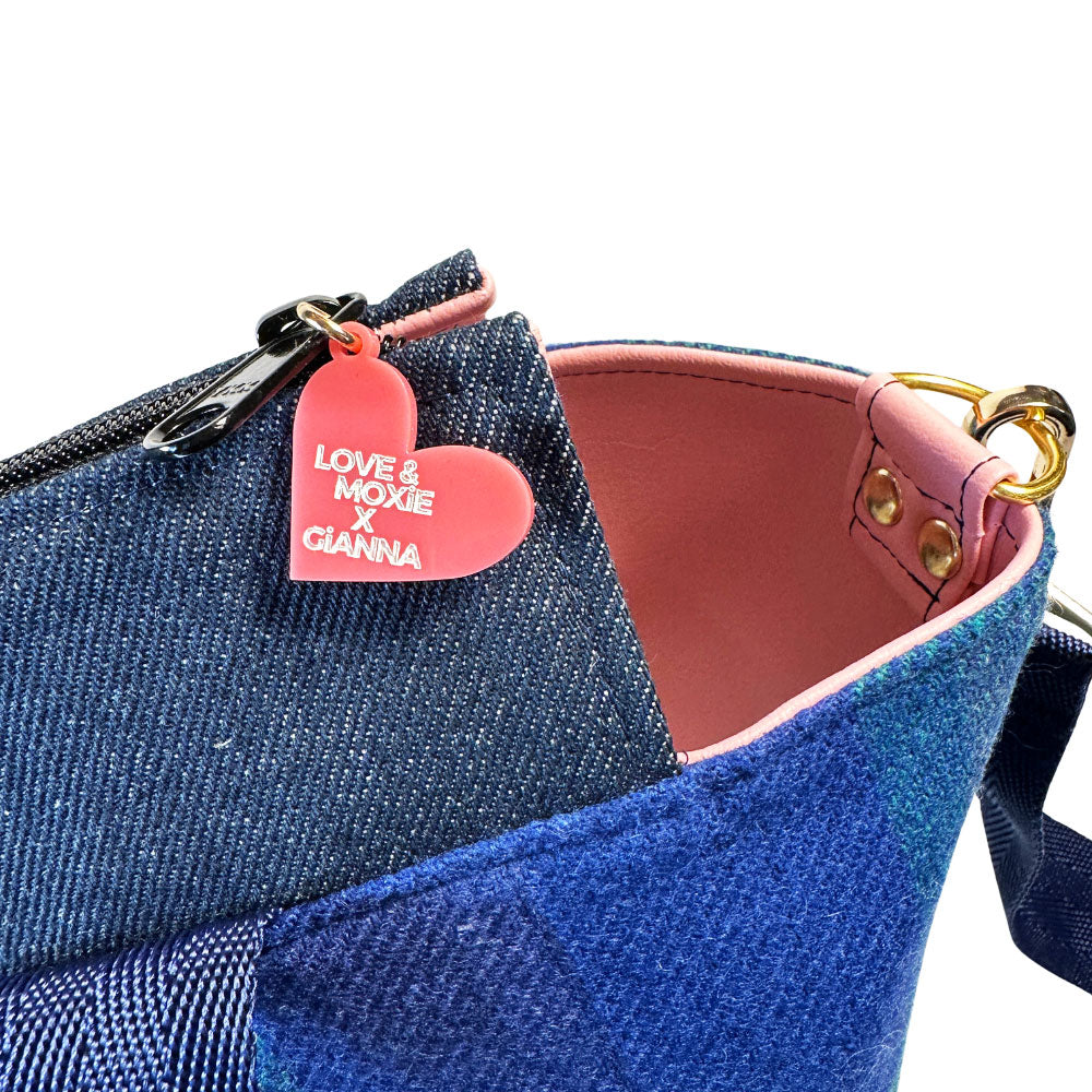Say hello to Mindi your new bestie ready to take on a weekend getaway, commute to work, and everything in between. As always, she’s 100% handmade from upcycled denim and a wool skirt. Even better, she's decked out with ah-dorable embellishments hand-felted by local artist and student Gianna Smith. With an adjustable crossbody strap, purse feet, wipe-clean pink vegan leather lining, and integrated key leash, there's no doubt she'll be corralling all your must-haves in style.