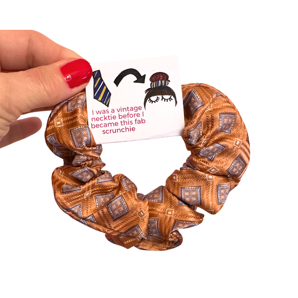 Looking to tame your flyaways in style? Look no further, our one-of-a-kind scrunchie has you covered. Handcrafted from a fab vintage necktie and durable thick elastic (so it will stay in place), it'll make a statement holding up your hair or on your wrist. Best part, it's silk so it'll easily come out without snagging your hair.
