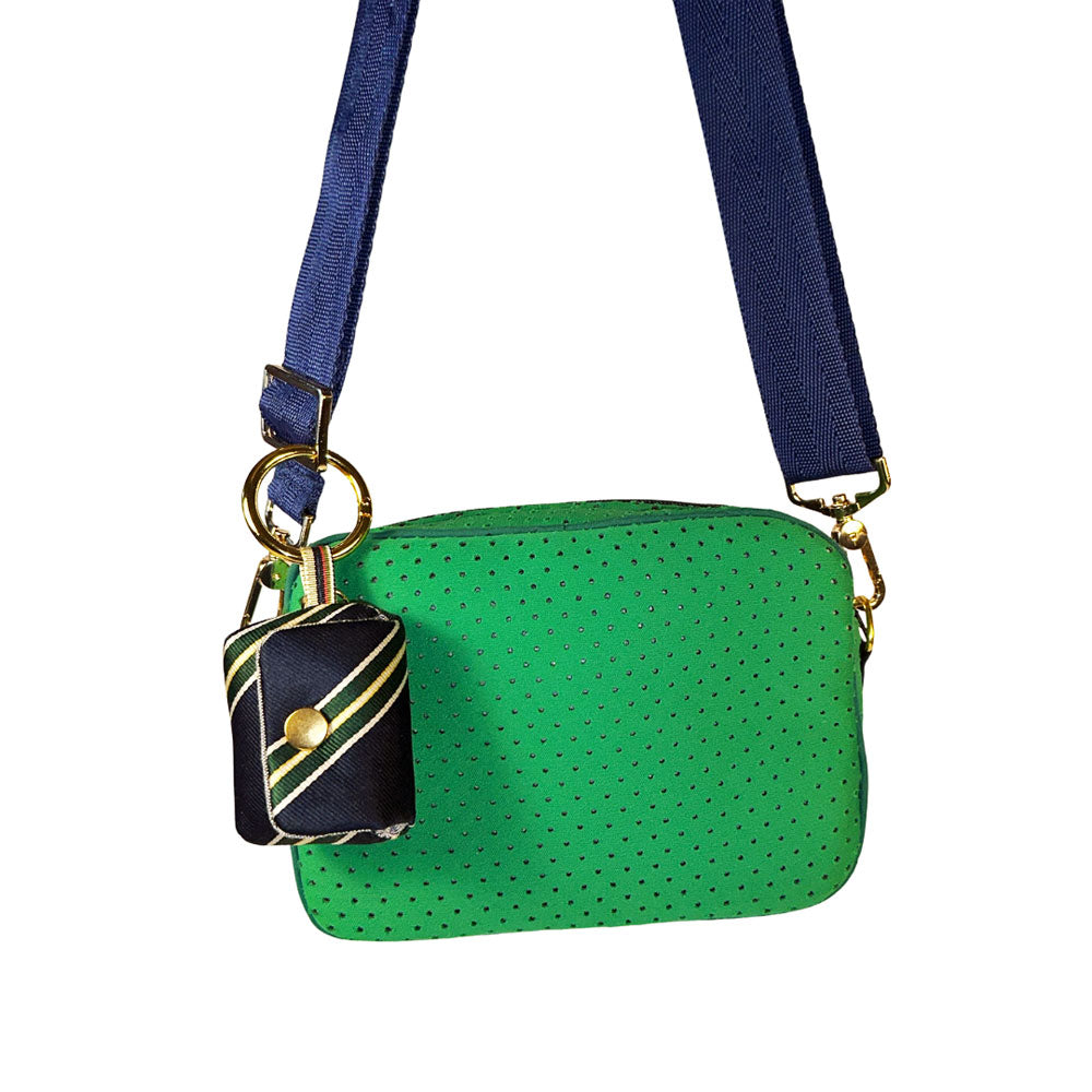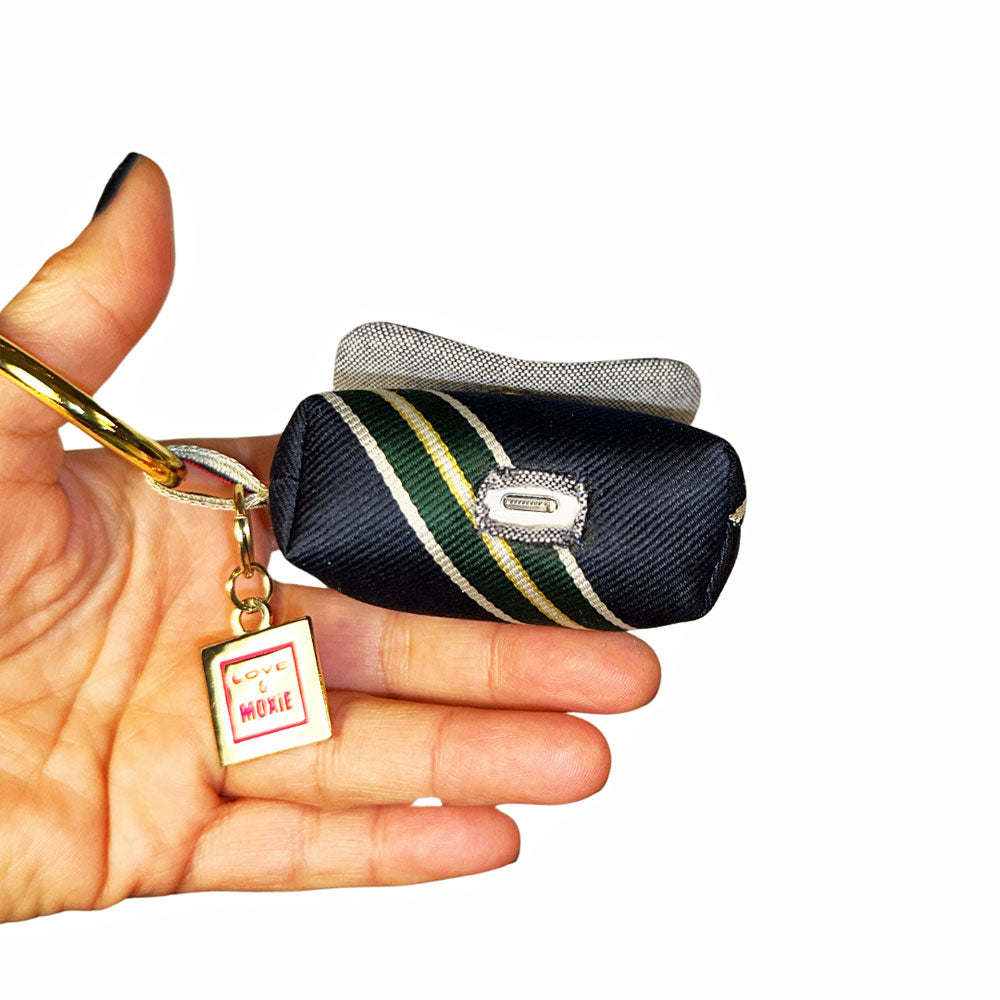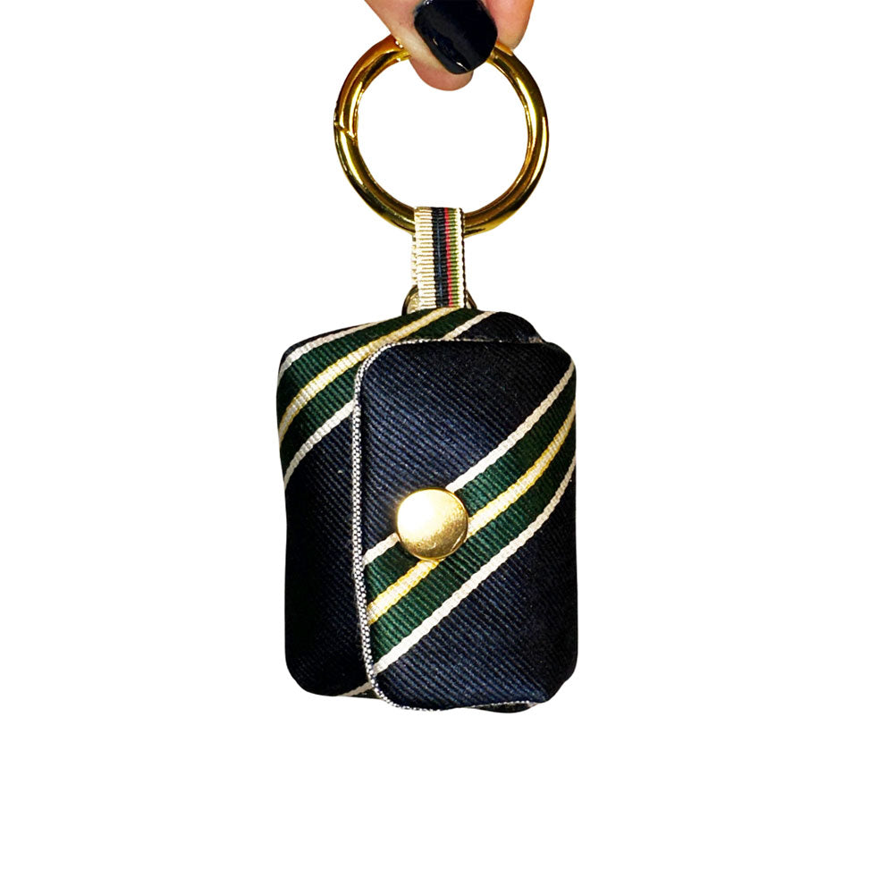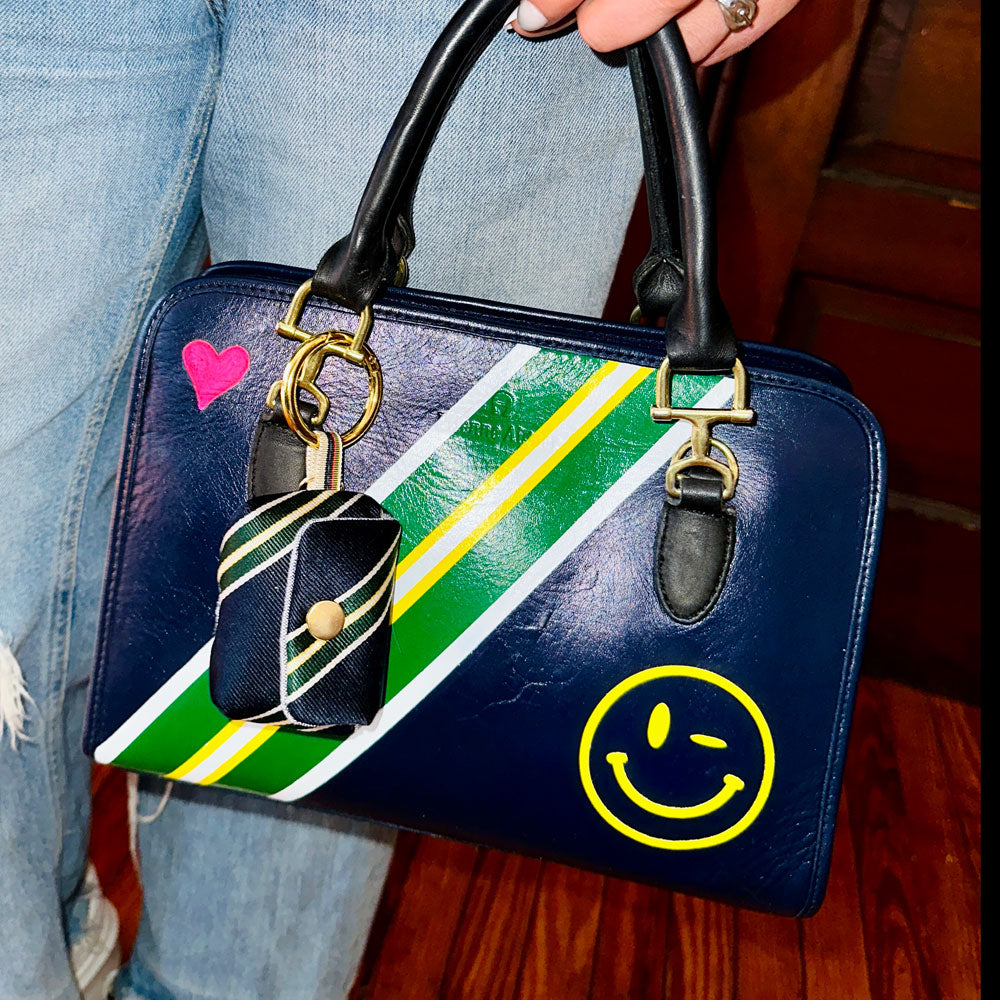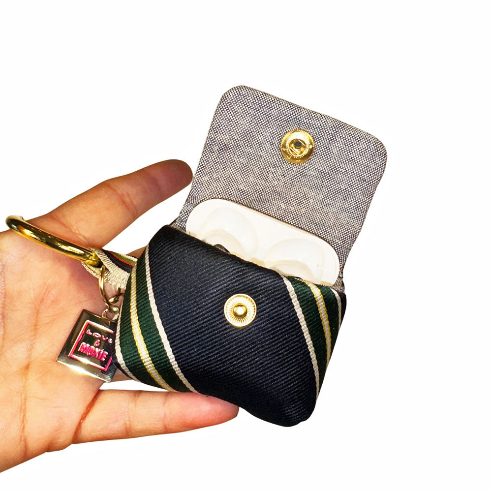 Meet Mona, your fabulous new bestie that keeps your AirPods at your fingertips in style. Mona is truly one-of-a-kind (like you!) and meticulously handcrafted from a deconstructed, sporty necktie. She's also got a soft, foam padding so your pods will stay safe and sound, a clip and go clasp so she's always at the ready and a charging port so you don't have to take your AirPods out when they need a lil' juice!