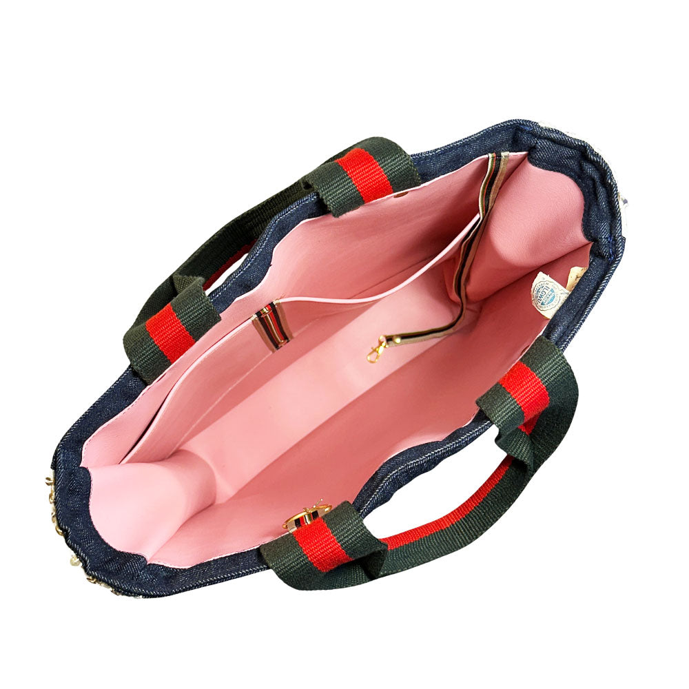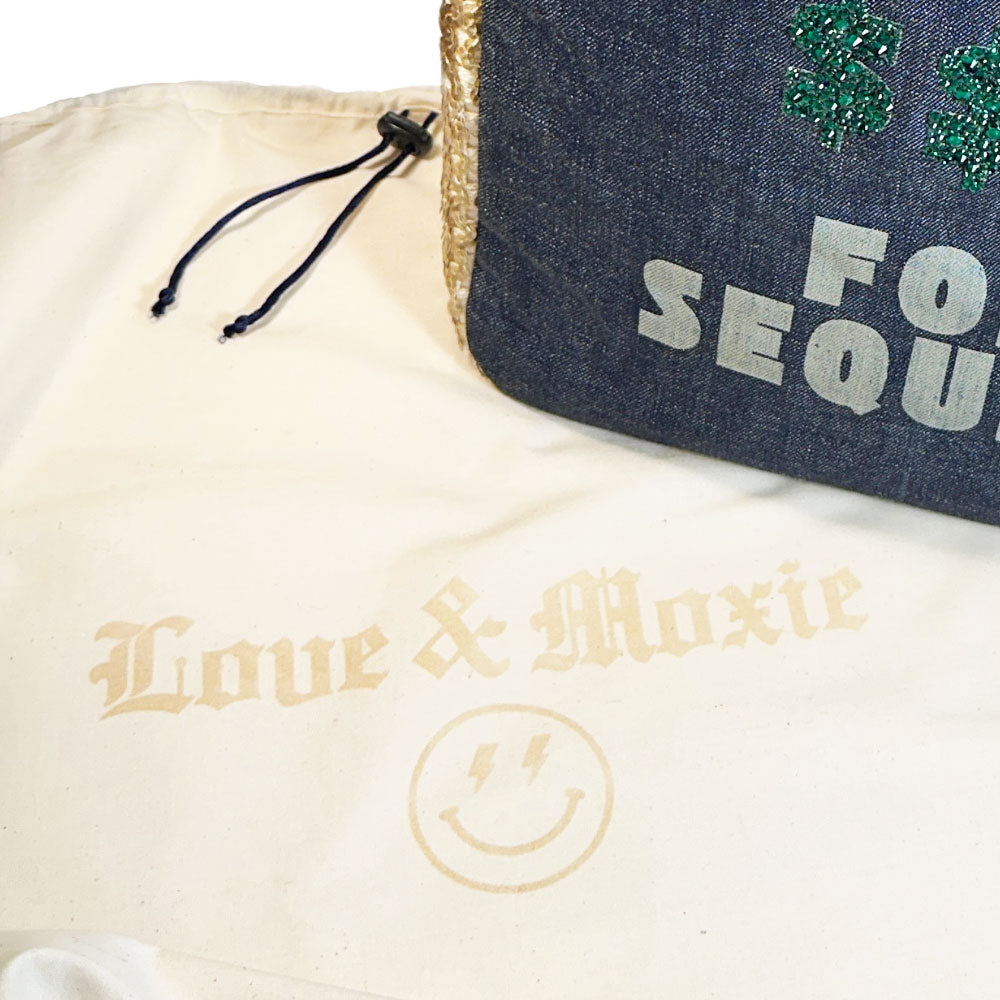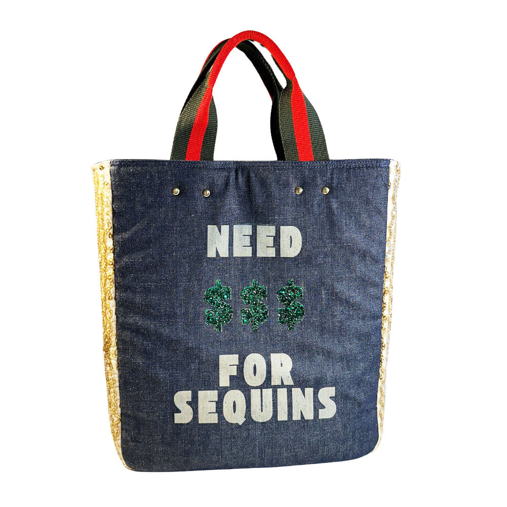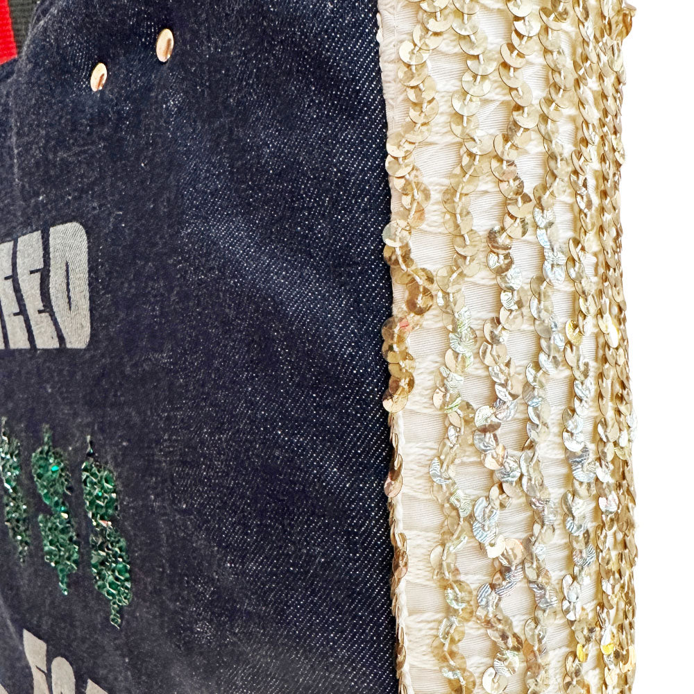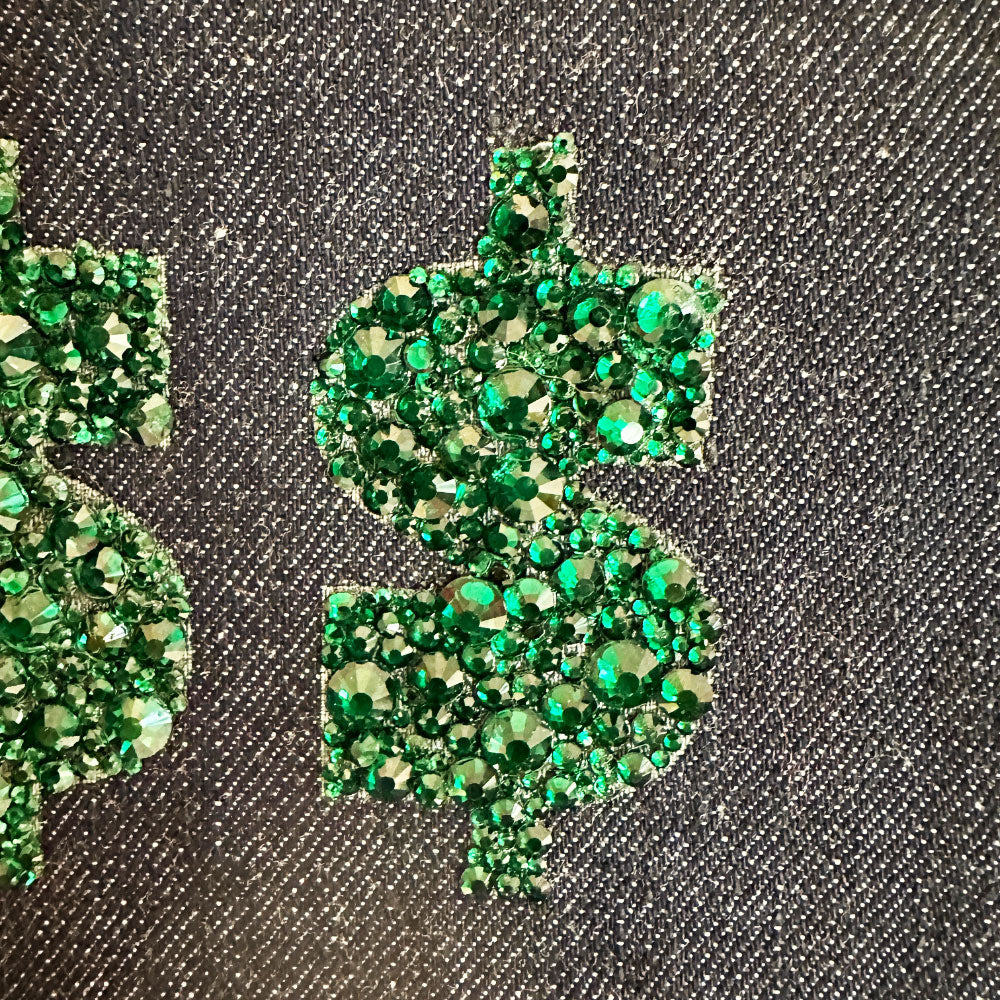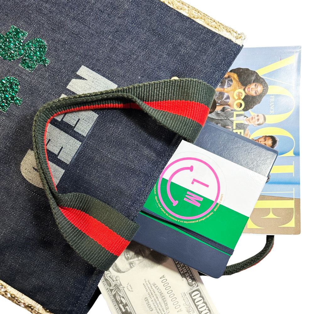 Buy this bag of course! After all, her latest book is entitled, Behind the Seams: My Life in Rhinestones. Handcrafted with the same spunk and vigor as her name sake, Dolly Parton, this fab bag isn't shy about calling it as it is and will hold all your stuff while you conquer the world (... or the day) in blinged out style. This fearless creation had a previous life as a 1960's gold sequin dress complete with original International Ladies Garment Workers Union and style number labels before she was carefully deconstructed and married with laser engraved classic denim transforming her into her current state complete with sturdy rolled handles, brass feet and gold rivet detailing. Not fancy enough?! OK, we got you with her meticulously hand-set (approx 8 hours to complete) sparkly emerald green rhinestones on both sides! No doubt her looks reign supreme, but she's super helpful too. She'll make your leaks and spills disappear with her wipe-clean pink vegan leather lining, have your keys at the ready with her integrated key leash, and corral your phone & wallet inside her slit pockets. How can you resist?!