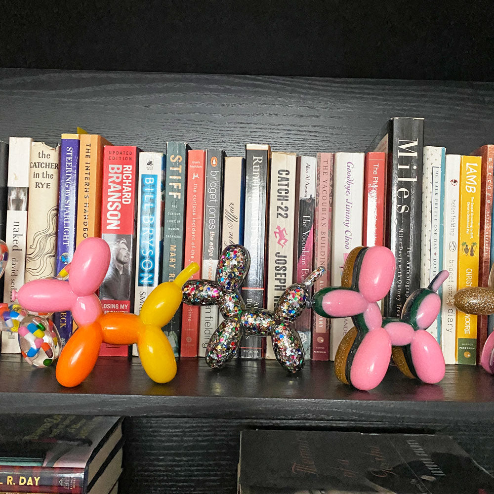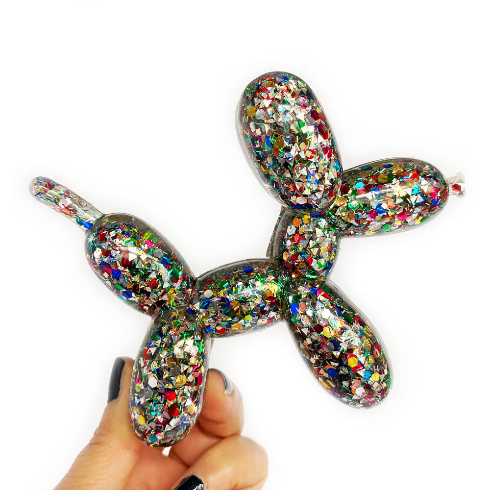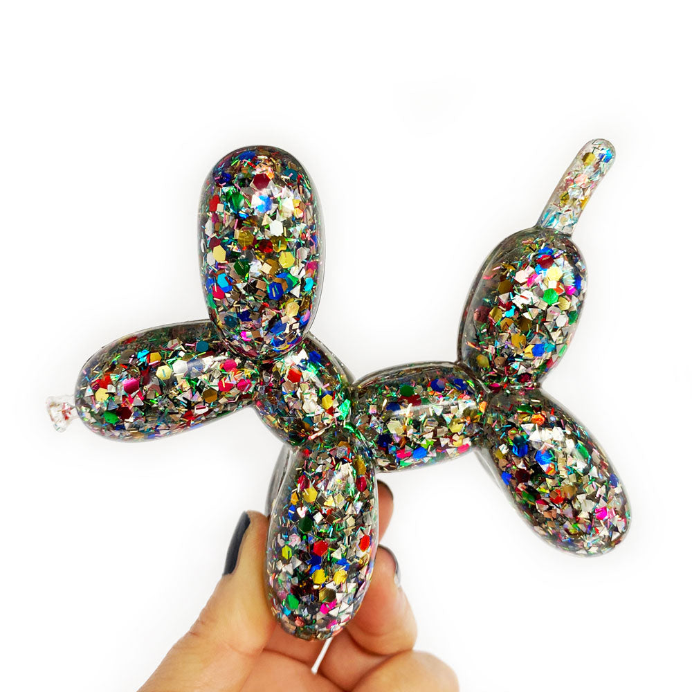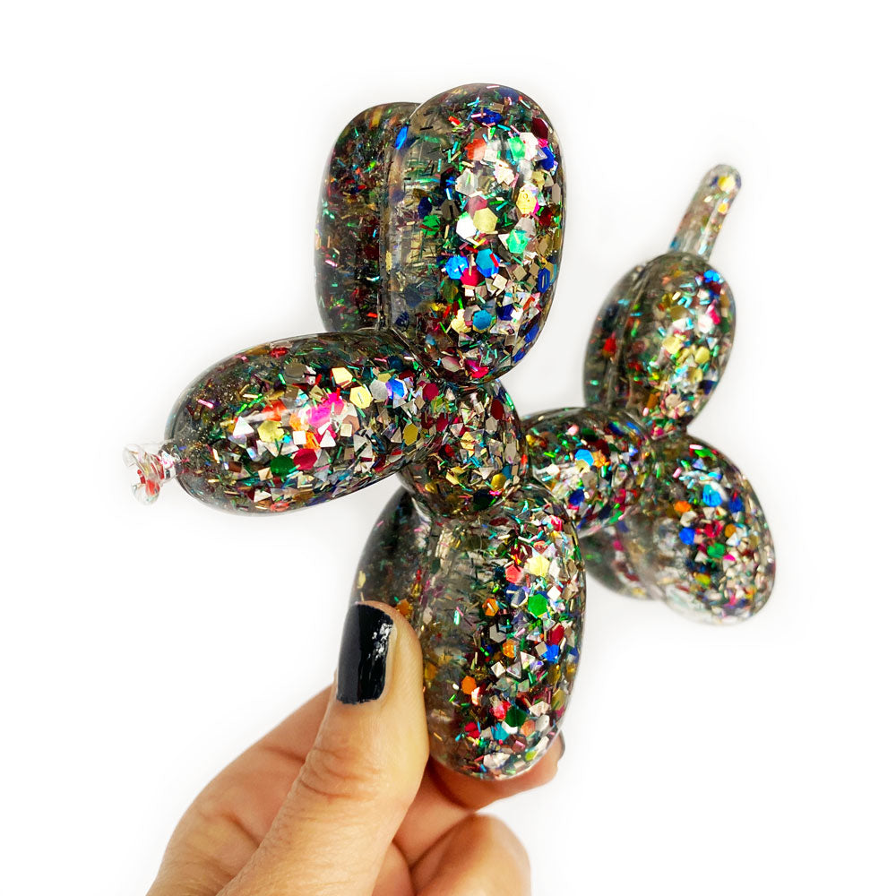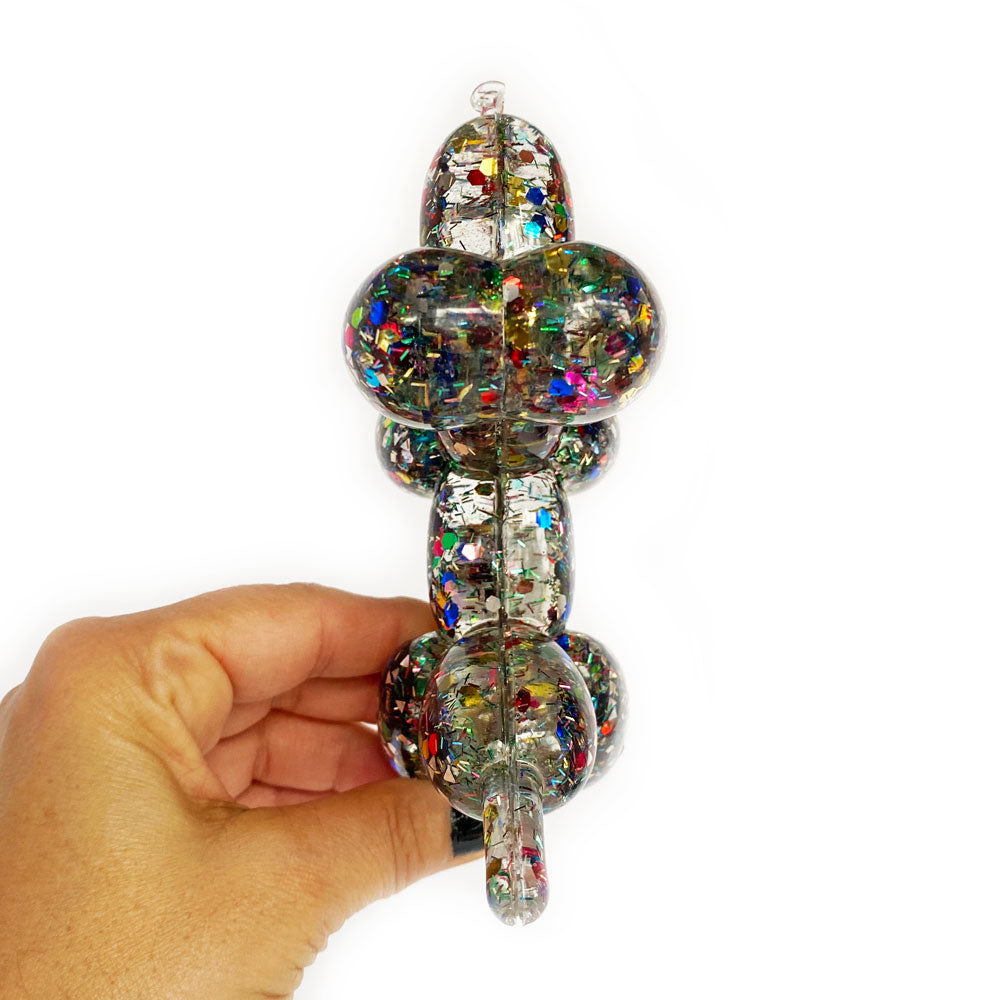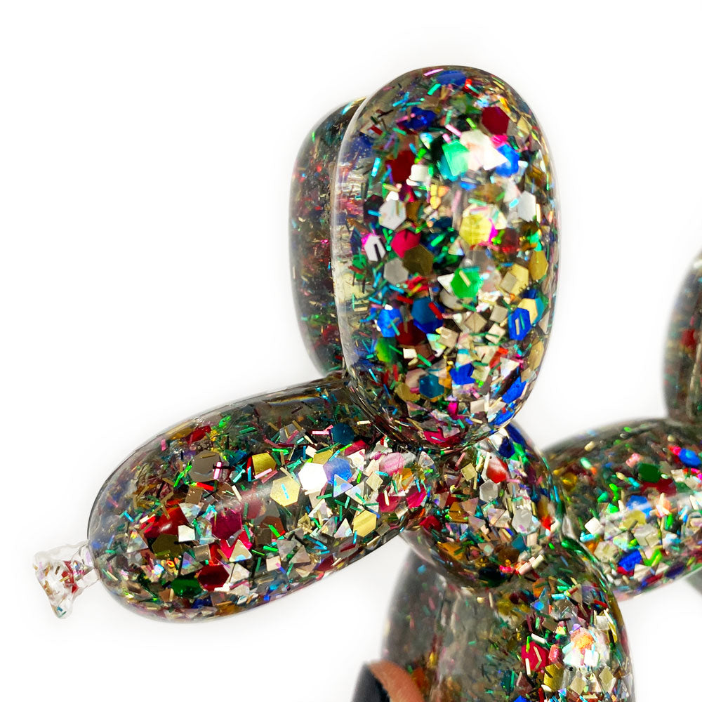 Add a touch of whimsy to your home and a smile to your face with this one-of-a-kind timeless balloon dog sculpture. Meticulously handcrafted of resin and sparkly rainbow confetti, she captivates on a coffee table or perched on a shelf. Plus she's full of substance, with her intentionally crafted slightly imperfect nose she celebrates the concept of wabi-sabi - finding the beauty in the imperfect and as a dog, representing friendship, loyalty, love, and protection she makes a thoughtful gift. This delightful canine won't have to bark to get noticed.