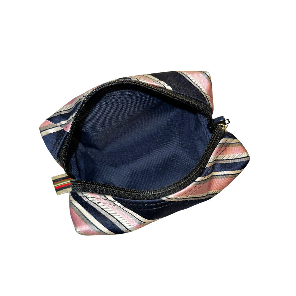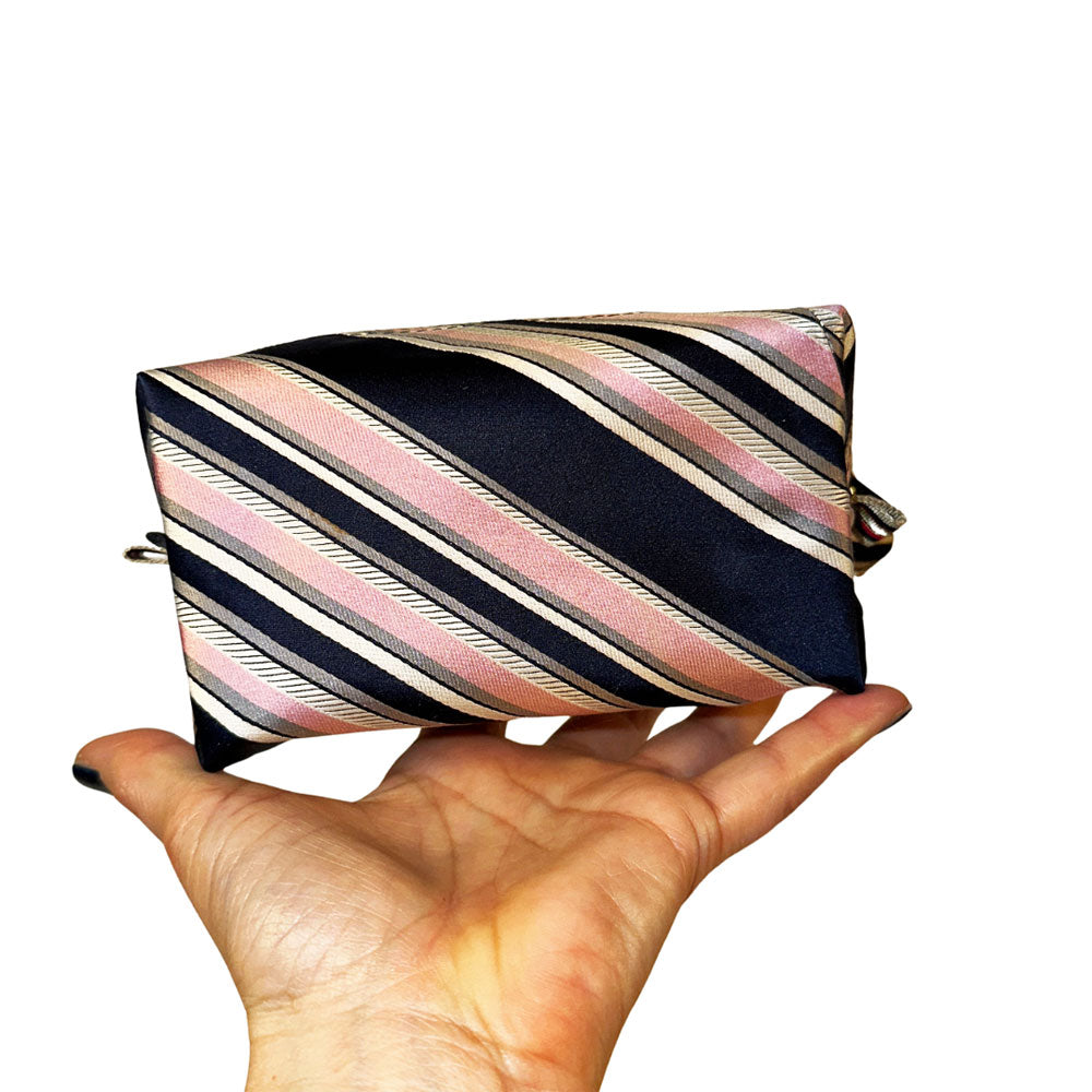 Don't let Pearl’s small size fool you, there's no denying she's boasting both style and function. She's handcrafted from a oh-so snazzy pink, navy & silver striped upcycled tie (including its original label), not to mention her wipe-clean waterproof canvas lining (yay, no more grimy bag bottoms).