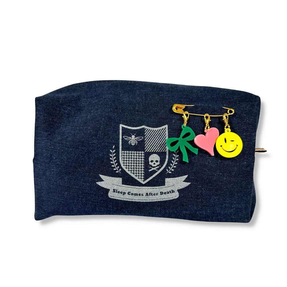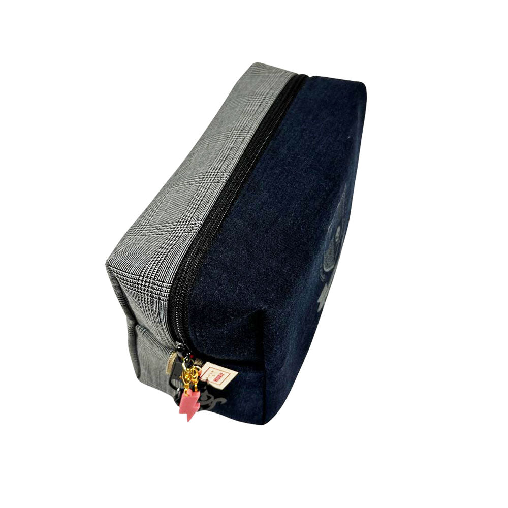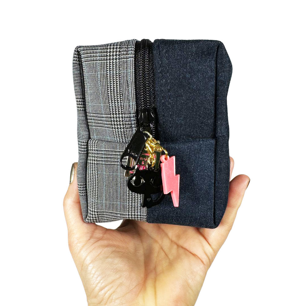 Meet our newest midi bag cutie, your new bestie perfect for corralling all your on-the-go goods. Her fabulously functional size makes her perfect for organizing your tech must-haves, toiletries, make-up, and more. In oh-so typical LOVE & MOXiE fashion, she is made from 100% upcycled materials — jeans (which we laser engraved with our version of the SCAD crest) and a glen plaid suit. Even better, she's is lined with a wipe-clean, waterproof canvas, which means no more trips on the hot mess express or grimy bottoms when your blush pops open or your contact solution takes a spill.