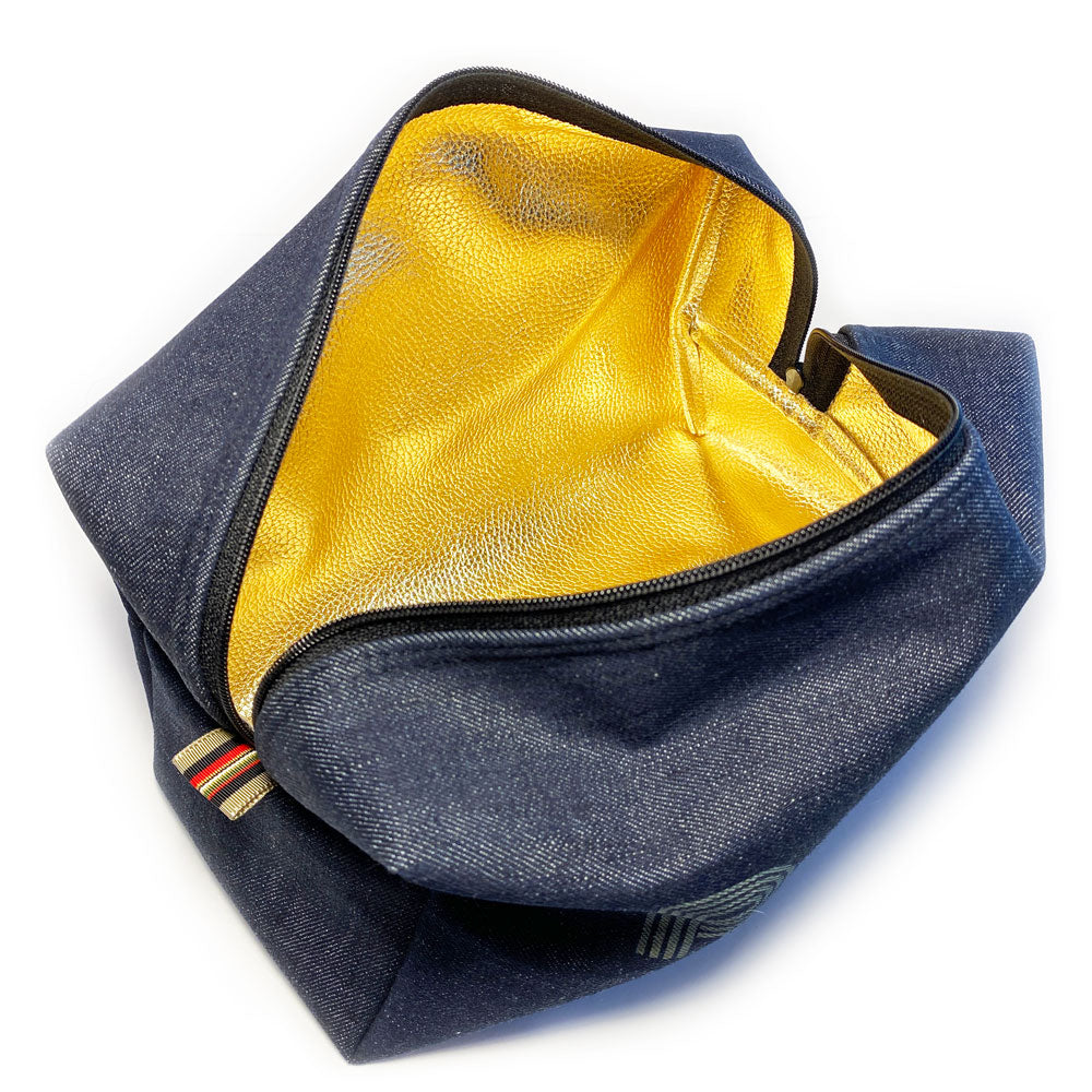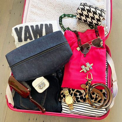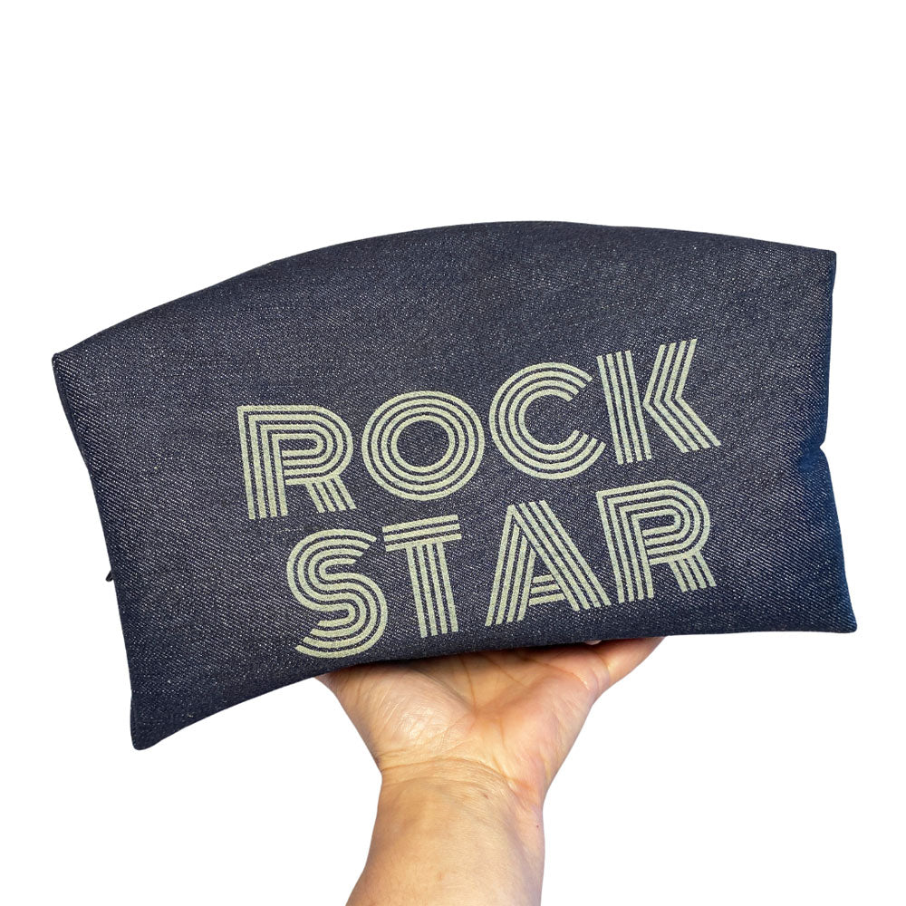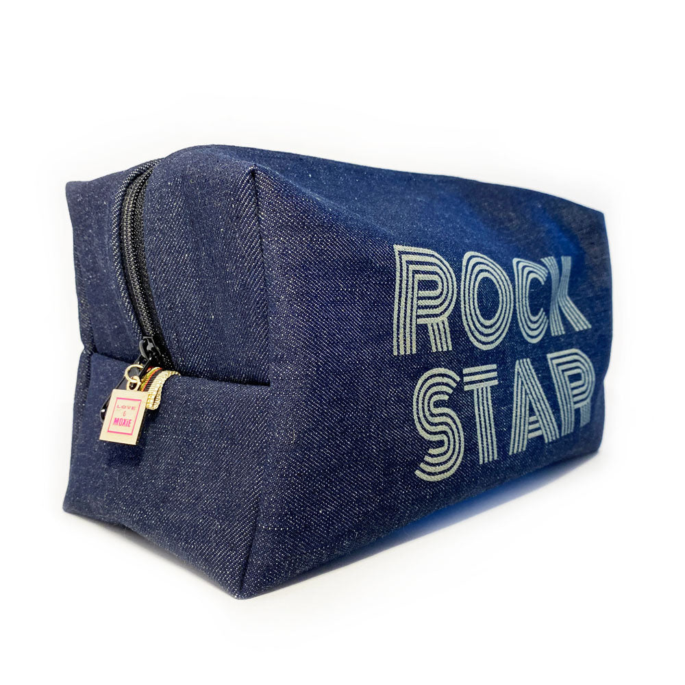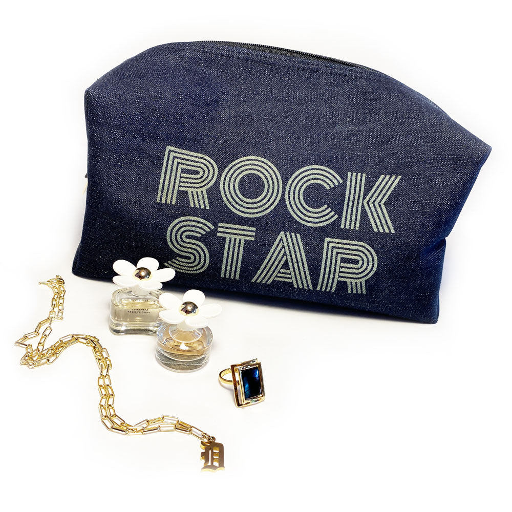You might not be a rock star but you'll feel like one with this cheeky & functional travel bag. Meticulously handcrafted of 100% USA cotton denim and laser engraved in-house with a fun graphic font, she'll accommodate all your needs with her flexible boxy shape, and her large opening and long zipper pull make it easy to get to your stuff. She's packed with thoughtful details too like double row top stitching, sporty grosgrain ribbon side tabs, wipe-clean vegan leather lining for those inevitable product leaks, and re-enforced covered seams ensuring she'll hold up to whatever you dish out. She's ideal for traveling, but is also perfect for corralling tech accessories & cords, as a stylish first aide kit, mommy kit, & more. Rock on!