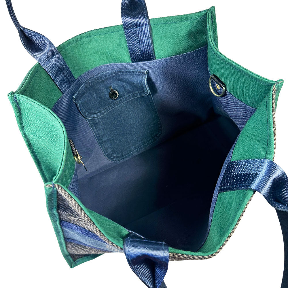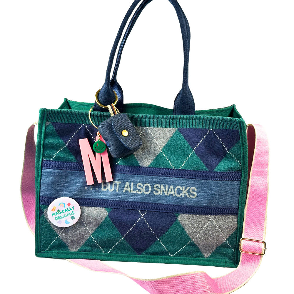 Say hello to Siobhan, your new happy-go-lucky BFF, she'll hold all your stuff while adding classic style to any fit. Previously a classic herringbone blazer and an argyle sweater, she was carefully deconstructed and married with laser engraved jeans for her cheeky graphic detailing and vintage pants to cover her seat belt webbing handles, before transforming into her current state complete with inside button closure pocket from the jeans and d-rings to clip your keys to or convert her to a crossbody bag. Siobhan isn't just a pretty face, she's a true friend. She'll make your leaks and spills disappear with her wipe-clean waterproof canvas lining. Come on, admit it, you wanna be friends ;)