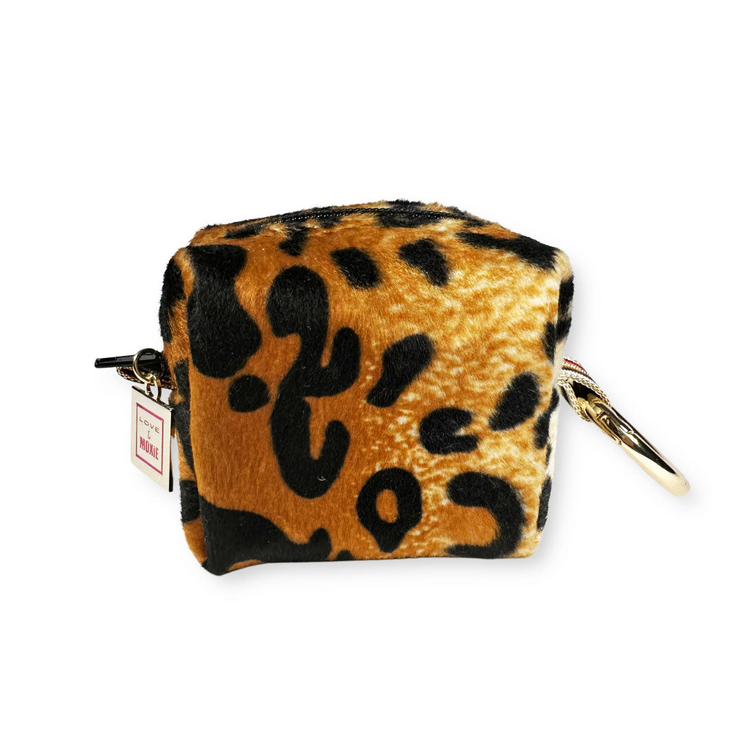 Super cute and very practical, the Sloane mini mini clip-on bag will steal your heart! Handcrafted of fuzzy leopard on the outside and navy blue waterproof canvas on the inside, Sloane is as good looking as she is functional. Her impeccable detailing from her double row top stitching to her gold hardware will make you scream, "yaaas!". Perfect clipped to your purse or belt loop for easy access to your hand sanitizer, lip balm, change, contact lenses, earbuds, or anything you need to get your hands on quickly.