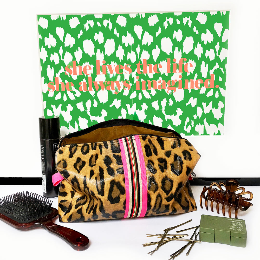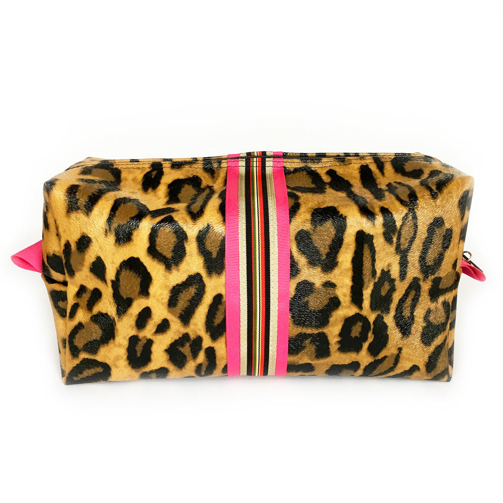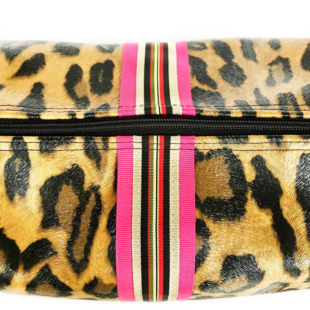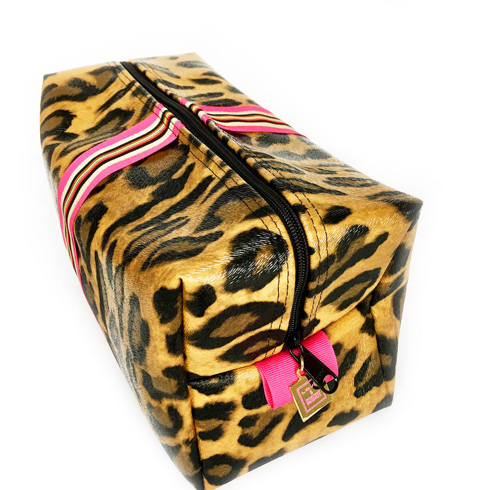 Meet the Sloane biggi bag where form meets function. Whether traveling for business or pleasure, you'll do it in style with Sloane's textured leopard vegan leather (the new neutral) and preppy striped detailing. Her boxy design ensures she'll accommodate all your travel needs and her generous side tabs, large opening and long zipper pull make it easy to get to your stuff even when jet lag is at its worst. The Sloane's thoughtful details continue on the inside with her wipe-clean vegan leather lining for those inevitable product leaks, to her re-enforced seams, ensuring Sloane will retain her good looks trip after trip. Meow!
