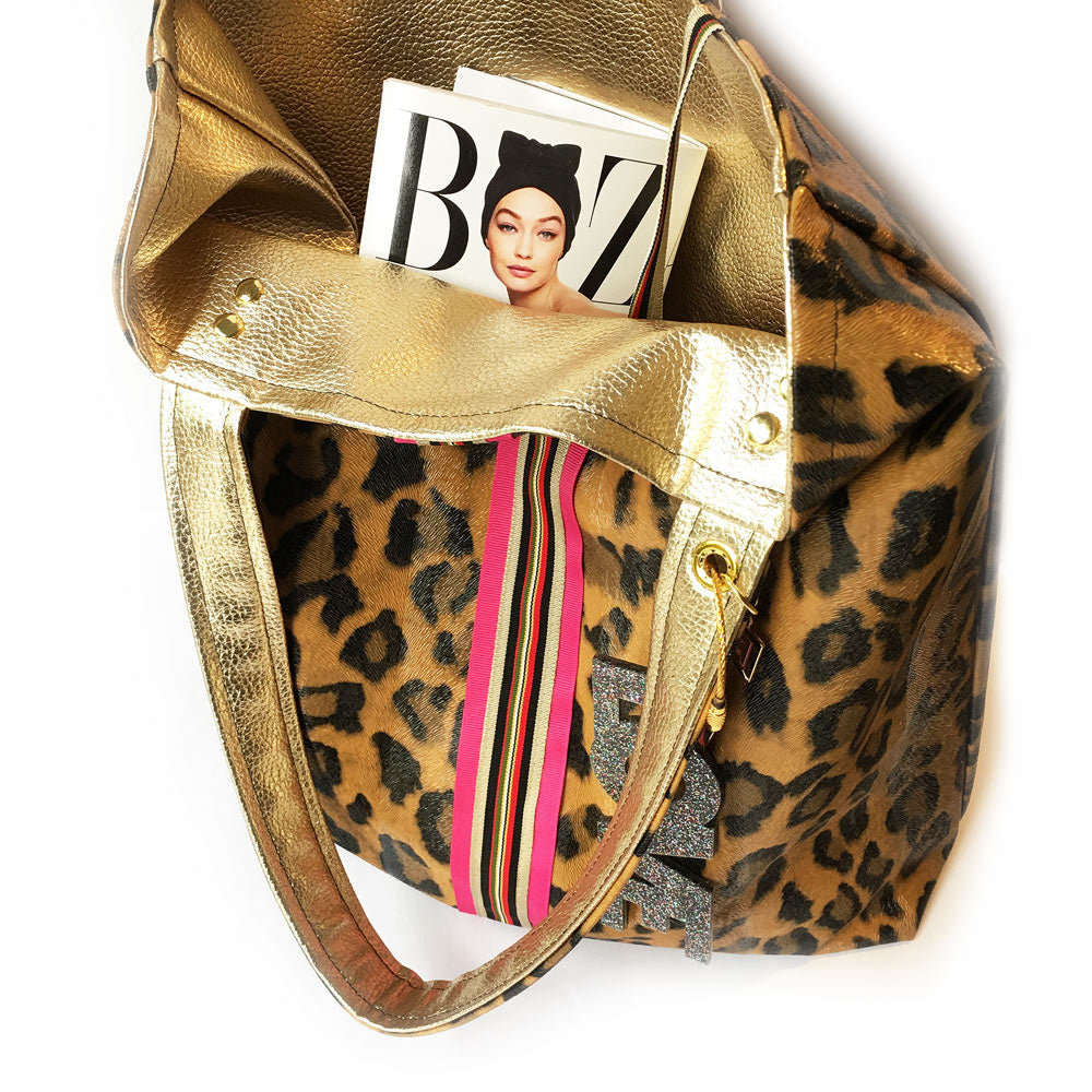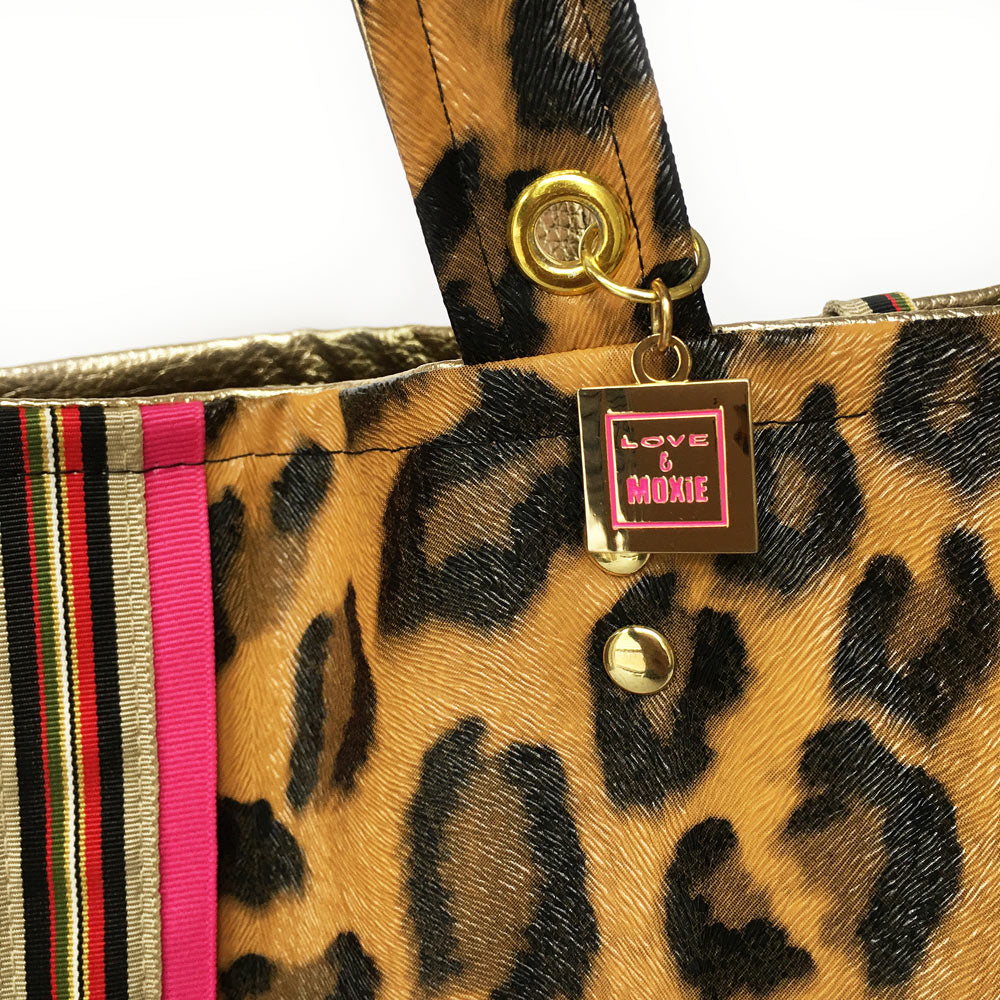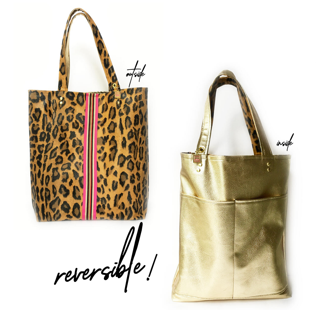 Say hello to your new versatile friend, Sloane - the purrrfect hold everything tote bag. Sloane is two posh bags in one (because you like options) with textured leopard vegan leather on one side and bright gold vegan leather on the other. Her lux details continue with her sporty stripe detailing, two deep pockets, grommet for our fun bag charms or a monogram, and integrated key clip so no more fumbling at the bottom of your bag! Who says functional can't be fabulous!