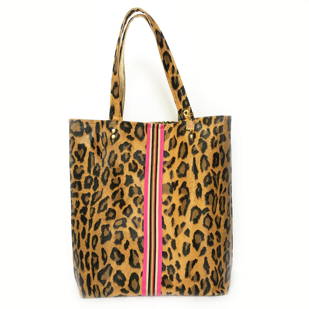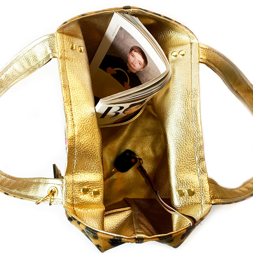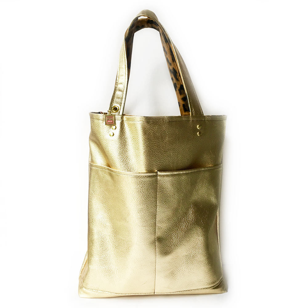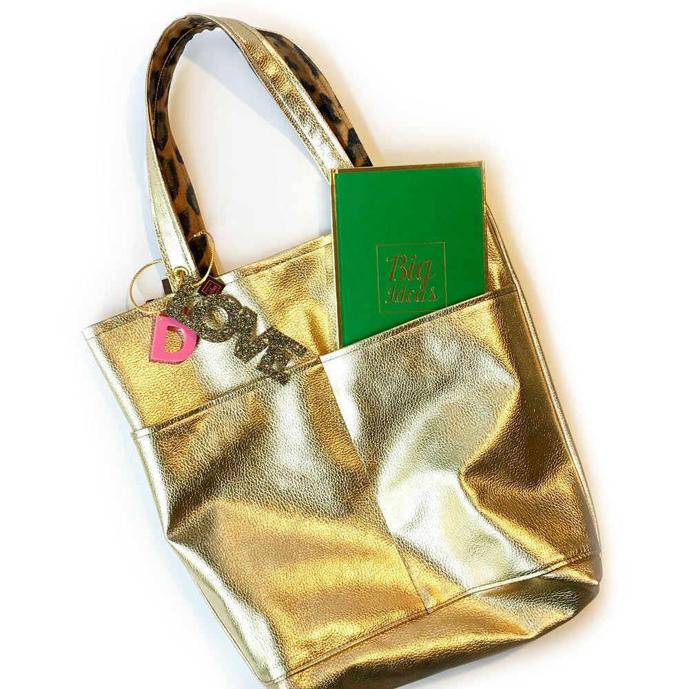 Say hello to your new versatile friend, Sloane - the purrrfect hold everything tote bag. Sloane is two posh bags in one (because you like options) with textured leopard vegan leather on one side and bright gold vegan leather on the other. Her lux details continue with her sporty stripe detailing, two deep pockets, grommet for our fun bag charms or a monogram, and integrated key clip so no more fumbling at the bottom of your bag! Who says functional can't be fabulous!