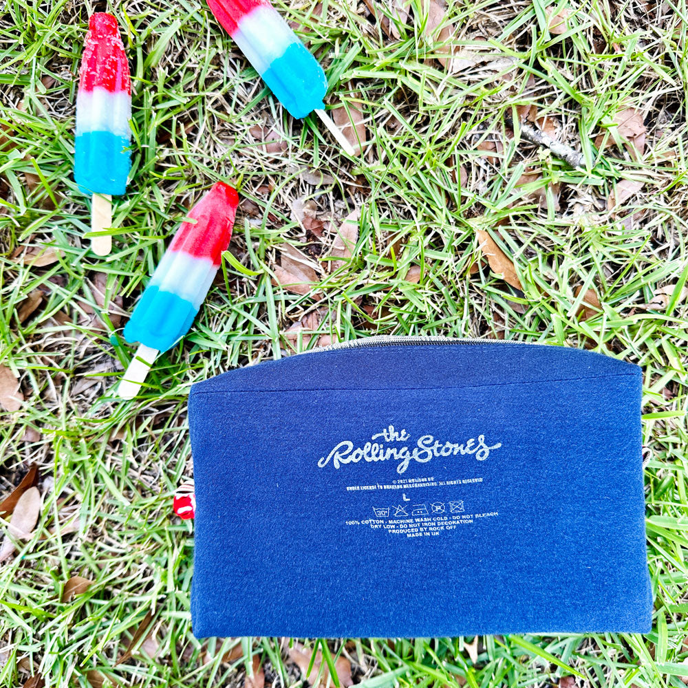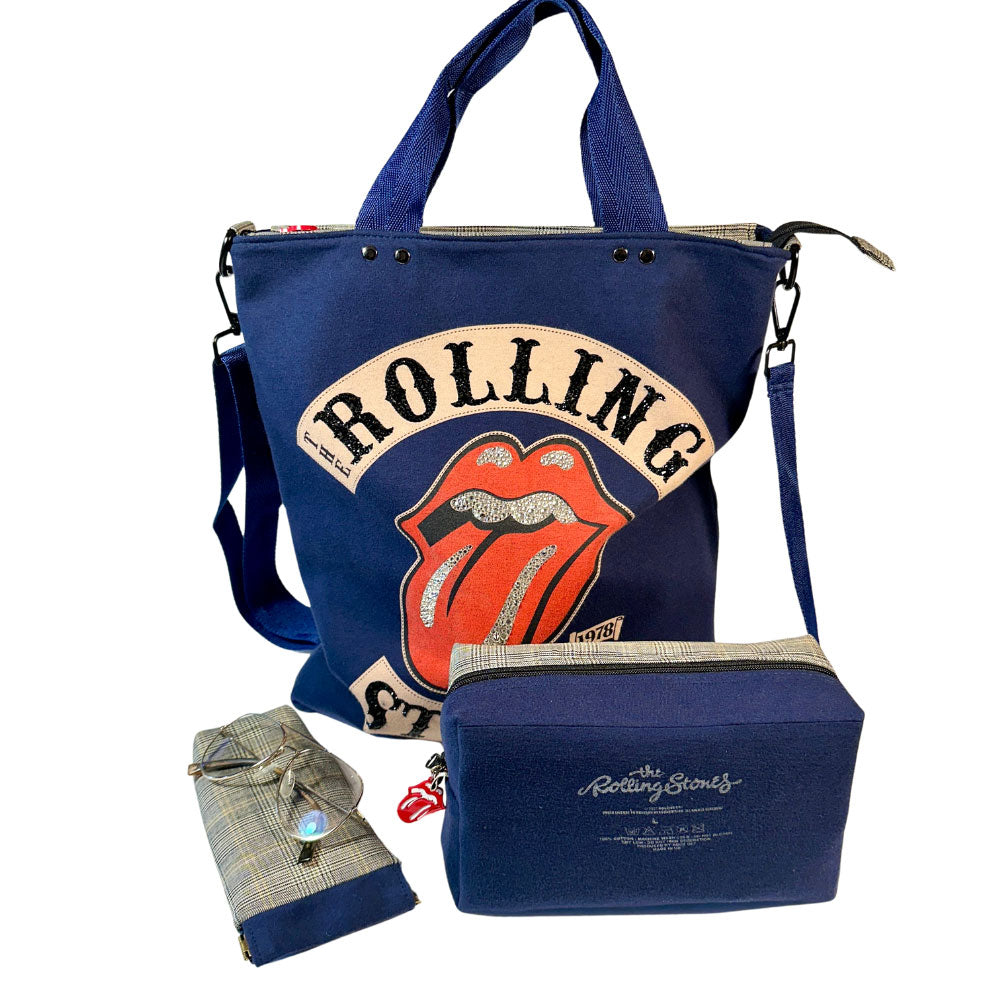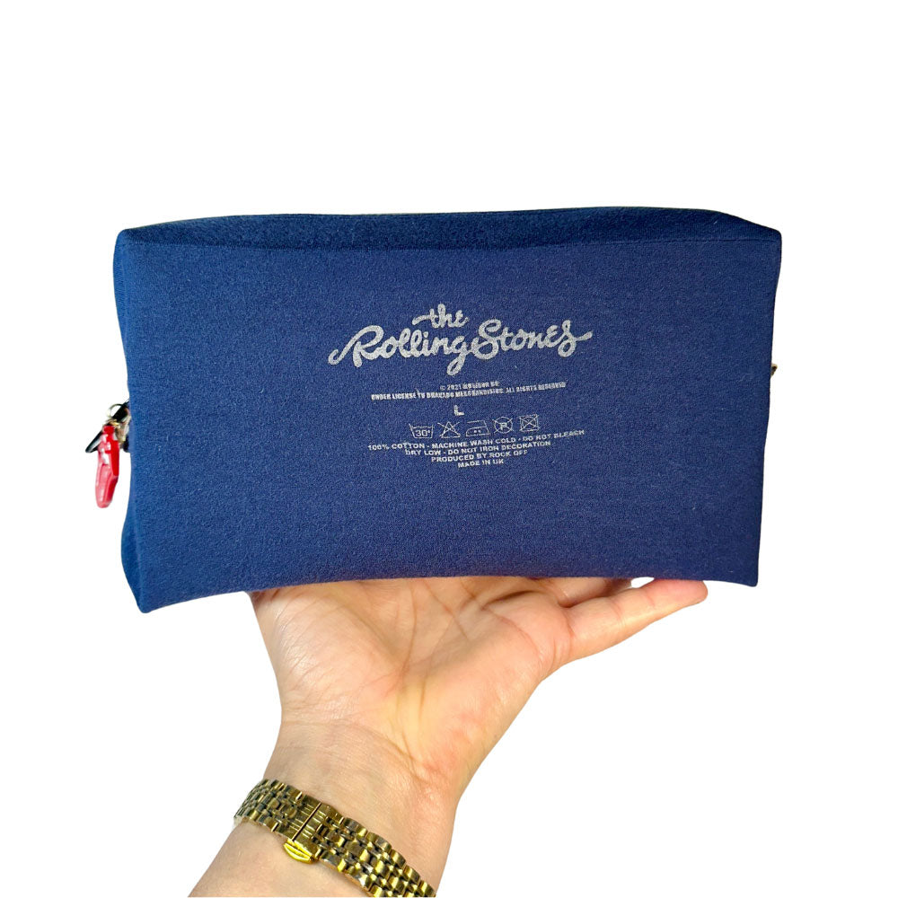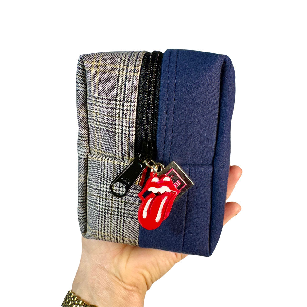 Meet Virginia, your snazzy new bestie perfect for corralling all your on-the-go goods. Her fabulously functional size makes her perfect for organizing your tech must-haves, toiletries, make-up, and more. In oh-so typical LOVE & MOXiE fashion, she is made from 100% upcycled materials — a Rolling Stones tee and a Brooks Brothers suit. Even better, Virginia is lined with a wipe-clean, waterproof canvas, which means no more trips on the hot mess express or grimy bottoms when your blush pops open or your contact solution takes a spill.