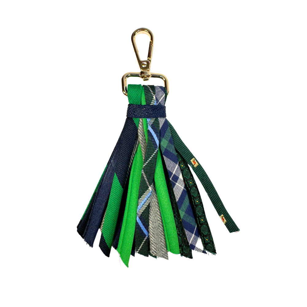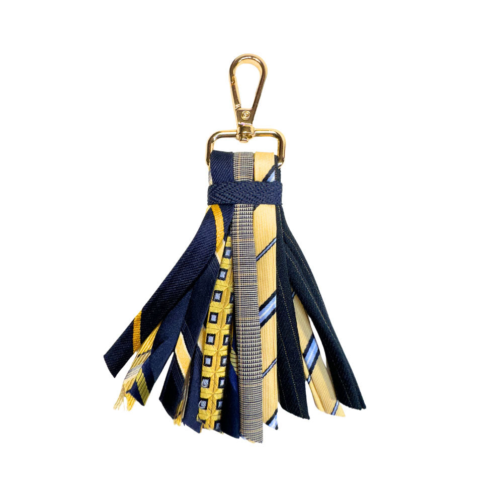 Add a little swag to your bag with this fun tassel charm and make an old bag new again! Meticulously handcrafted from neckties, suiting, and button-up shirts, each strip is sewn, turned, and ironed for a crisp and finished edge, and then sewn together and banded for durability. The ends are left to fray as it ages for that vintage loved look. Each features a gold colored lobster clasp to finish the look. Truly one-of-a-kind charm for your favorite bag.