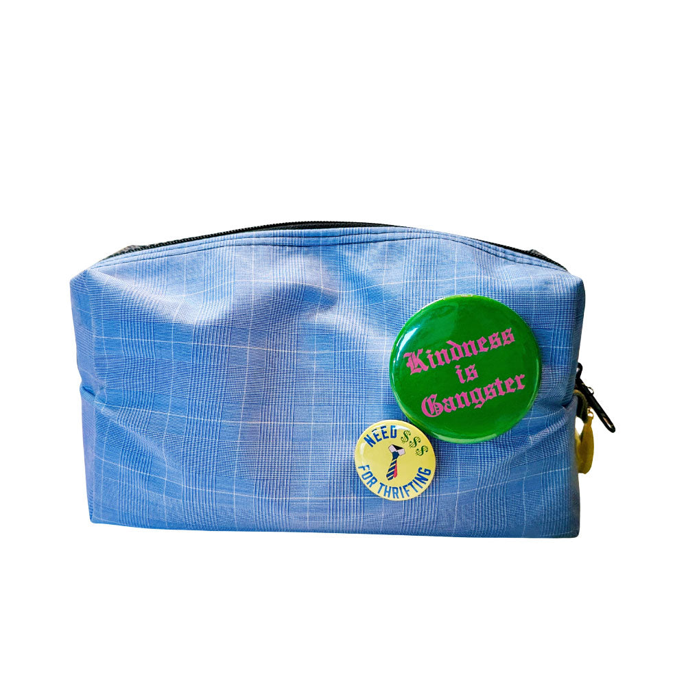 Meet Winston, your snazzy new bestie perfect for corralling all your on-the-go goods. Her fabulously functional size makes her perfect for organizing your tech must-haves, toiletries, make-up, and more. In oh-so typical LOVE & MOXiE fashion, she is made from 100% upcycled materials — a subtle plaid button-up shirt and a vintage herringbone suit jacket. Even better, Winston is lined with a wipe-clean, waterproof canvas, which means no more trips on the hot mess express or grimy bottoms when your blush pops open or your contact solution takes a spill.
